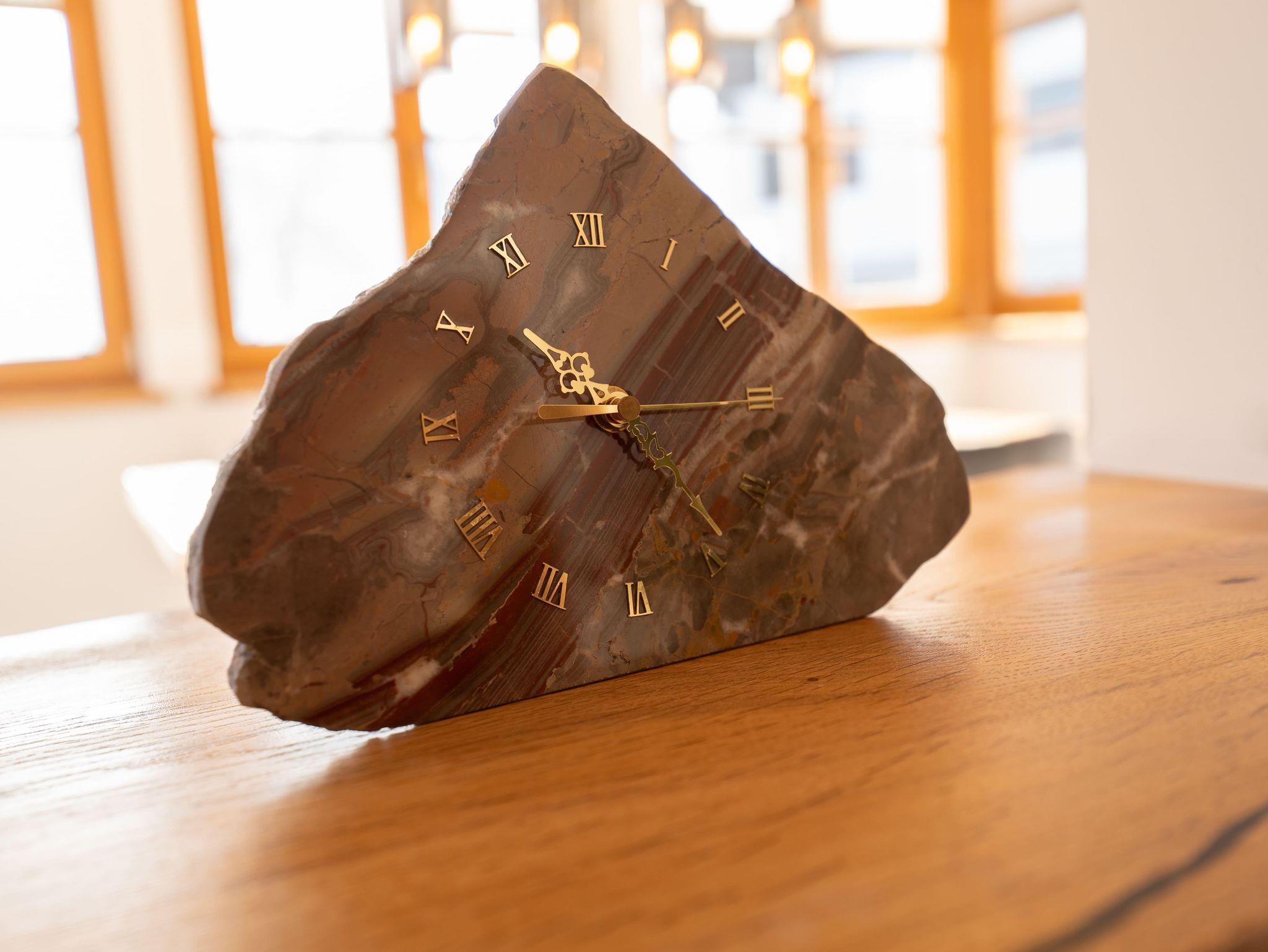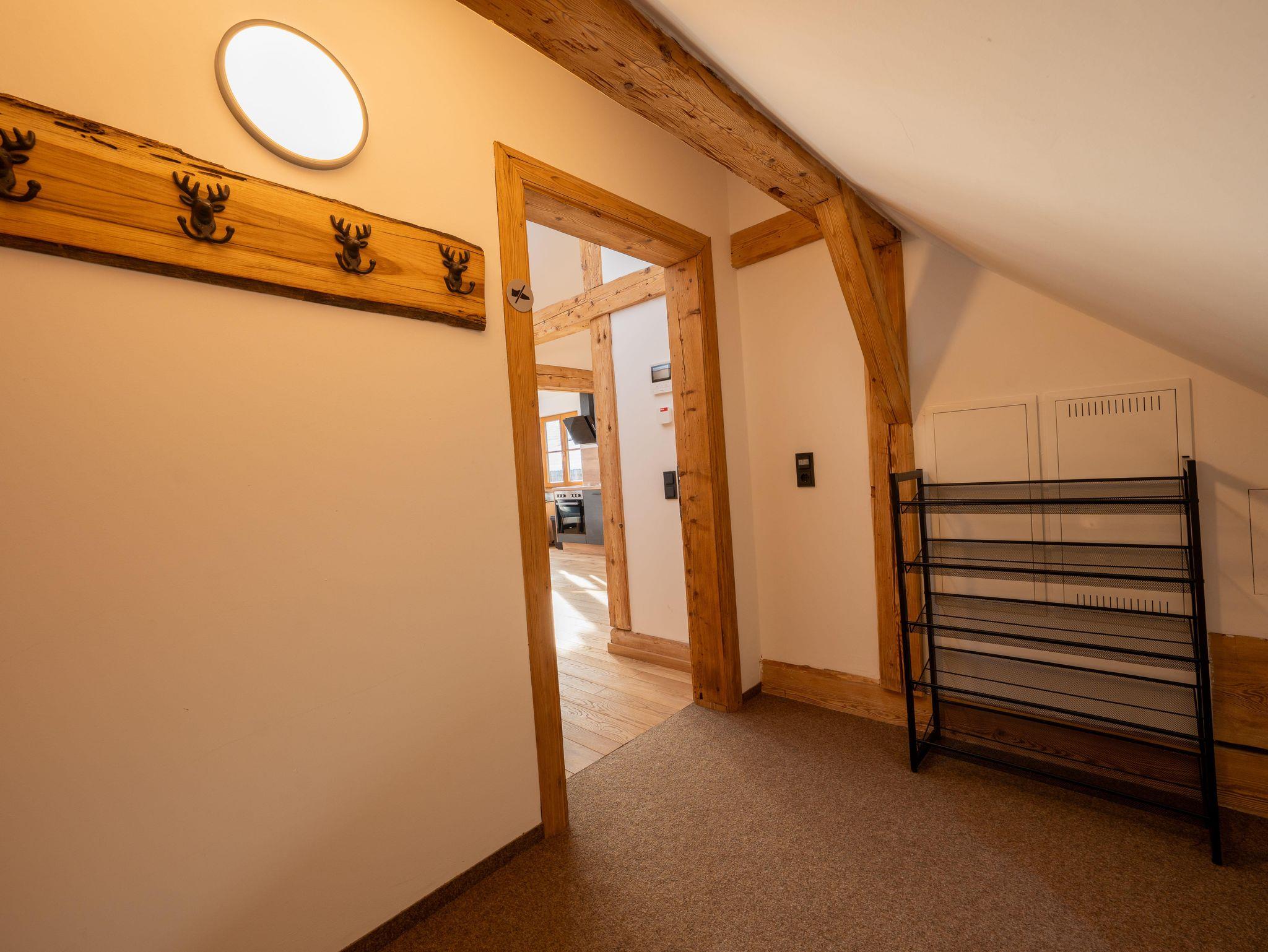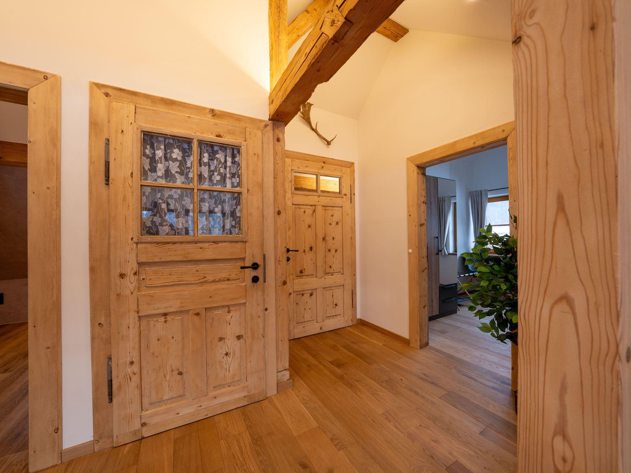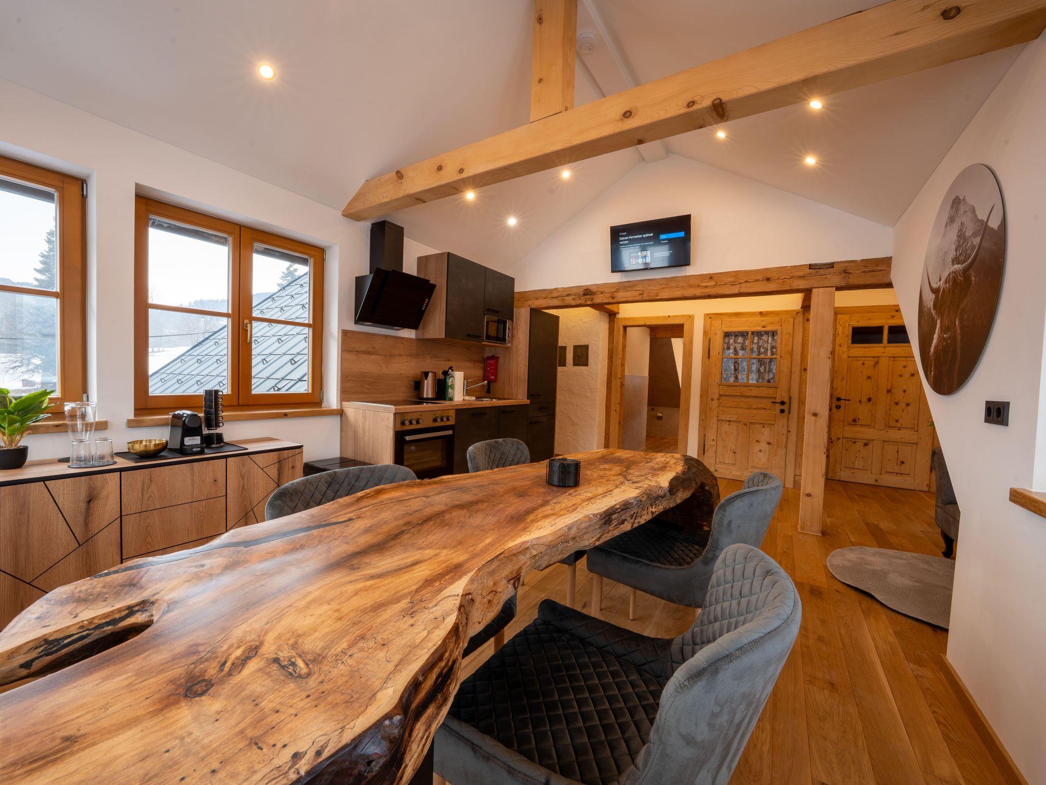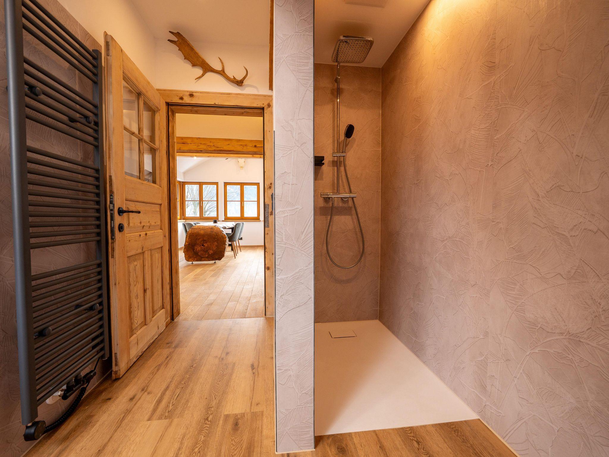 Charaktervolle Holzelemente schaffen eine warme Atmosphäre: Das Zirbendoppelbett sorgt für erholsamen Schlaf, und der handgefertigte Eichen-Esstisch lädt zu geselligen Momenten ein. Im Badezimmer setzt eine restaurierte Werkbank aus dem Jahr 1920 mit modernen Steinbecken einen besonderen Akzent.