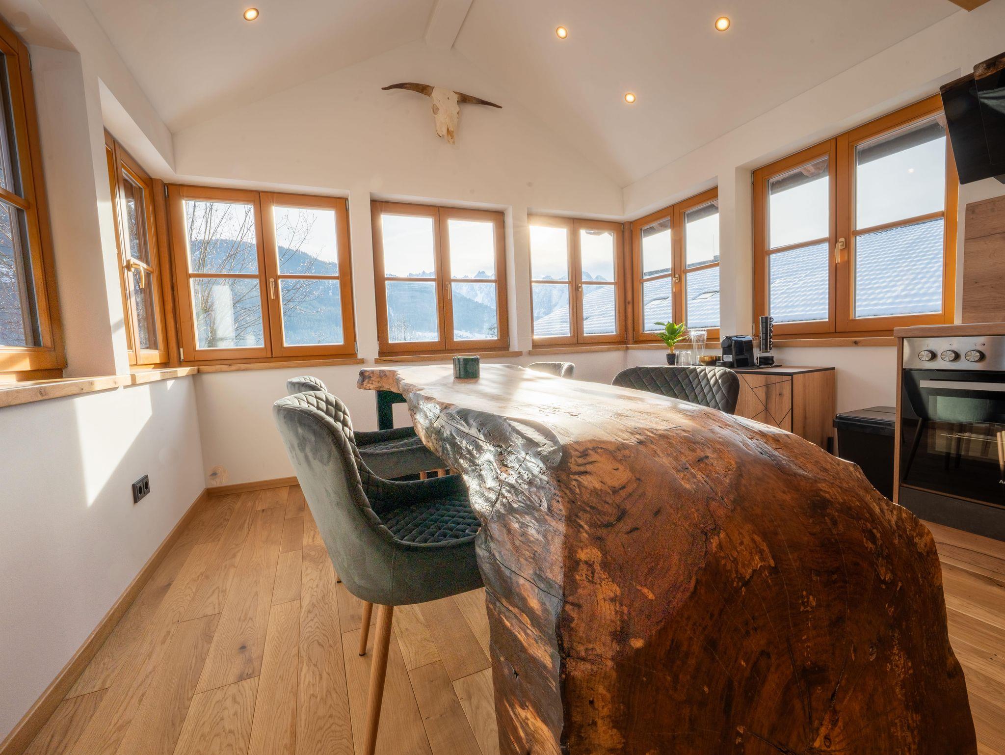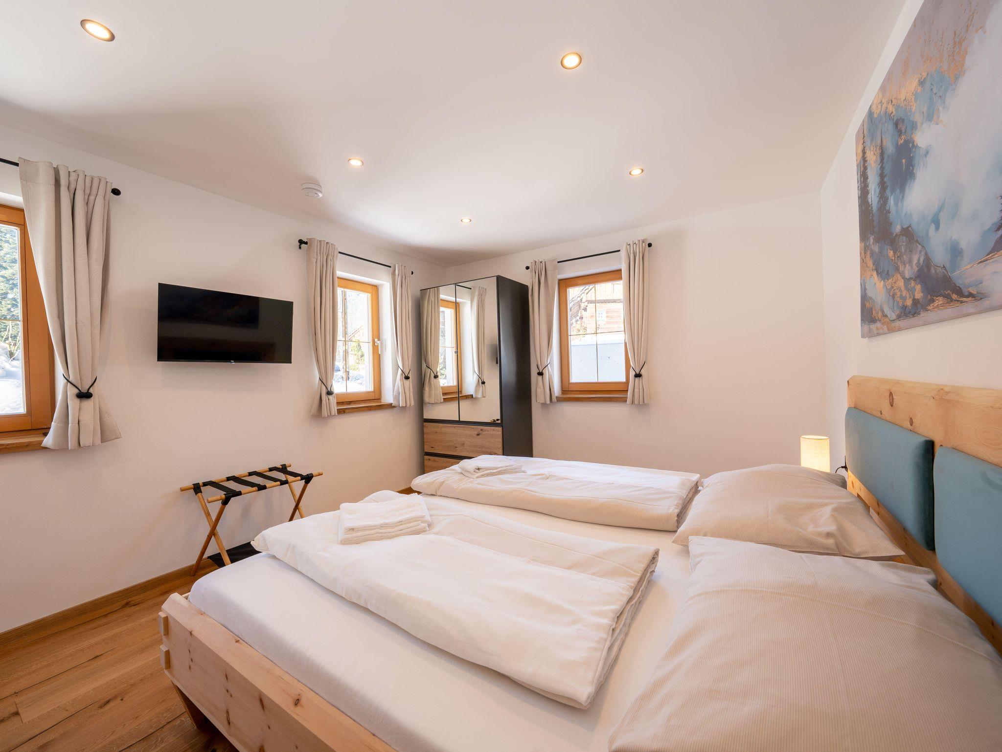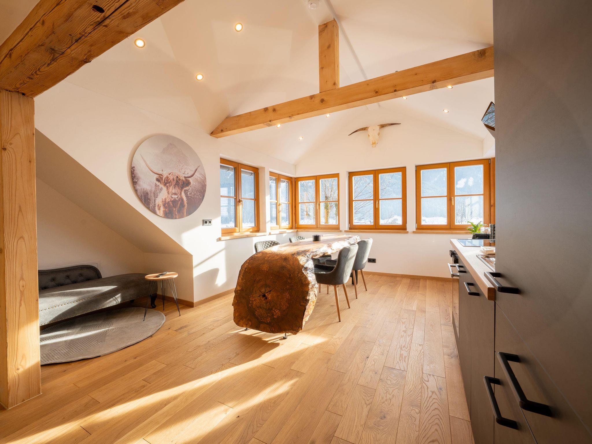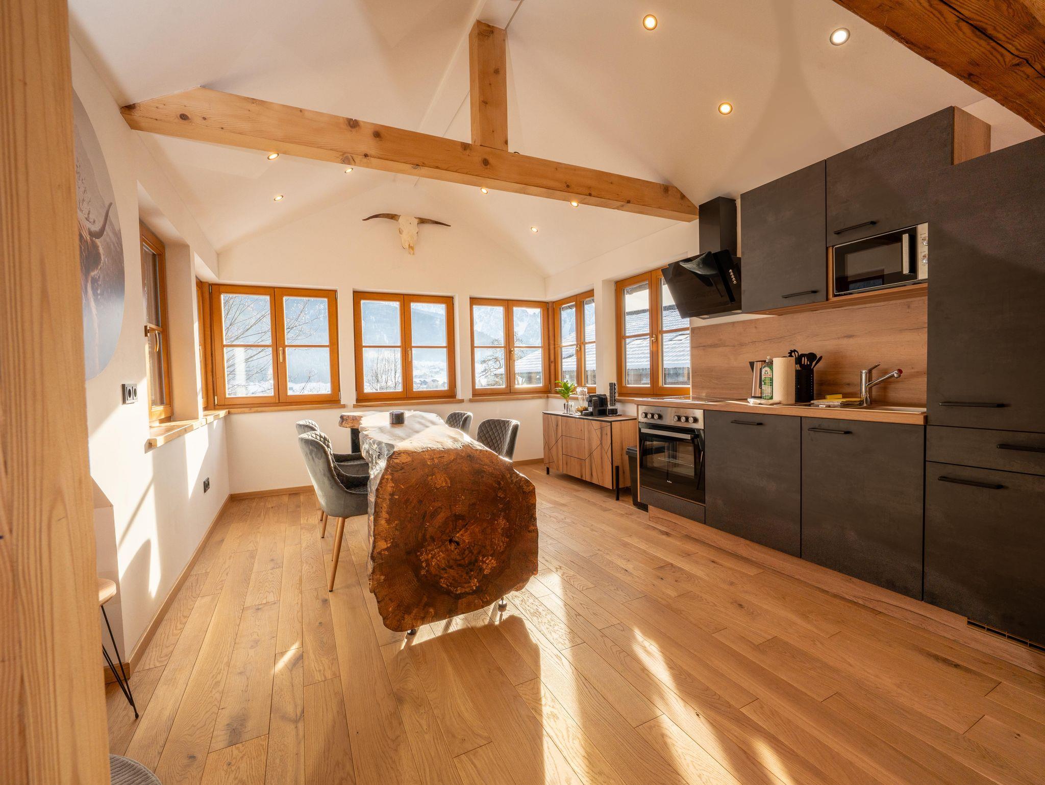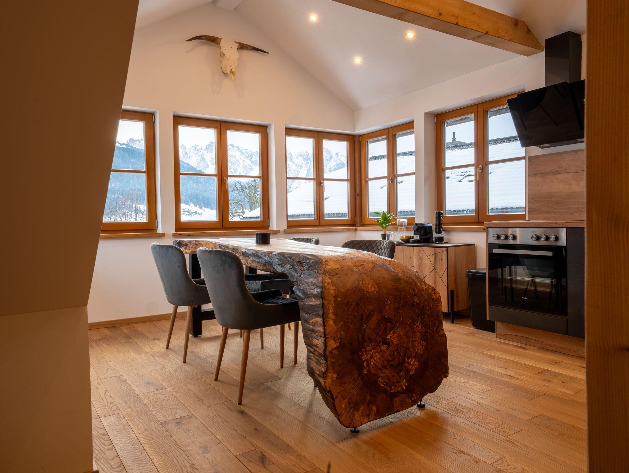 Die frisch renovierte Gosaukamm Suite verbindet modernes Design mit alpinem Flair. Auf 71 m² bietet sie Platz für bis zu 4 Personen in zwei Schlafzimmern mit Doppelbetten. Die Suite verfügt über ein voll ausgestattetes Badezimmer mit Dusche und Badewanne, eine moderne Küche sowie ein gemütliches Wohn- und Esszimmer. Sie bietet einen herrlichen Blick auf Berge, Wald und Wiesen sowie Zugang zum Gemeinschaftsgarten. Fußbodenheizung und ein eigener Skischuhtrockner im Eingangsbereich runden die Ausstattung ab.