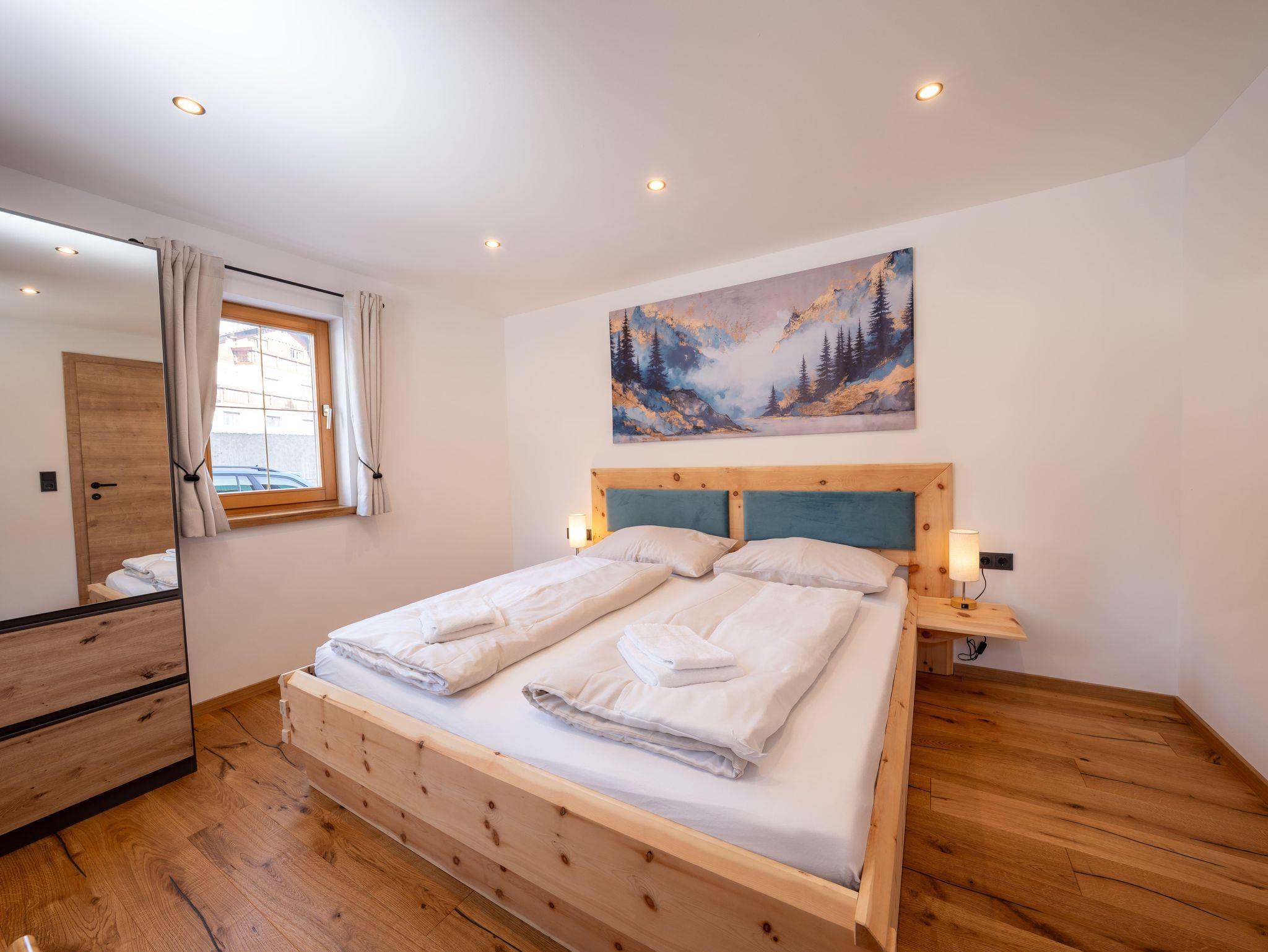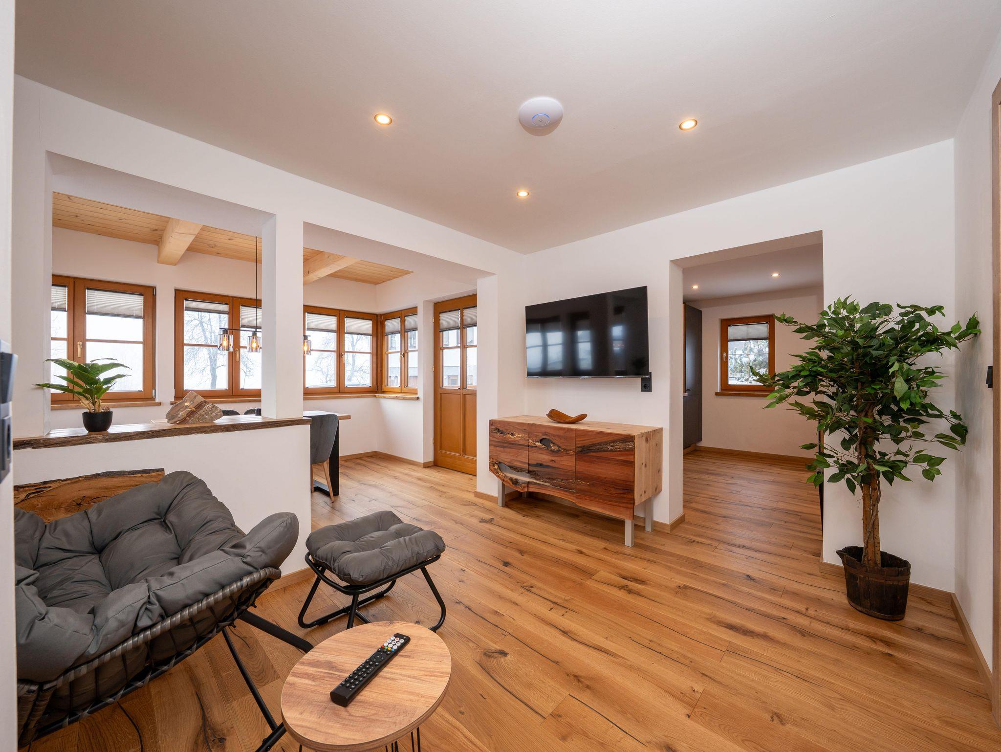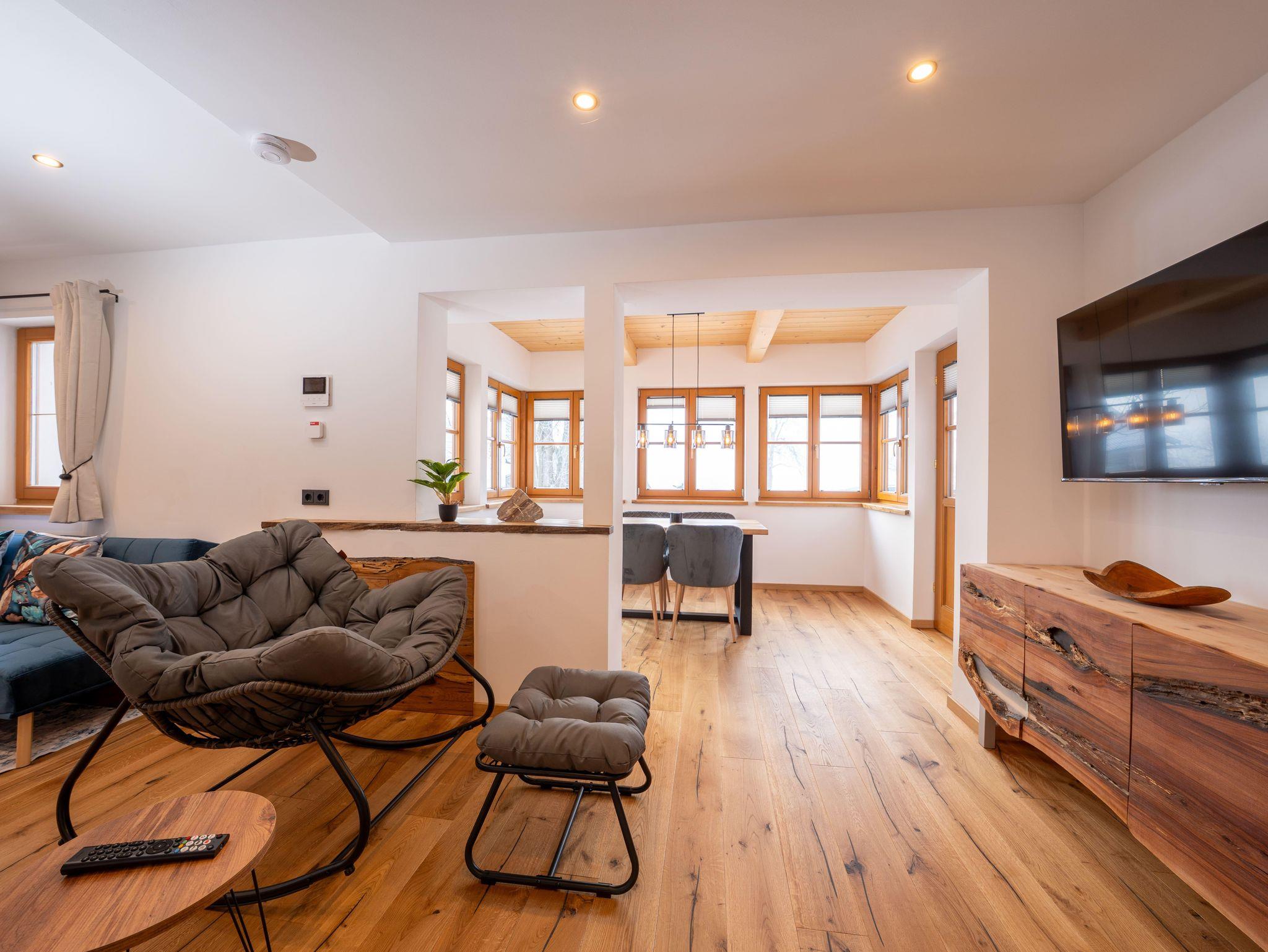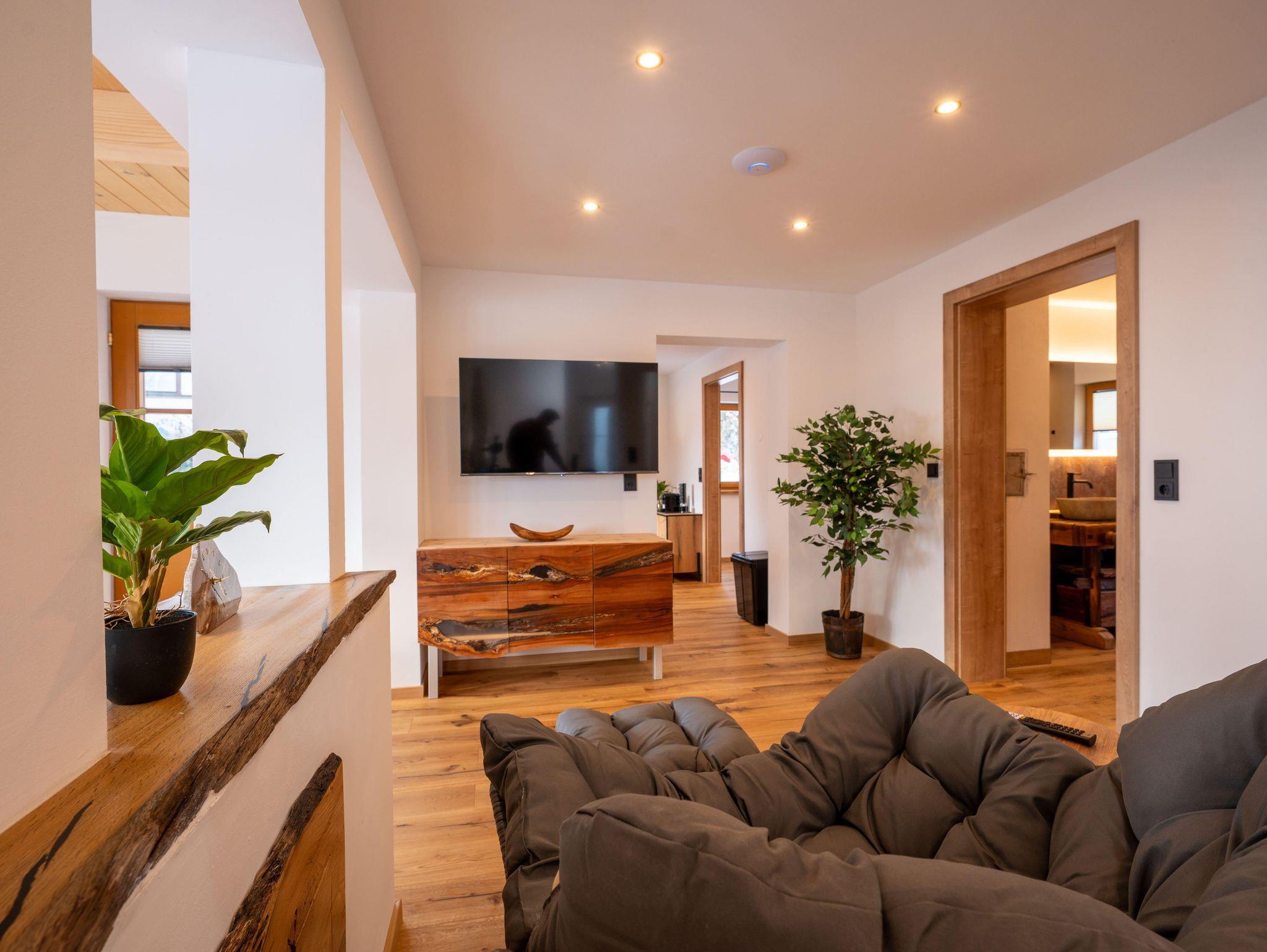 Das frisch renovierte Apartment Holzklang im Erdgeschoss verbindet modernes Design mit alpinem Flair. Auf 64 m² bietet es Platz für bis zu 4 Personen. Ein Zirbendoppelbett und ein handgefertigter Eichen-Esstisch sorgen für gemütliches Ambiente. Im Bad setzt eine restaurierte Werkbank von 1920 mit Steinbecken einen besonderen Akzent. Zur Ausstattung gehören Wintergarten, Terrasse mit Gartenzugang, Fußbodenheizung und ein eigener Skischuhtrockner im Eingangsbereich.