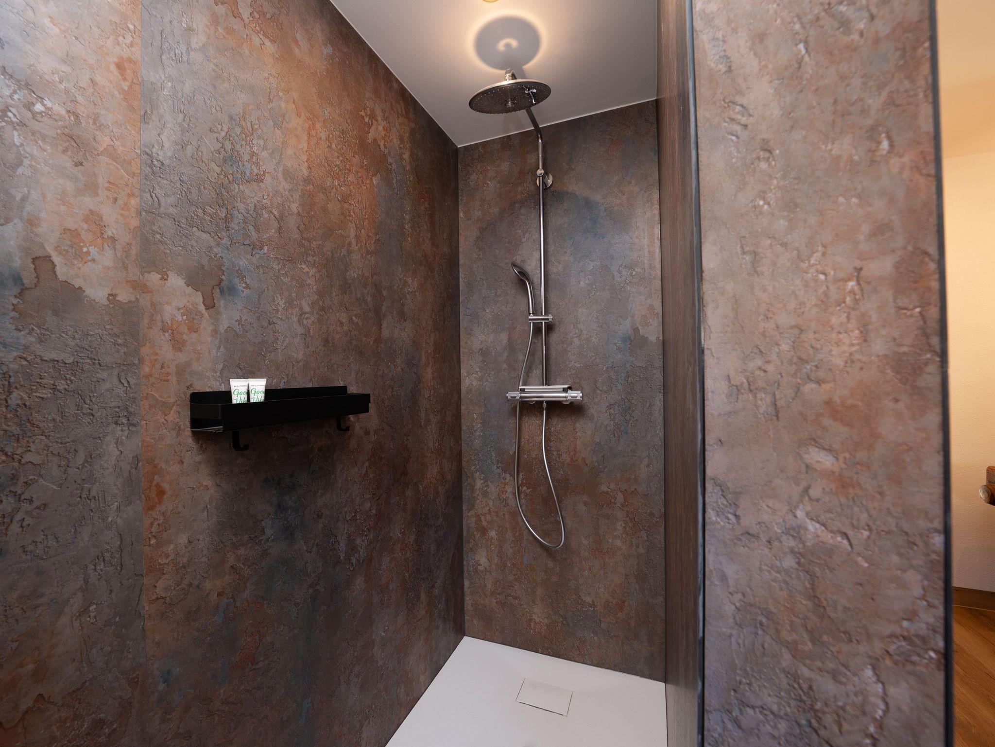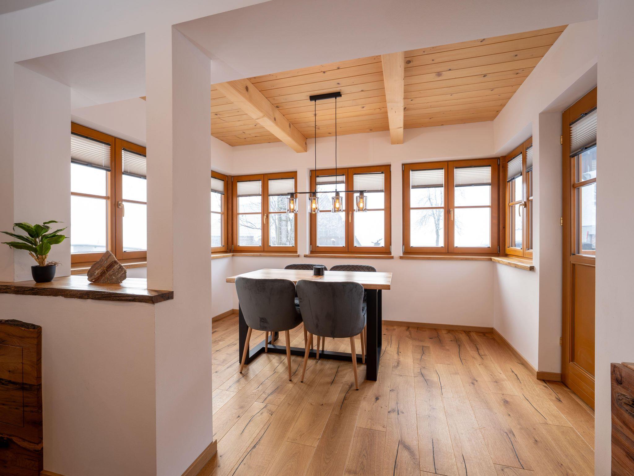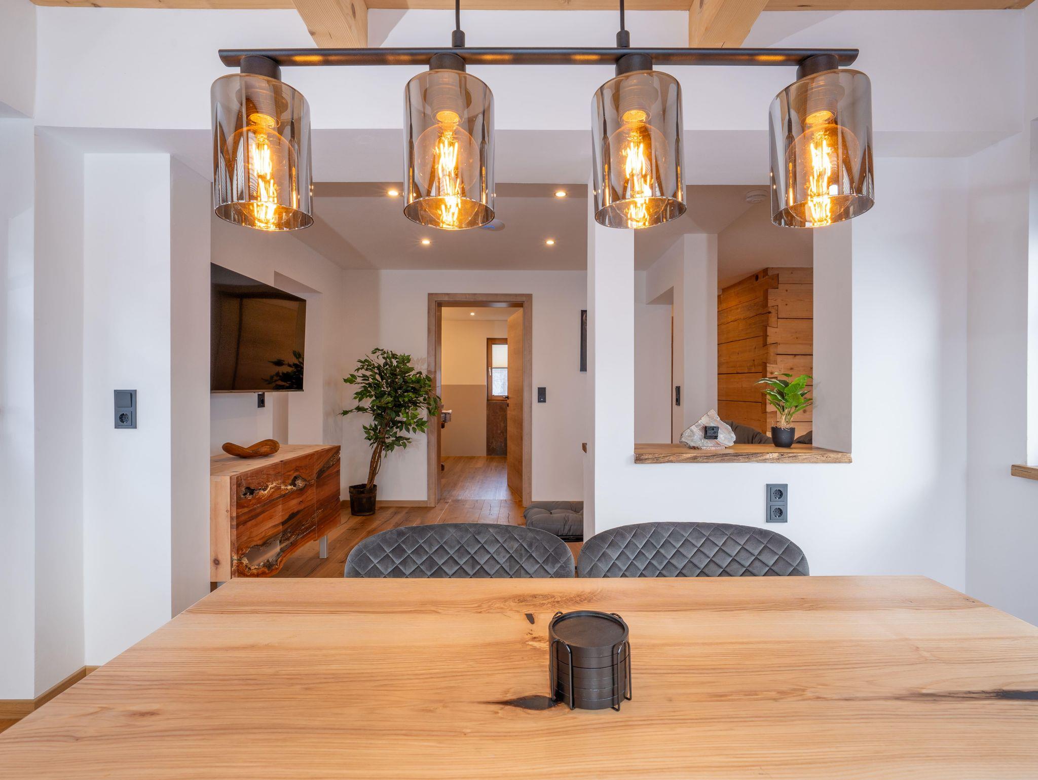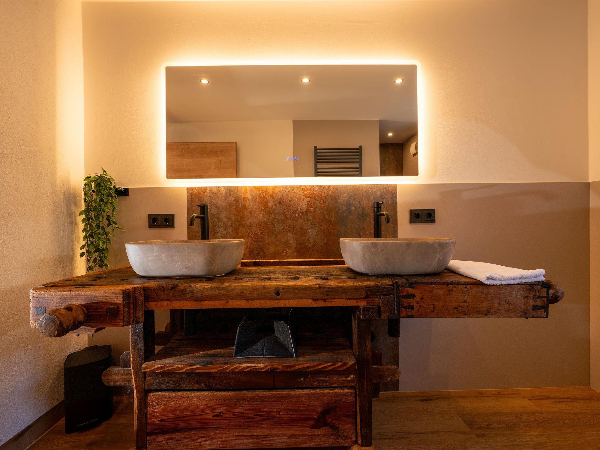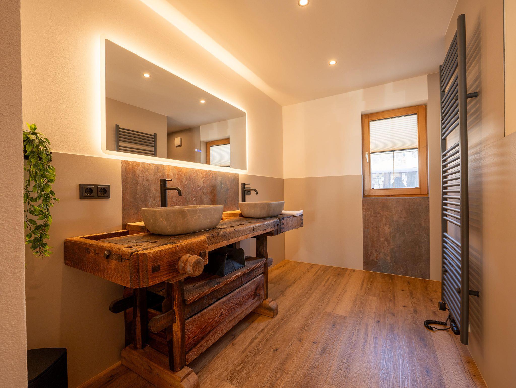 Charaktervolle Holzelemente schaffen eine warme Atmosphäre: Das Zirbendoppelbett sorgt für erholsamen Schlaf, und der handgefertigte Eichen-Esstisch lädt zu geselligen Momenten ein. Im Badezimmer setzt eine restaurierte Werkbank aus dem Jahr 1920 mit modernen Steinbecken einen besonderen Akzent.