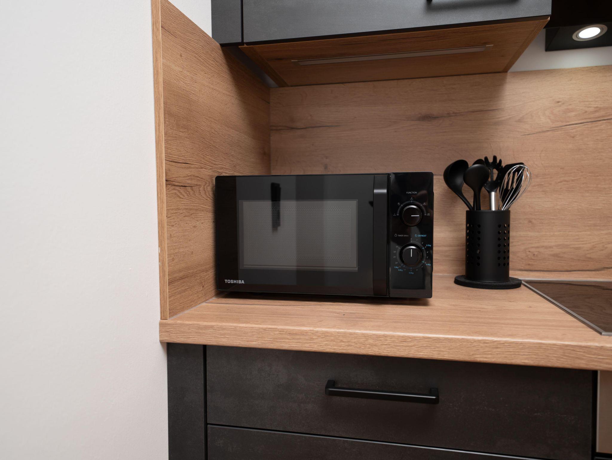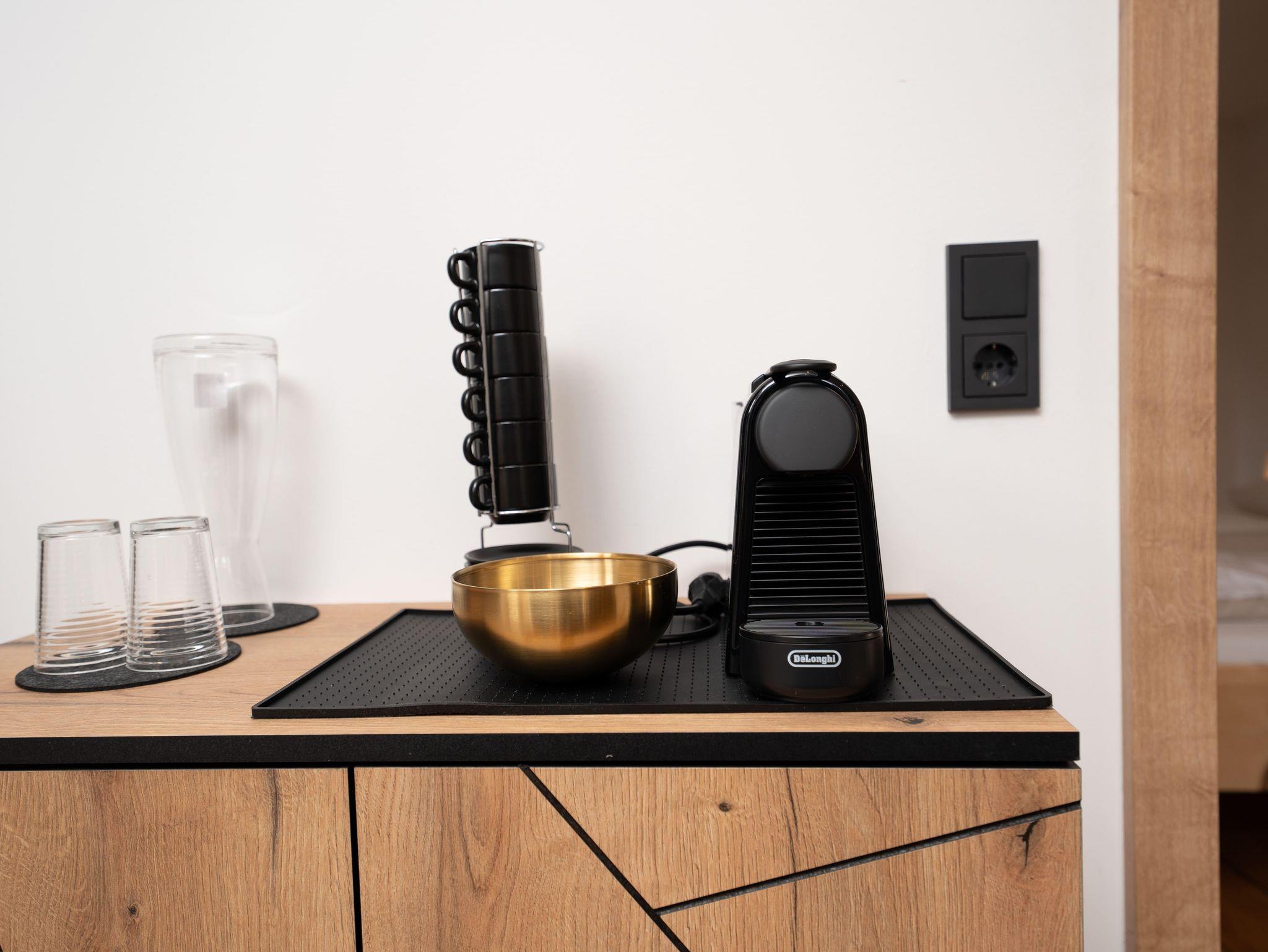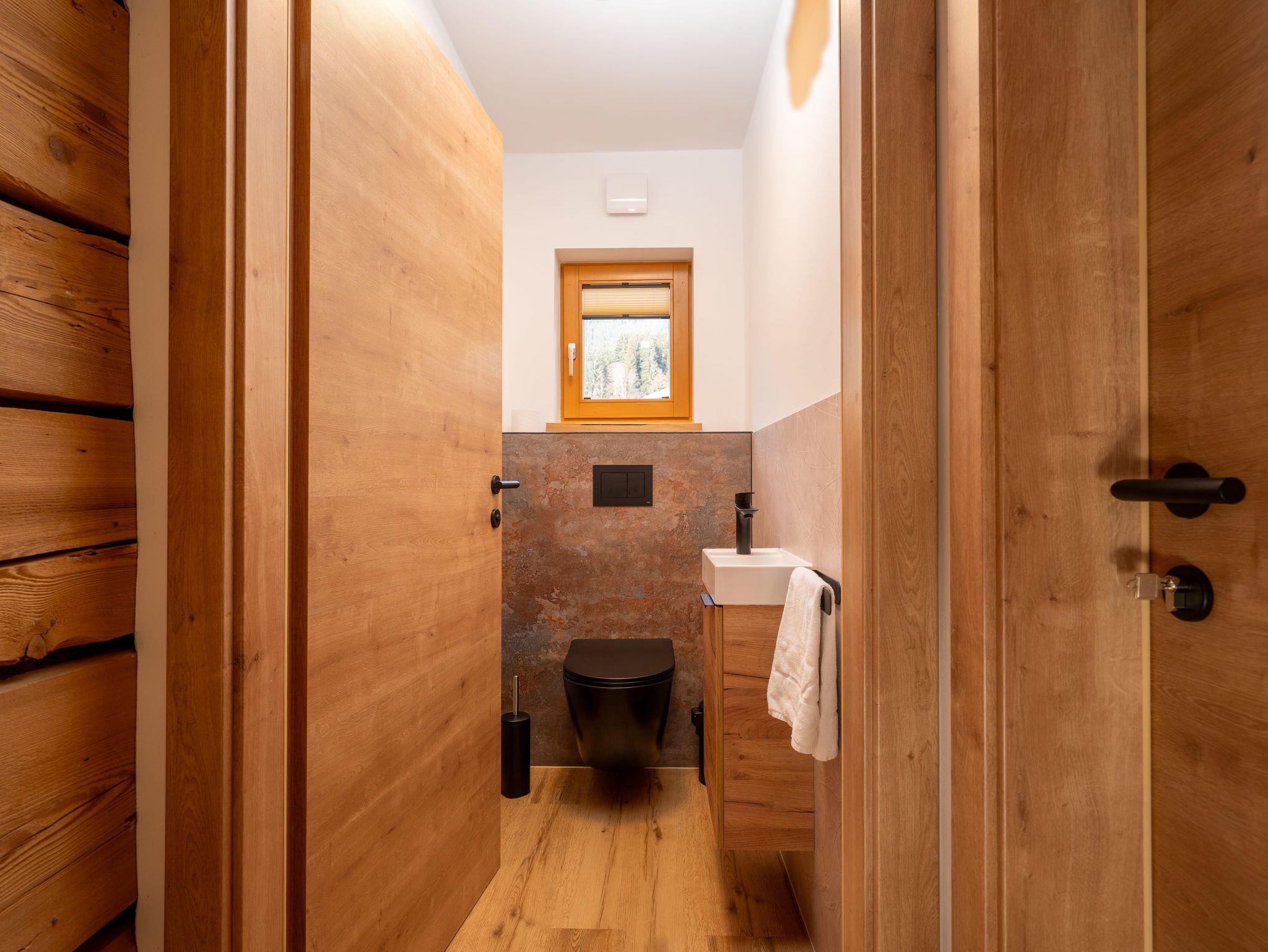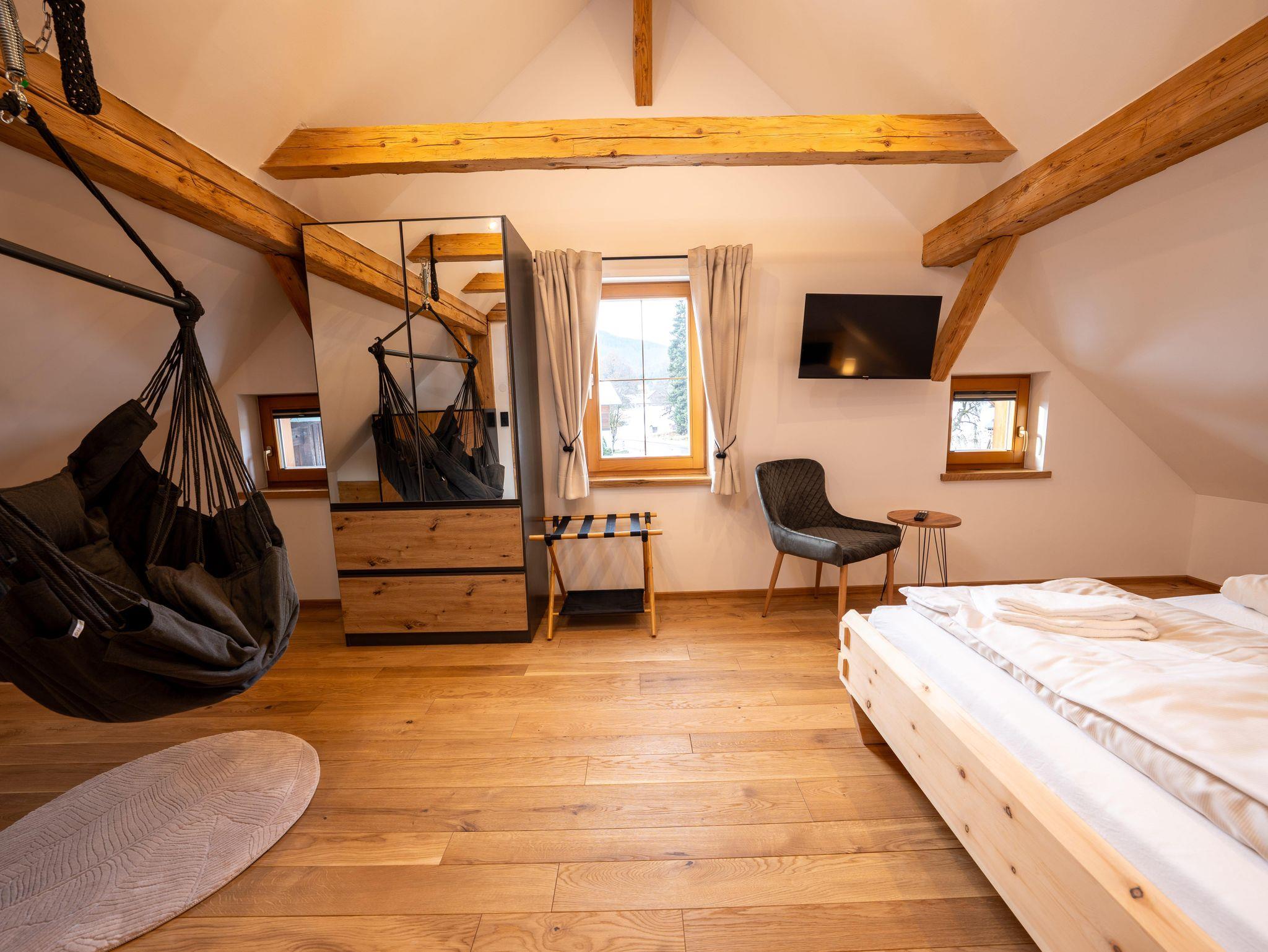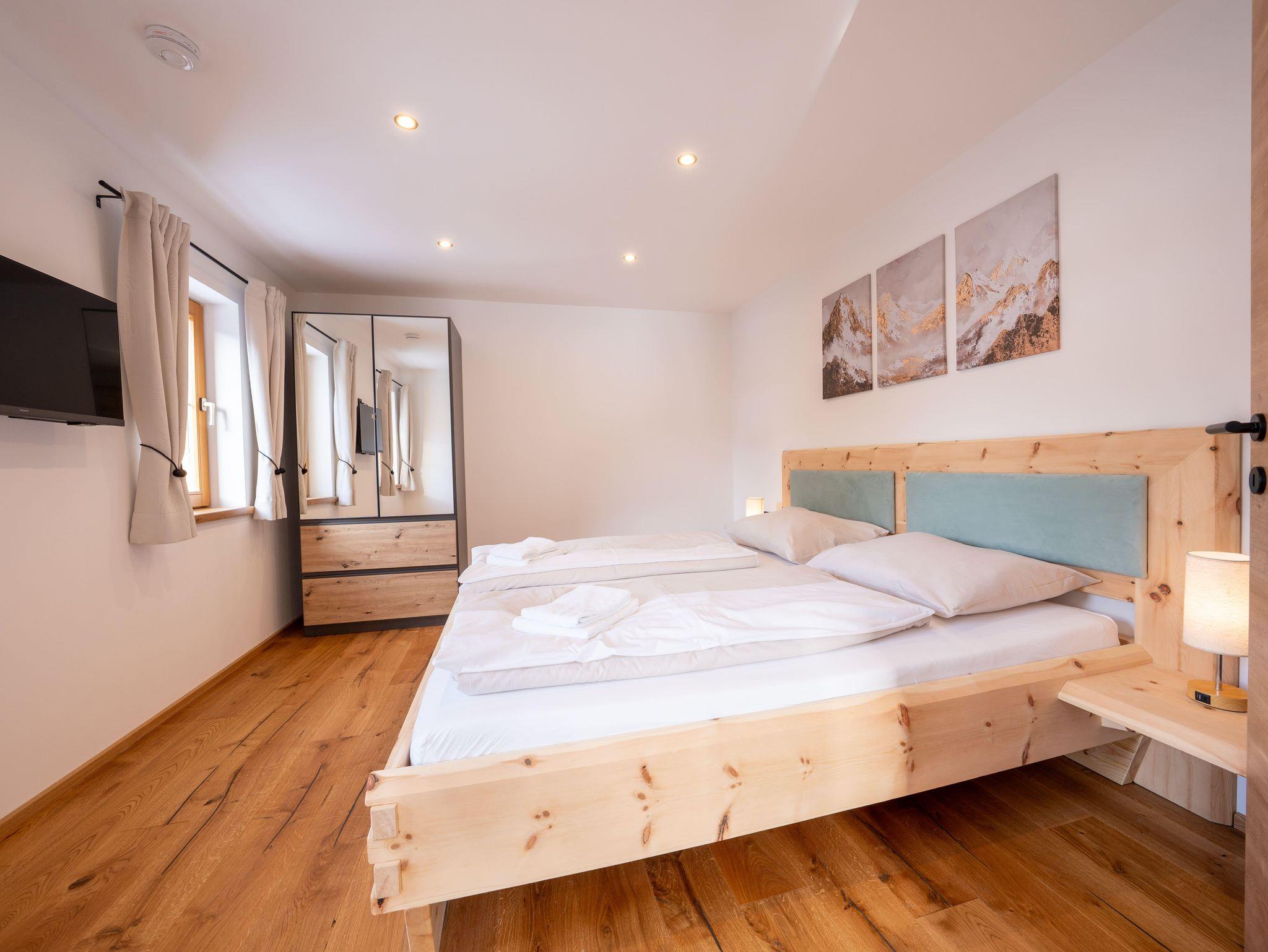 Charaktervolle Holzelemente schaffen eine warme Atmosphäre: Das Zirbendoppelbett sorgt für erholsamen Schlaf, und der handgefertigte Eichen-Esstisch lädt zu geselligen Momenten ein. Im Badezimmer setzt eine restaurierte Werkbank aus dem Jahr 1920 mit modernen Steinbecken einen besonderen Akzent.