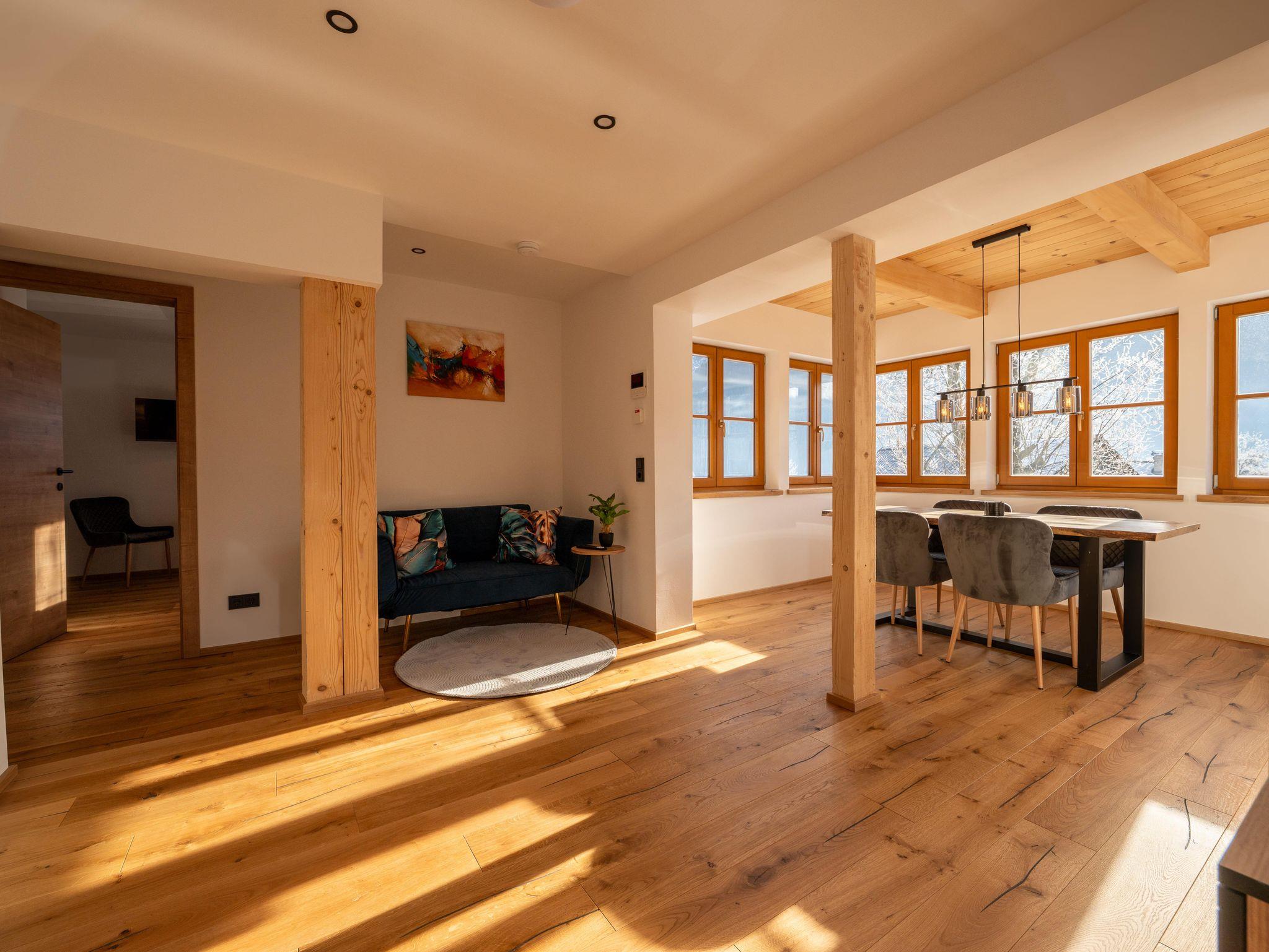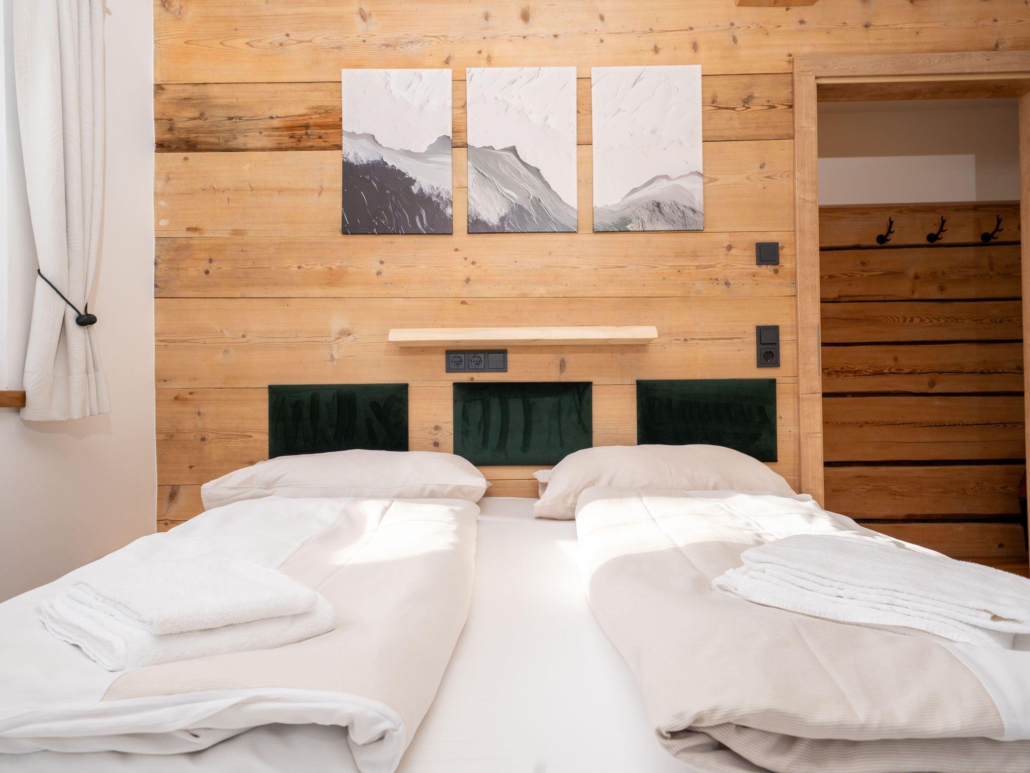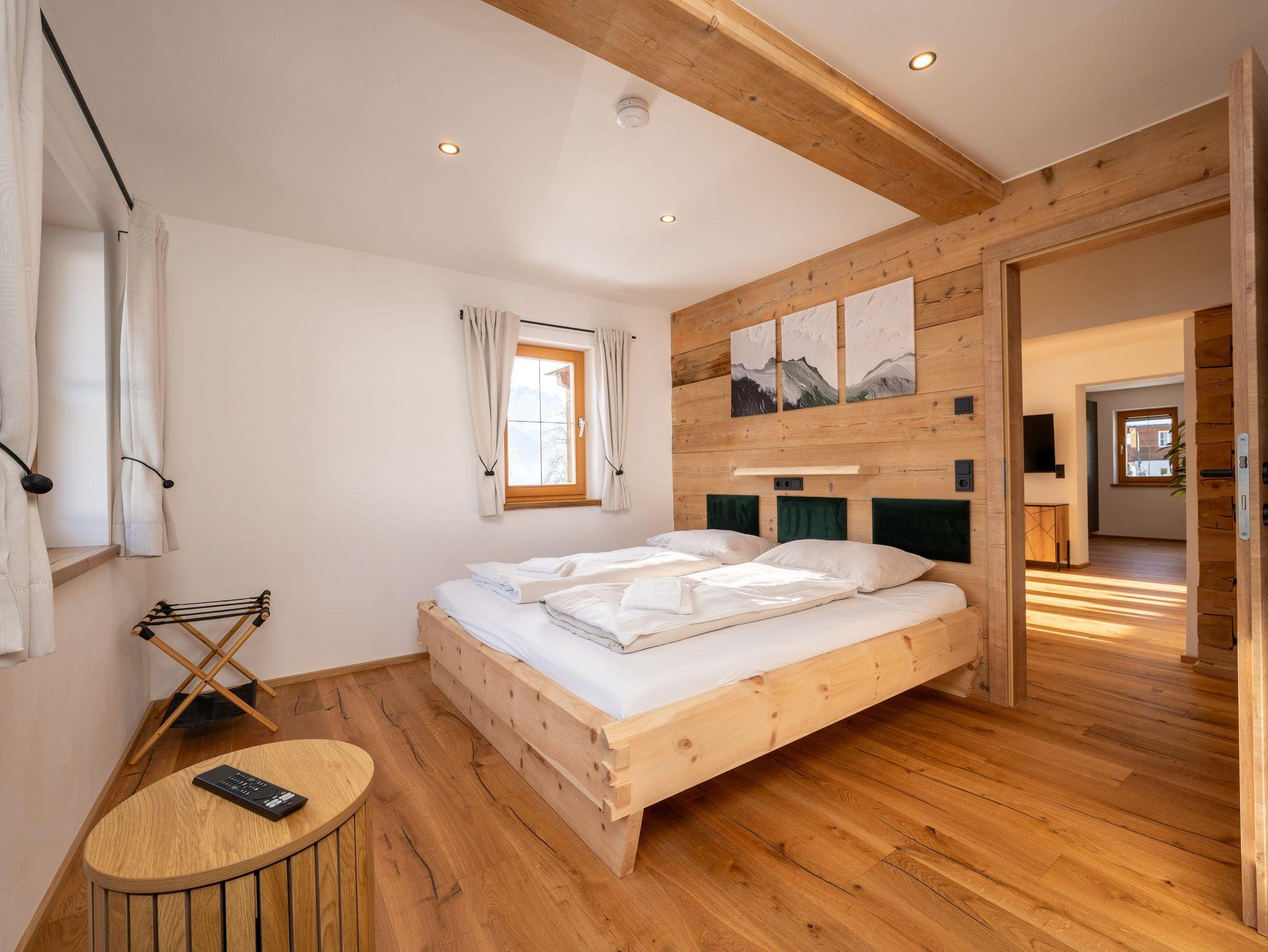 Die frisch renovierte Gosaukamm Suite verbindet modernes Design mit alpinem Flair. Auf 71 m² bietet sie Platz für bis zu 4 Personen in zwei Schlafzimmern mit Doppelbetten. Die Suite verfügt über ein voll ausgestattetes Badezimmer mit Dusche und Badewanne, eine moderne Küche sowie ein gemütliches Wohn- und Esszimmer. Sie bietet einen herrlichen Blick auf Berge, Wald und Wiesen sowie Zugang zum Gemeinschaftsgarten. Fußbodenheizung und ein eigener Skischuhtrockner im Eingangsbereich runden die Ausstattung ab.