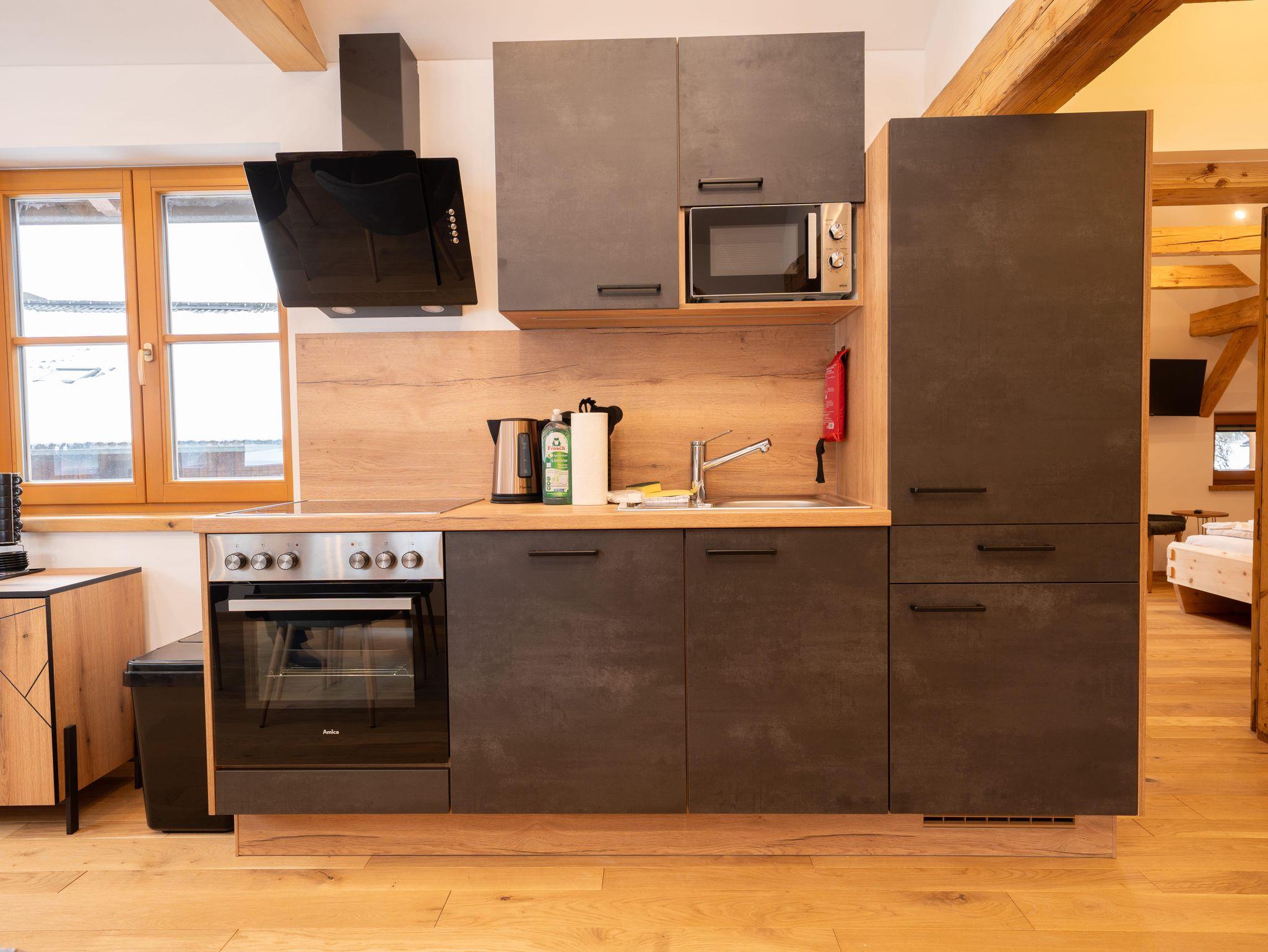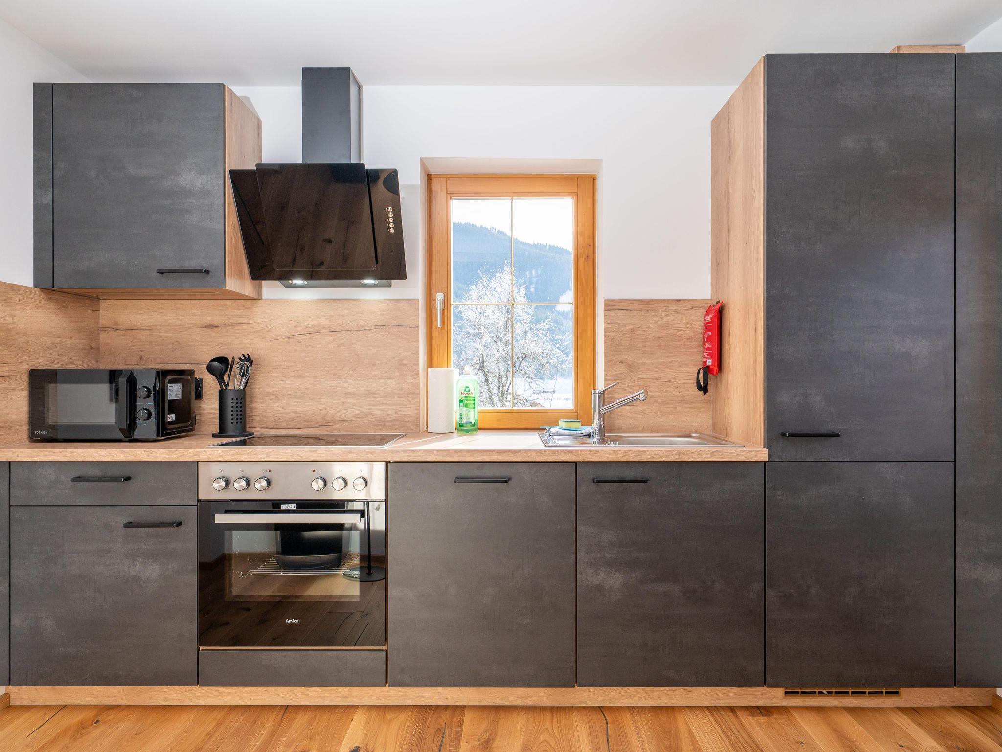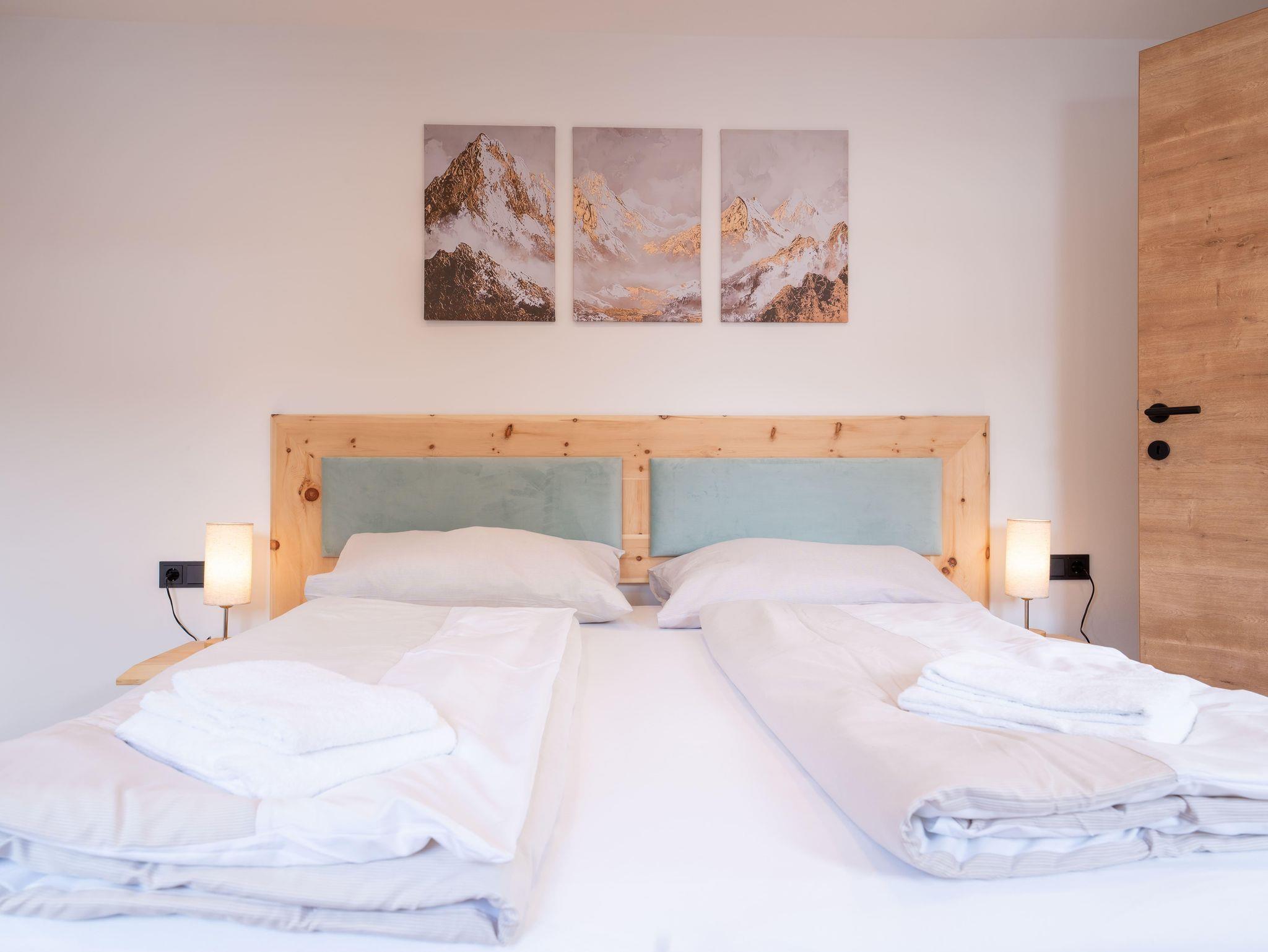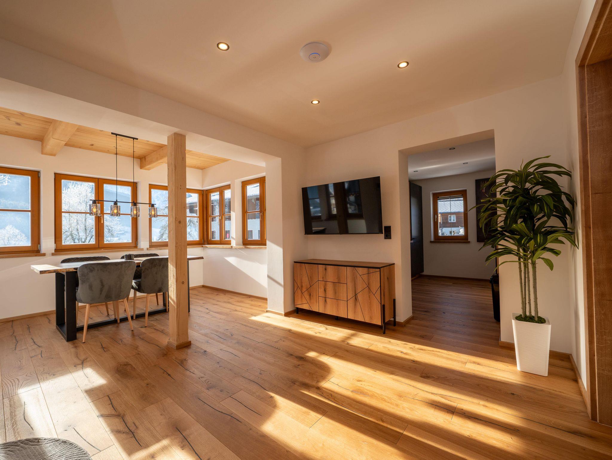 Die frisch renovierte Gosaukamm Suite verbindet modernes Design mit alpinem Flair. Auf 71 m² bietet sie Platz für bis zu 4 Personen in zwei Schlafzimmern mit Doppelbetten. Die Suite verfügt über ein voll ausgestattetes Badezimmer mit Dusche und Badewanne, eine moderne Küche sowie ein gemütliches Wohn- und Esszimmer. Sie bietet einen herrlichen Blick auf Berge, Wald und Wiesen sowie Zugang zum Gemeinschaftsgarten. Fußbodenheizung und ein eigener Skischuhtrockner im Eingangsbereich runden die Ausstattung ab.