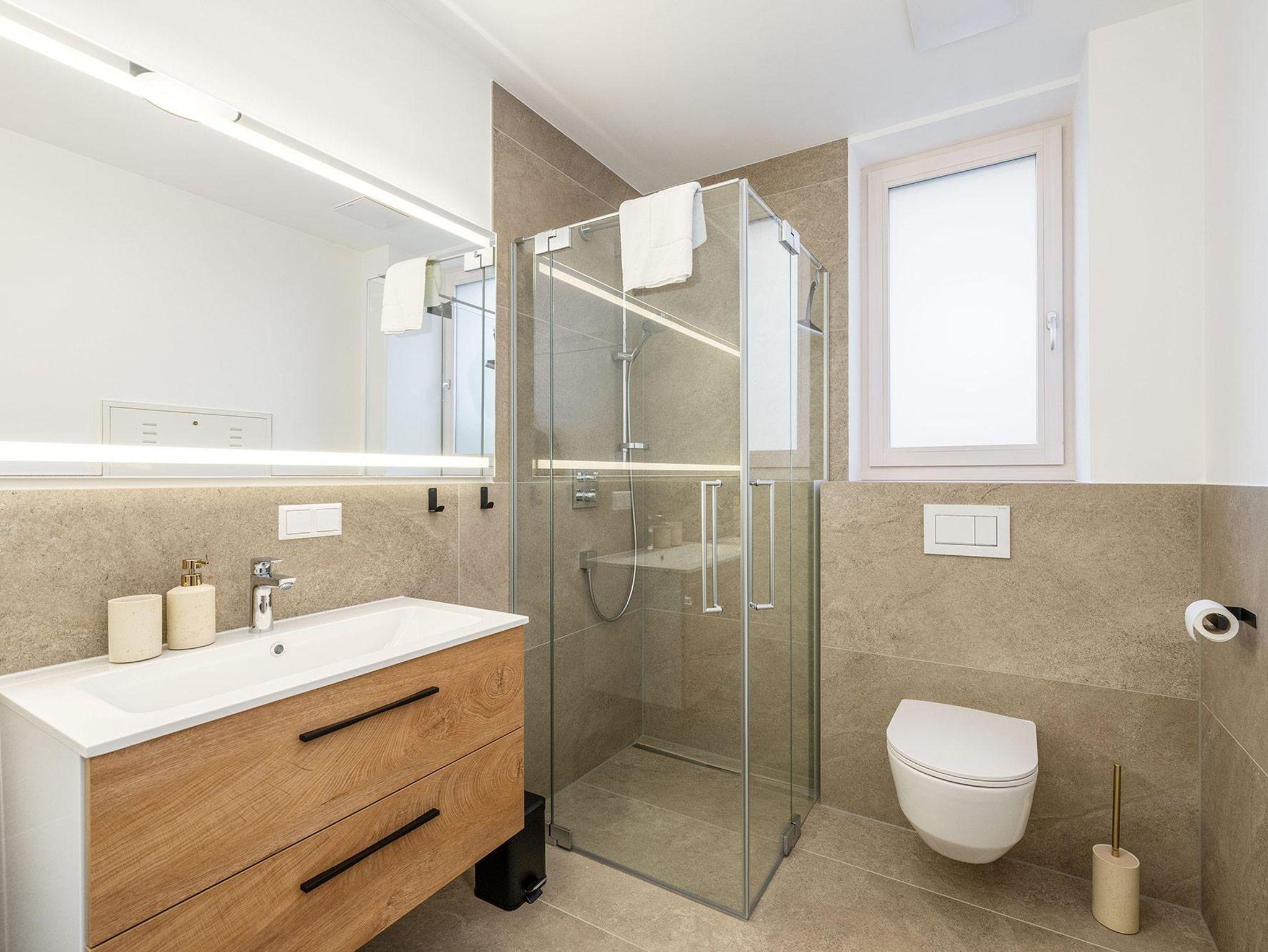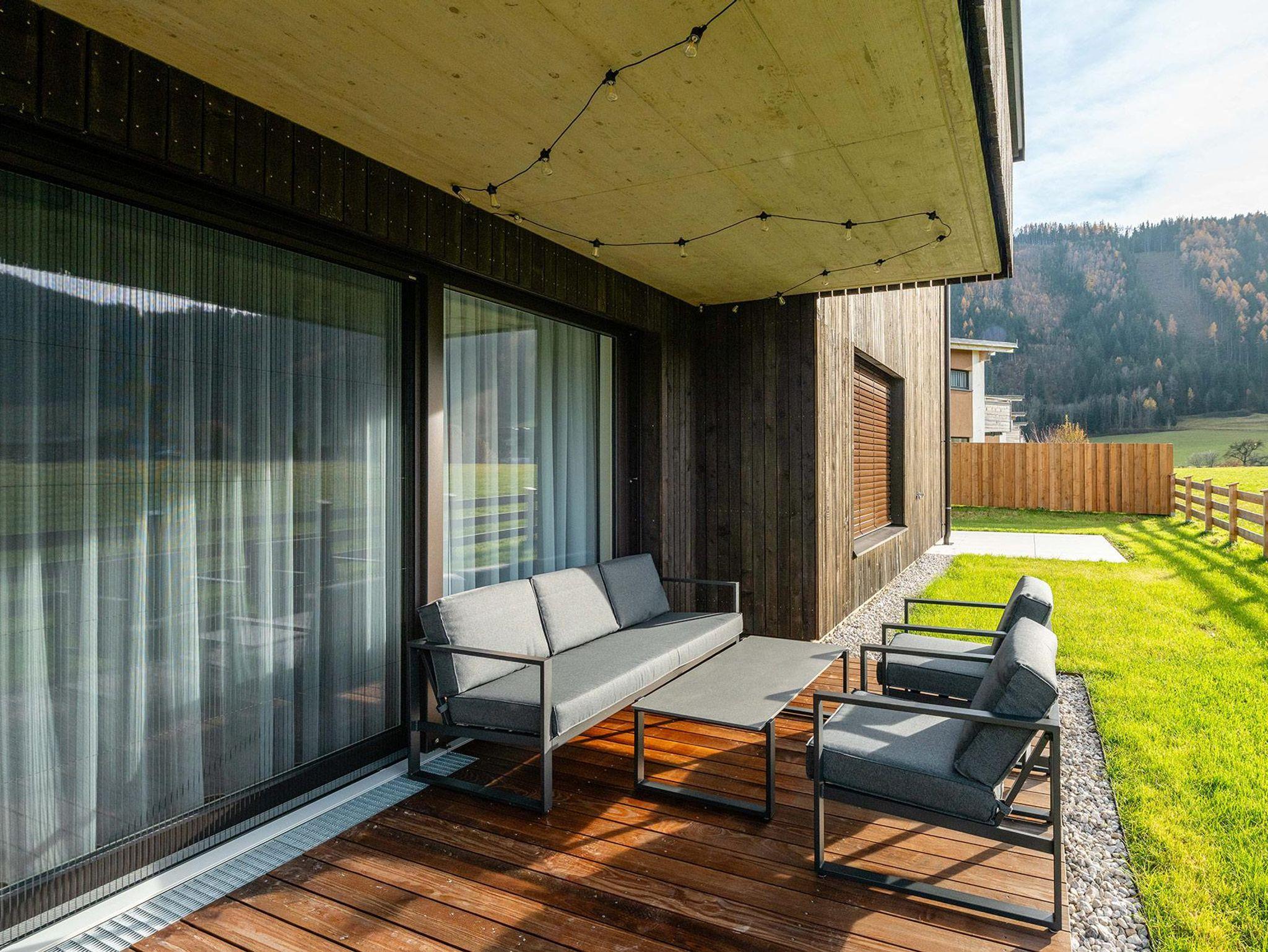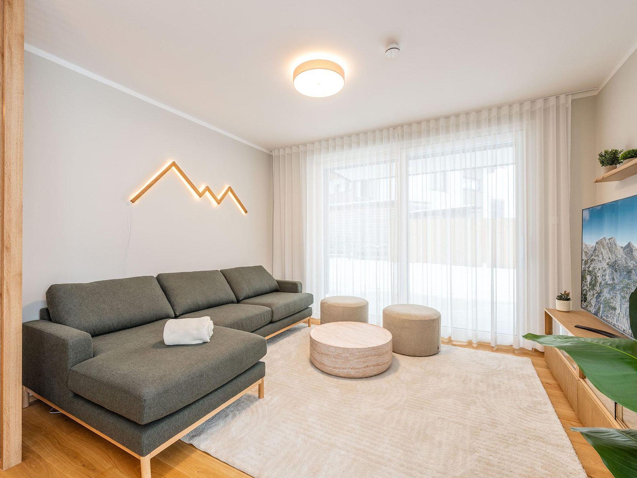 Das Schlafzimmer verfügt über ein großzügiges 180-cm-Doppelbett, im Wohnbereich bietet ein hochwertiges Schlafsofa zusätzlichen Platz. Die Westterrasse lässt Sie die Nachmittagssonne genießen – mit einem beeindruckenden Panorama auf Stoderzinken und Kammspitz, das seinesgleichen sucht.