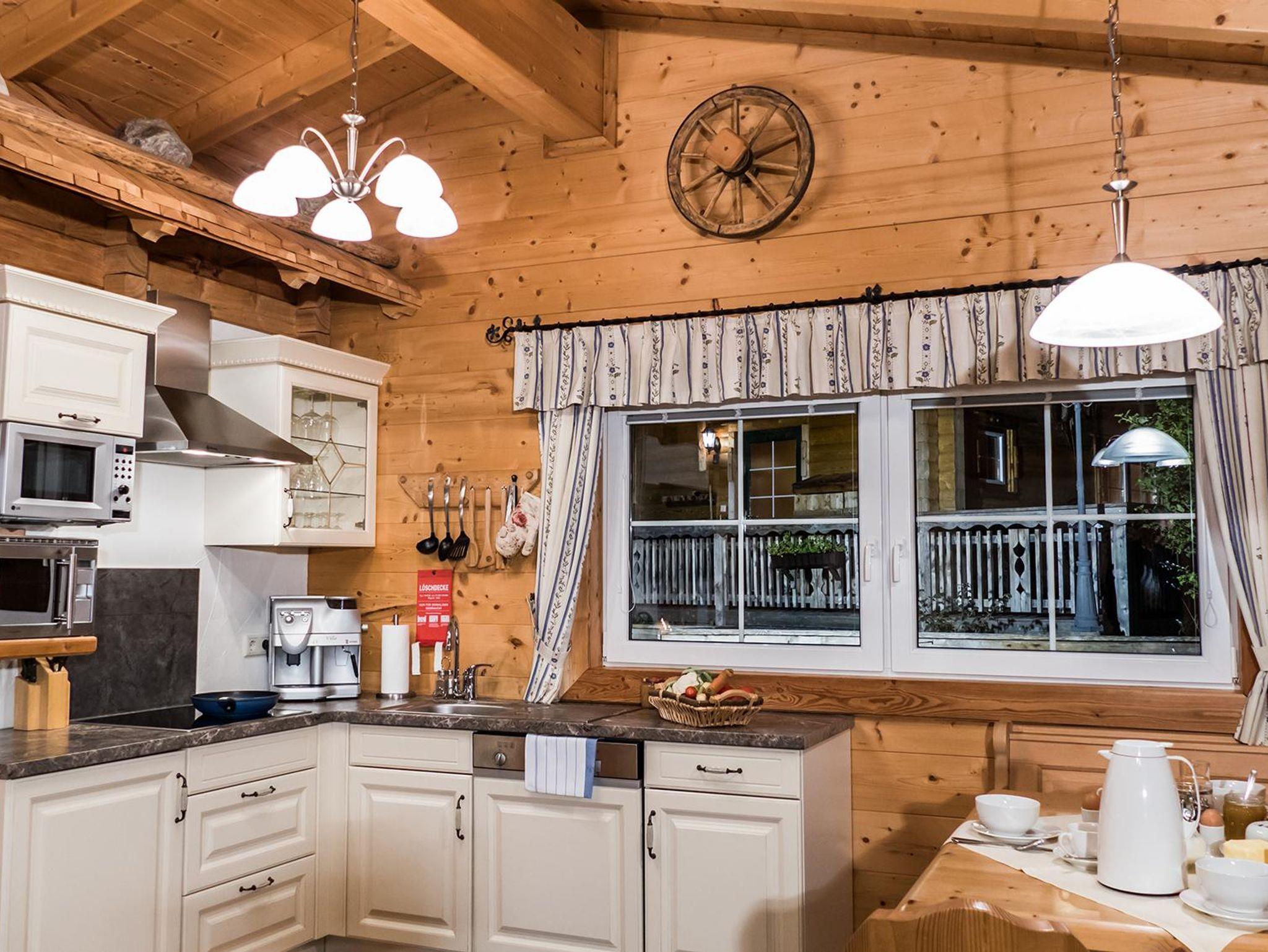 • Voll eingerichtete offene Küche mit Sitzecke und großem Jogeltisch im Landhausstil