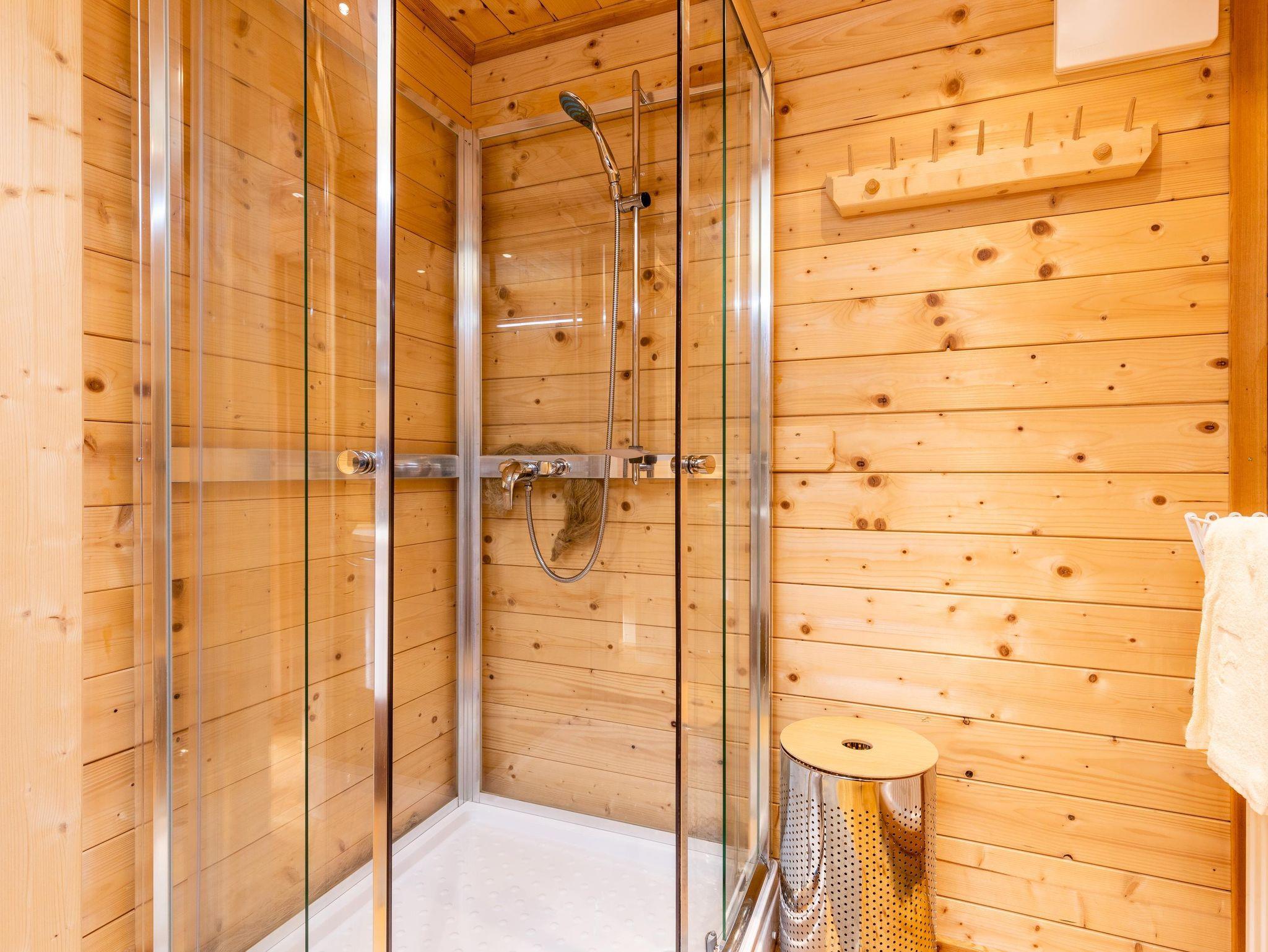 • Ein geräumiges Badezimmer mit Dusche und Waschtisch