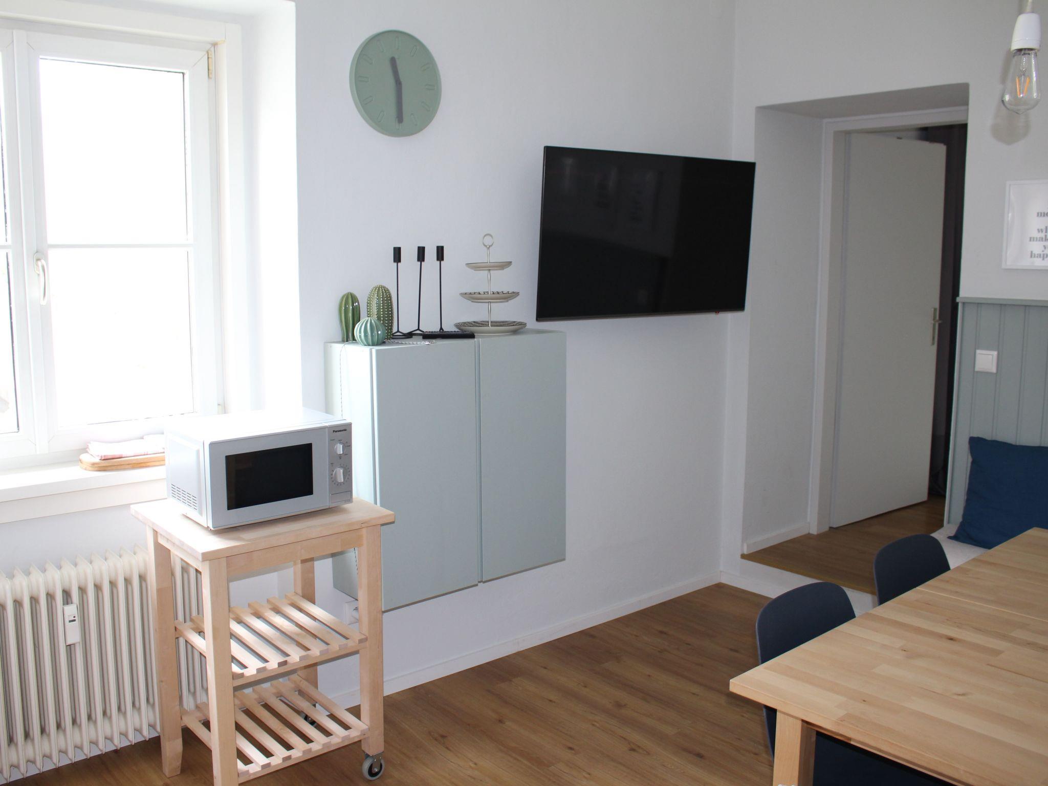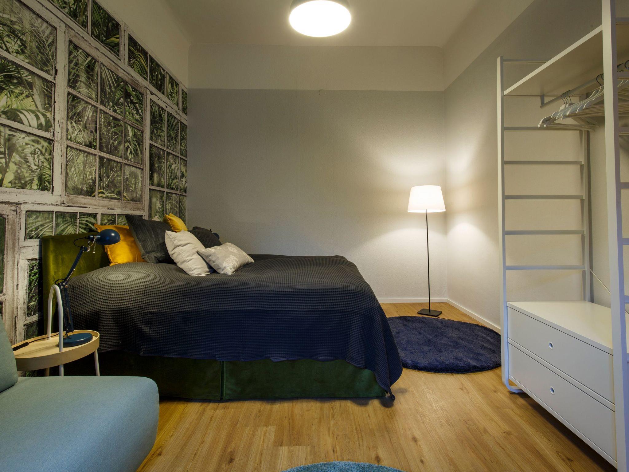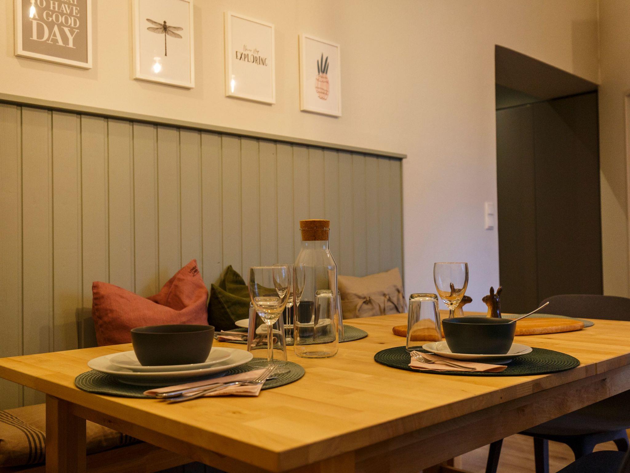 The living area This completely refurbished flat offers wonderfully cosy beds, beautiful fabrics, warm room colours with impressive wallpaper and a cosy sitting area in the kitchen. Nothing is missing - a cosy flat to arrive, feel good and relax. One bedroom looks out onto the "Markhof", one of the oldest Wilhelminian-style villas in Graz, and the quiet garden belonging to it. The kitchen/living room and the other bedroom look directly onto the university entrance. The new kitchen leaves nothing to be desired and right next to it you can spend cosy evenings at the dining table. The bathroom has also been remodelled and a washing machine/dryer combination is available. The flat is furnished with a lot of fairness and charm, everything is very practical, ideal for families with older children, two couples, 2 families with smaller children. In each bedroom there is a double bed and a pull-out sofa bed. A cot is also available on request.