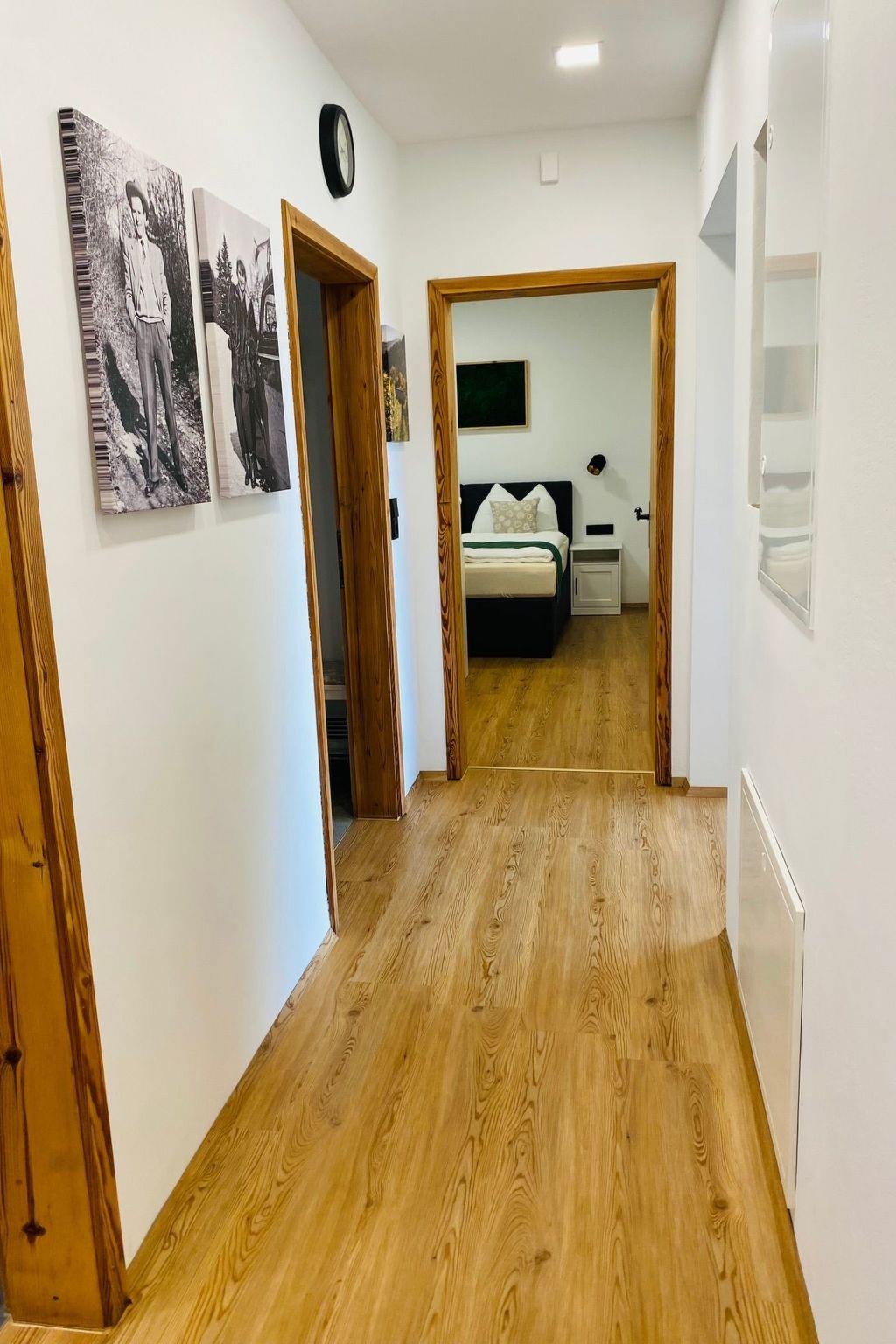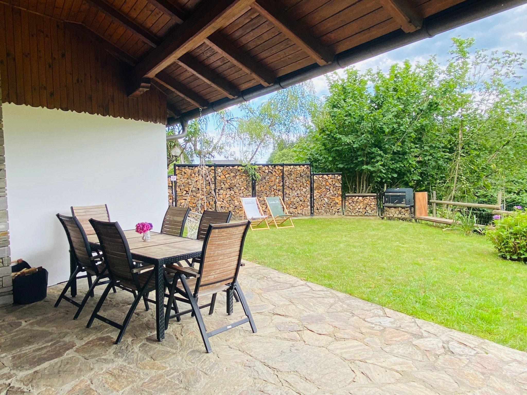 Outside, an unrivalled outdoor area awaits you, inviting you to enjoy unforgettable experiences. A covered terrace with a fireplace allows you to enjoy hours together under the stars or organise a barbecue, even in cooler weather. The private garden, which merges seamlessly into the surrounding nature and a neighbouring cow pasture, offers the ideal retreat for relaxing moments outdoors. Here it is possible to experience nature up close and perhaps even enjoy a visit from some curious calves. The garden is perfectly fenced for all 4-legged friends.
