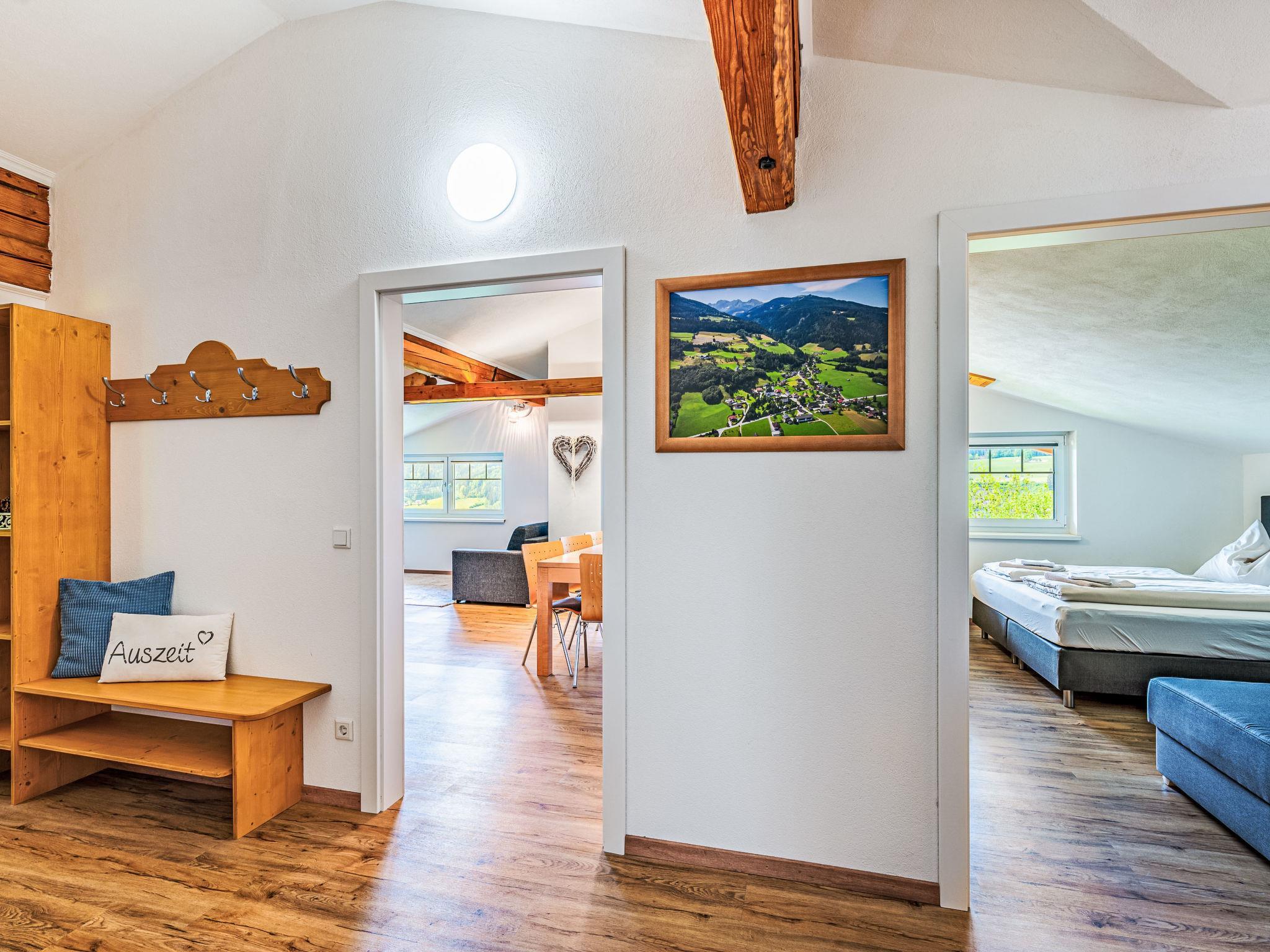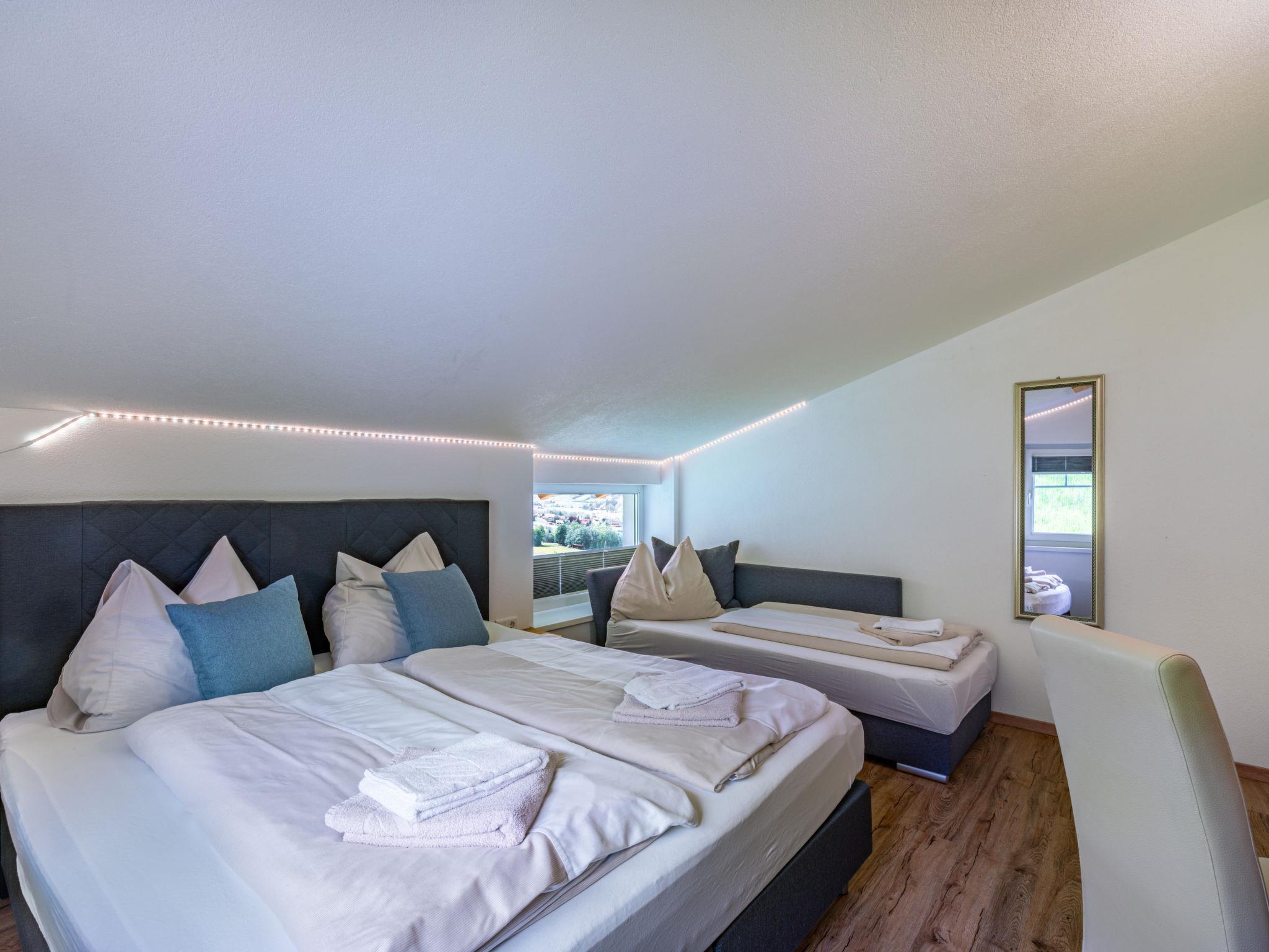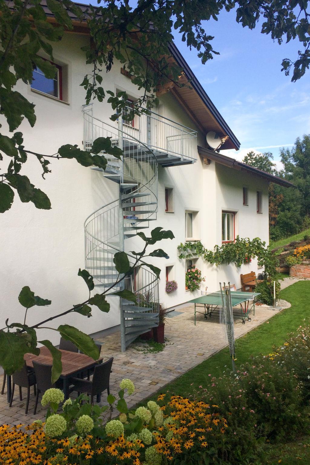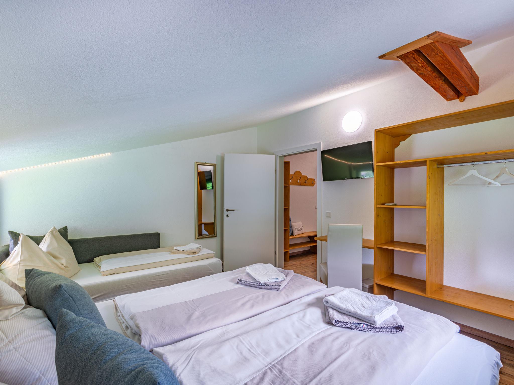 "Mawa", 3-room apartment 106 m2, on the top floor. Partly with sloping ceilings, cosy furnishings: living/sleeping room with 1 double sofabed, dining table, satellite TV and international TV channels (flat screen). 2 rooms, each room with 1 sofabed, 1 double bed, satellite TV and international TV channels (flat screen). Open kitchen (oven, dishwasher, 4 ceramic glass hob hotplates, toaster, kettle, electric coffee machine). Shower, sep. WC, double hand-basin. Heating. Parquet floors. Beautiful panoramic view of the mountains and the valley. Facilities: Internet (WiFi, free). Please note: non-smokers only. Note: Access via external spiral staircase or internally.