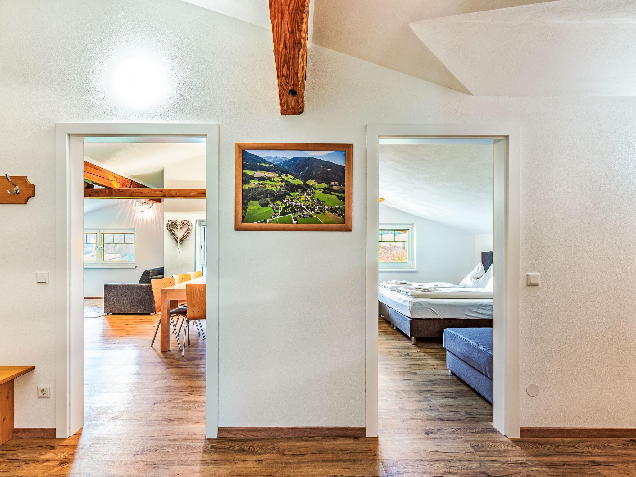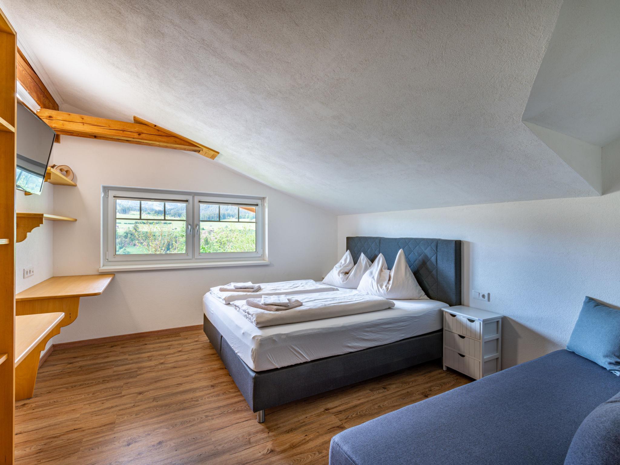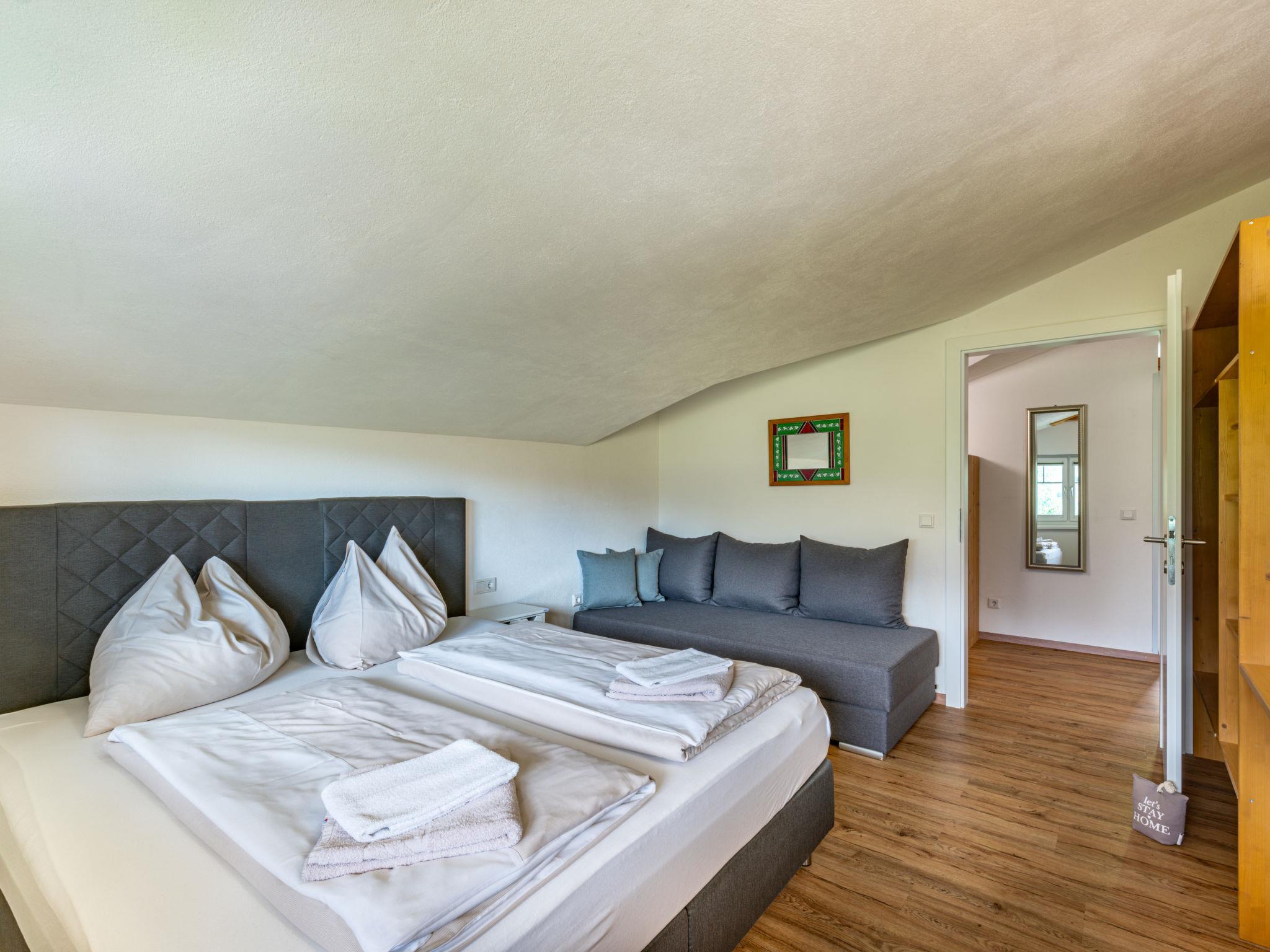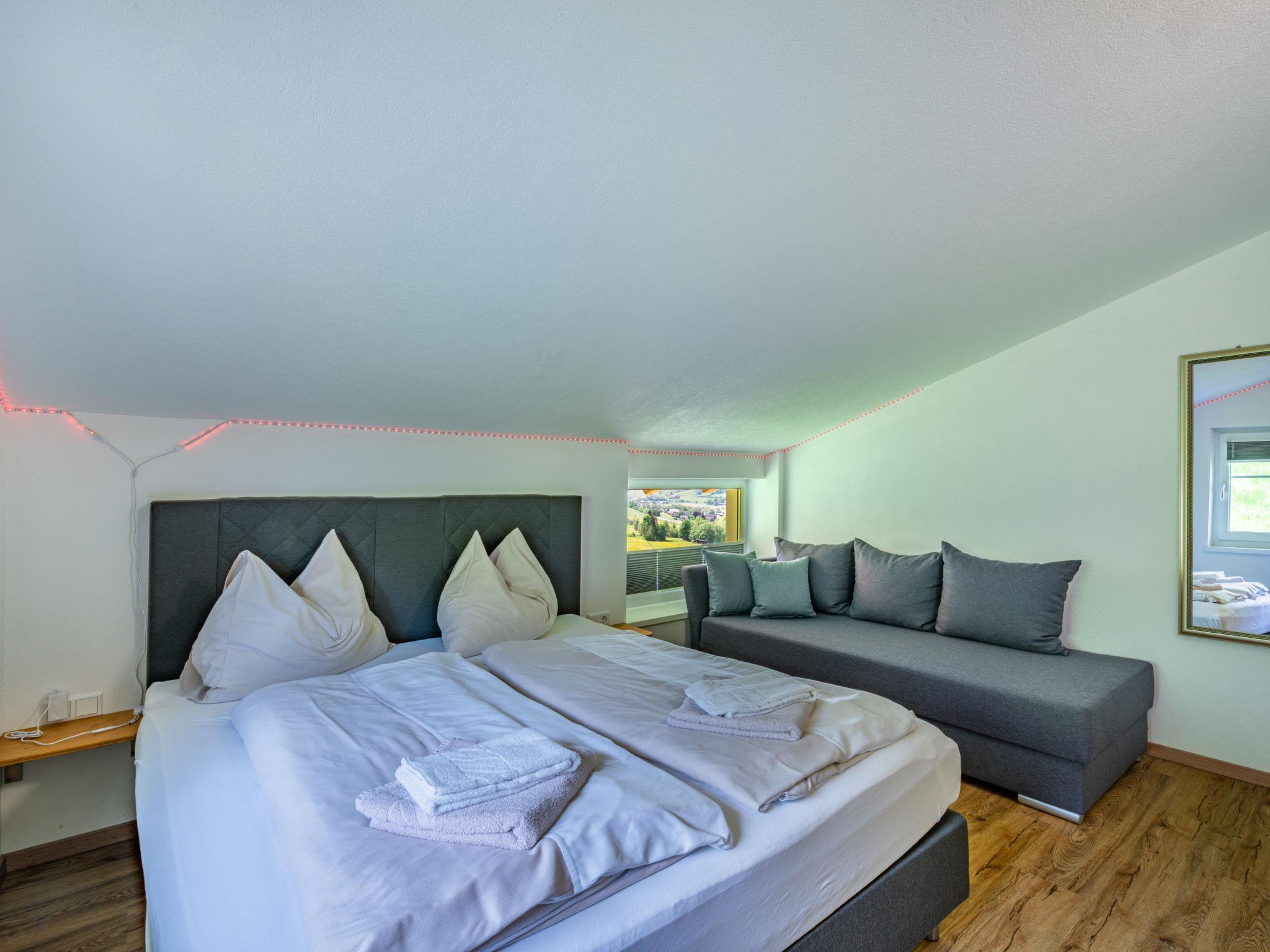 "Mawa", 3-room apartment 106 m2, on the top floor. Partly with sloping ceilings, cosy furnishings: living/sleeping room with 1 double sofabed, dining table, satellite TV and international TV channels (flat screen). 2 rooms, each room with 1 sofabed, 1 double bed, satellite TV and international TV channels (flat screen). Open kitchen (oven, dishwasher, 4 ceramic glass hob hotplates, toaster, kettle, electric coffee machine). Shower, sep. WC, double hand-basin. Heating. Parquet floors. Beautiful panoramic view of the mountains and the valley. Facilities: Internet (WiFi, free). Please note: non-smokers only. Note: Access via external spiral staircase or internally.
