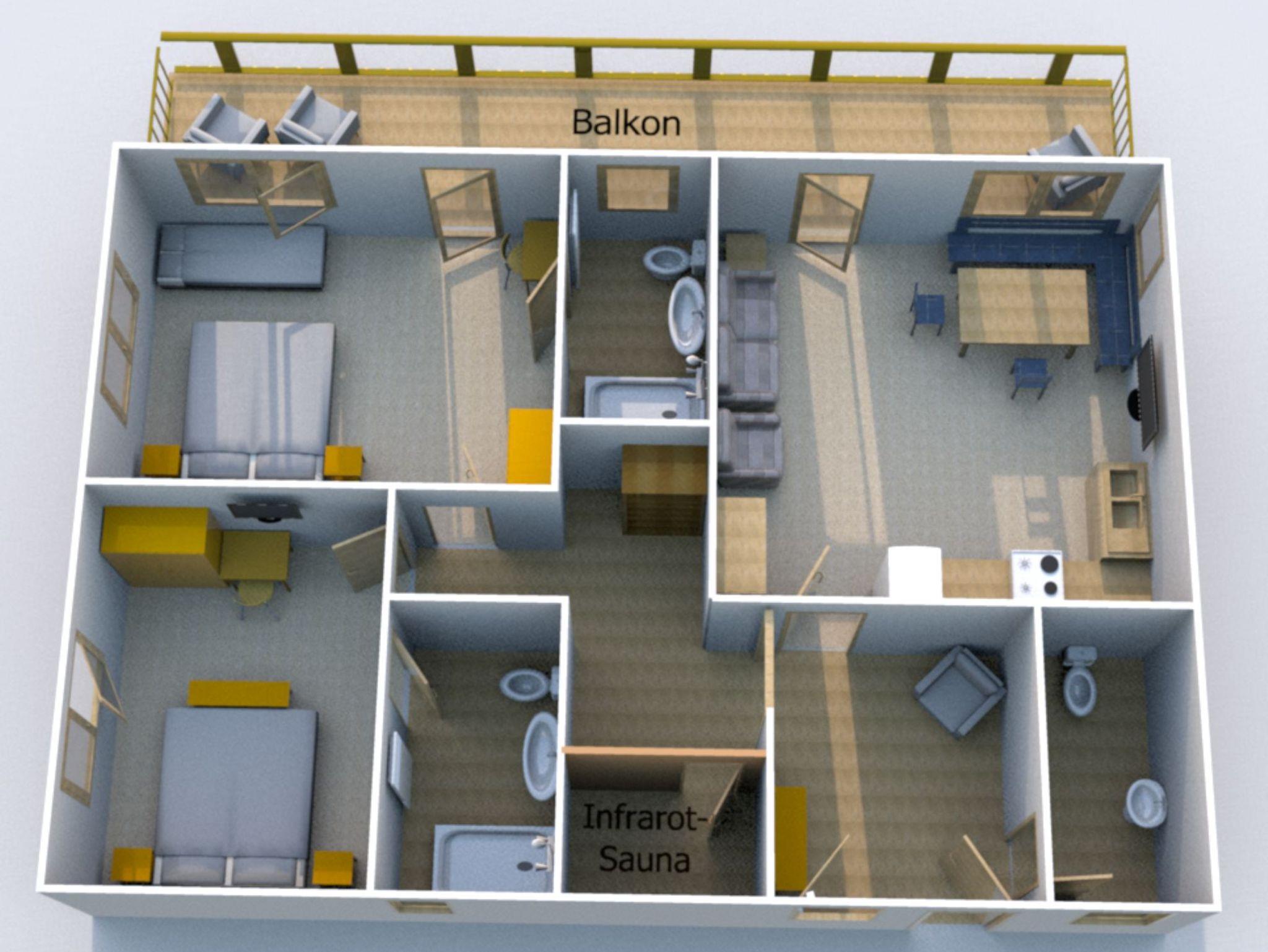 Wohnung Eiche: Eingerichtet mit edlem Eichenholz, bietet diese Wohnung ebenfalls eine vollausgestattete Küche mit Sitzecke, zwei getrennte Schlafzimmer, zwei Bäder und eine eigene Infrarot-Sauna. Eine gemütliche Terrasse lädt zudem zum Verweilen im Freien ein.