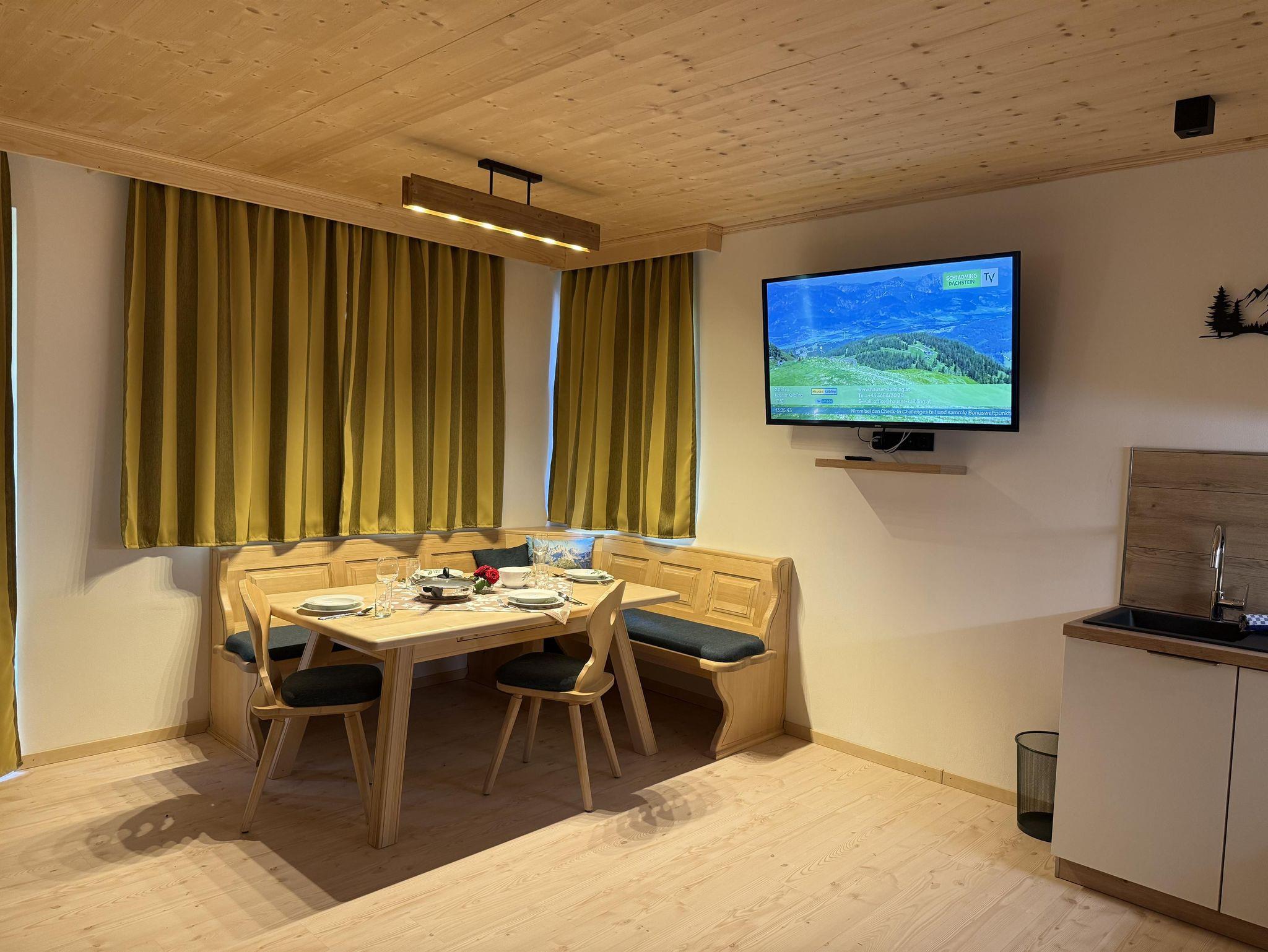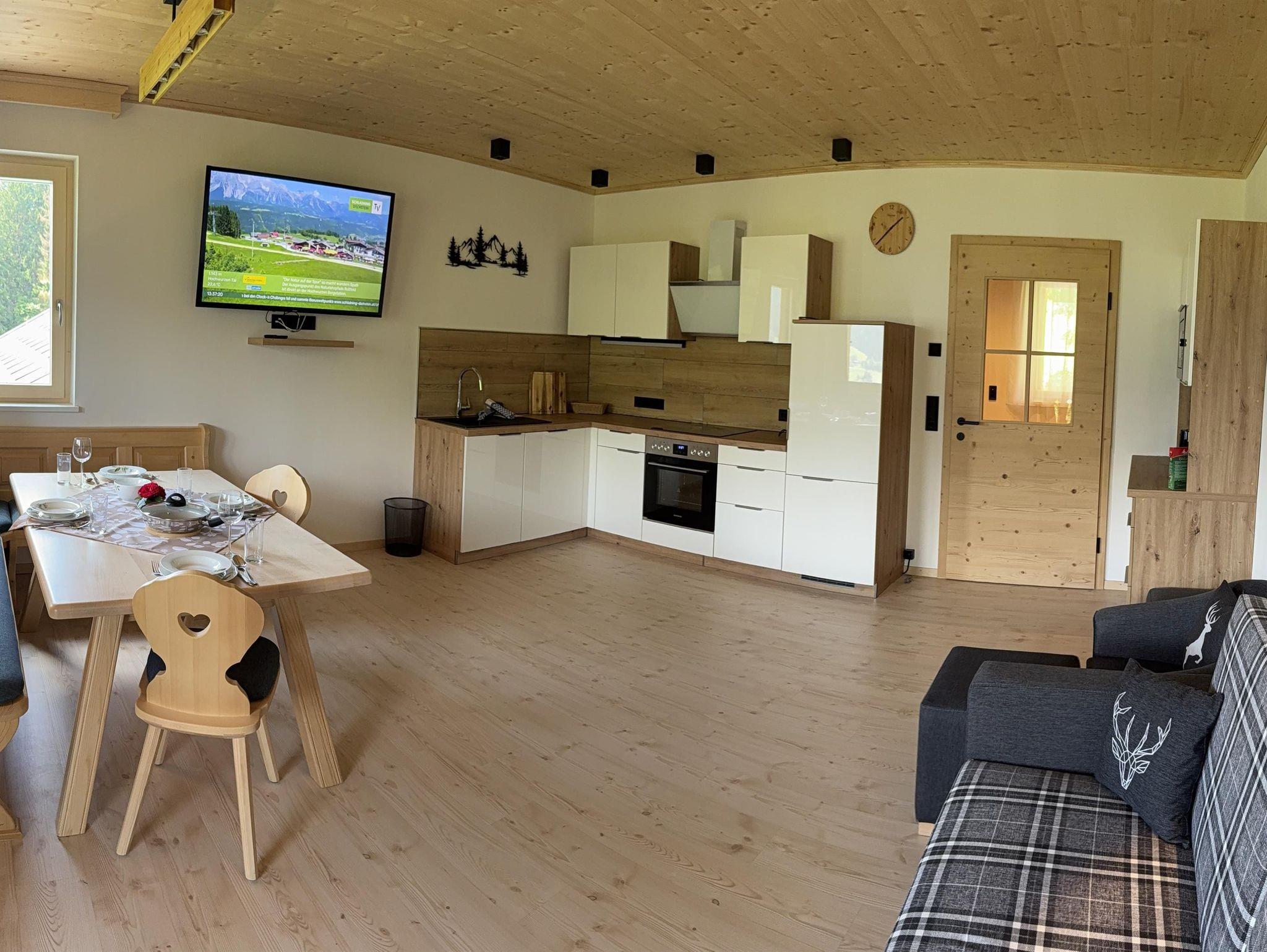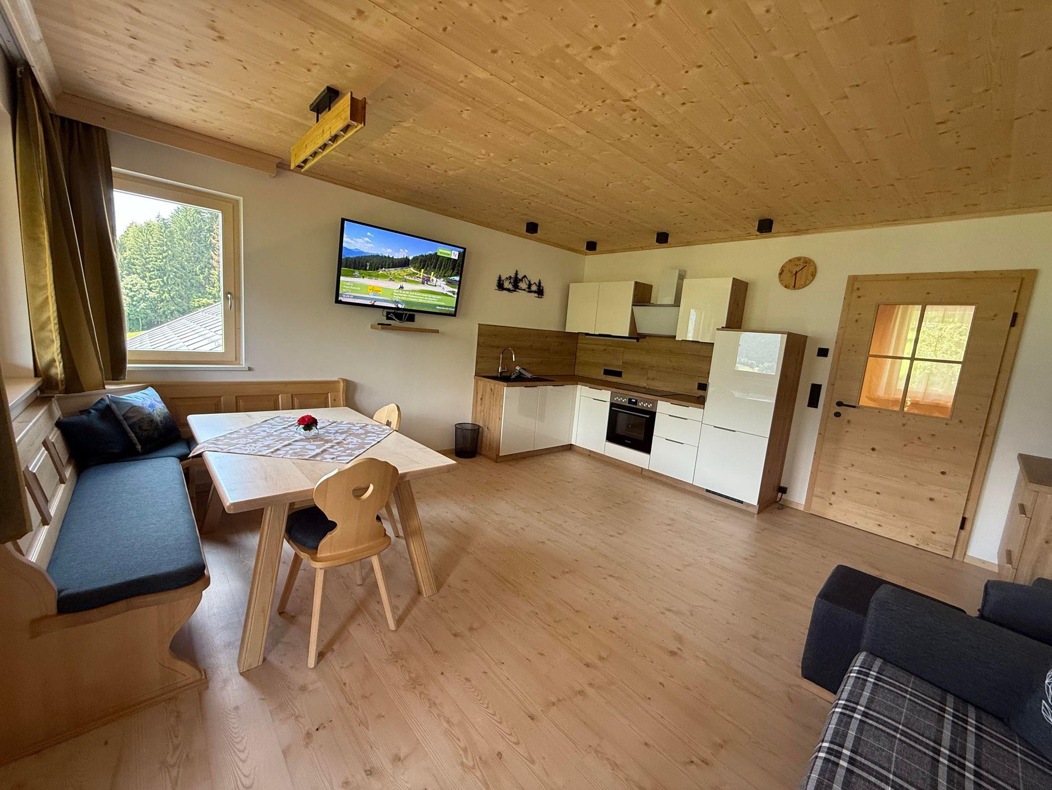 Wohnung Fichte: Diese Wohnung ist liebevoll mit Fichtenholz eingerichtet und verfügt über eine vollausgestattete Küche mit einer gemütlichen Sitzecke, ideal für gemeinsame Mahlzeiten oder entspannte Abende. Zwei separate Schlafzimmer, jedes mit eigenem Bad, bieten ausreichend Raum und Komfort. Ein zusätzliches separates WC, eine Infrarot-Sauna, ein barrierefreier Zugang und ein Balkon mit atemberaubendem Fernblick runden das Angebot ab.