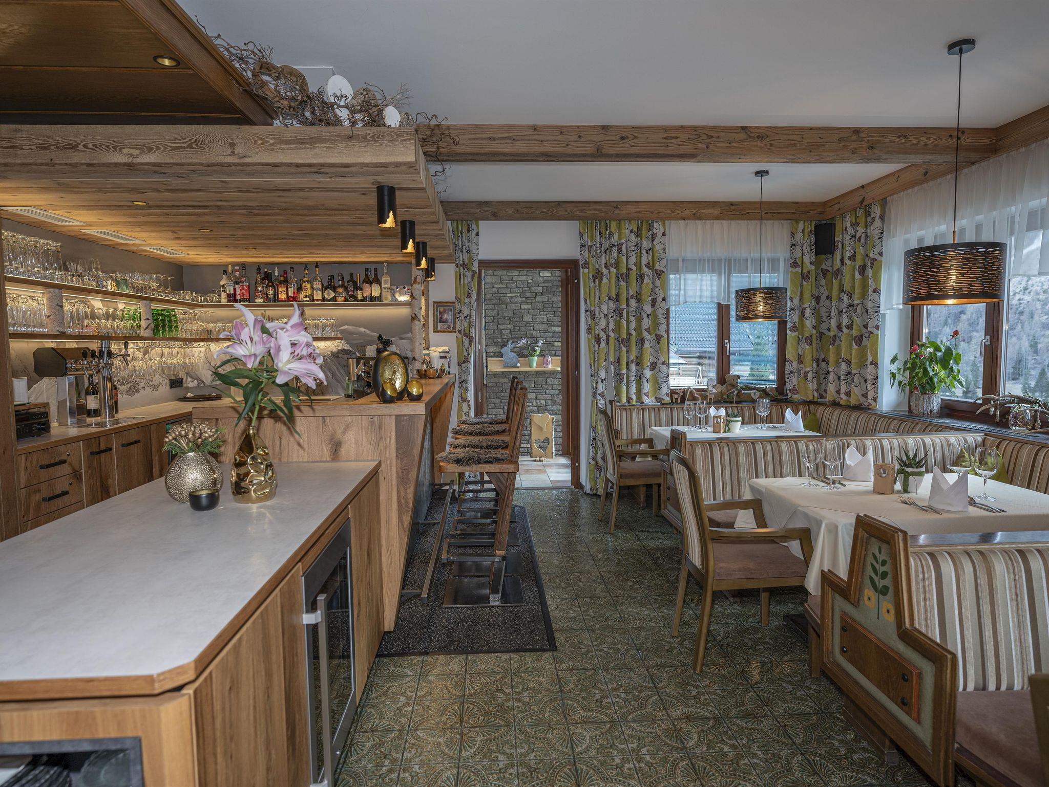 Der Morgen bei uns beginnt mit einen reichhaltigen Frühstücksbuffet, nach einem schönen Ski Tag genießen Sie gepflegte Getränke an der Bar und im Anschluss wird Ihnen ein mit viel Liebe zubereitetes 4 Gänge Menü serviert. (Einmal wöchentlich Ruhetag)