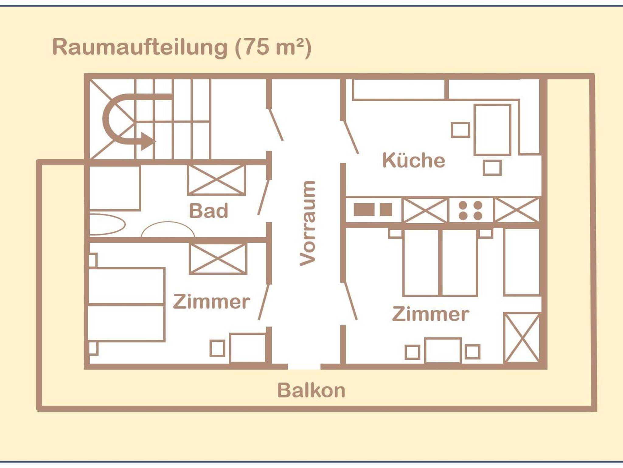Die Ferienwohnung ist mit 75 m² äußerst geräumig. Es stehen zwei Schlafzimmer, eine große Wohnküche, ein Badezimmer sowie ein Vorraum zur Verfügung. Die Küche ist großzügig ausgestattet und verfügt über einen Kochherd, Kühlschrank, Mikrowelle, Kaffeeautomat, Geschirrspülmaschine und ausreichend Ess- und Kochgeschirr. Im Badezimmer liegen neben Dusche, WC und Waschmöglichkeit auch Handtücher sowie ein Haartrockner bereit. Die Schlafzimmer haben jeweils zwei große Doppelbetten.