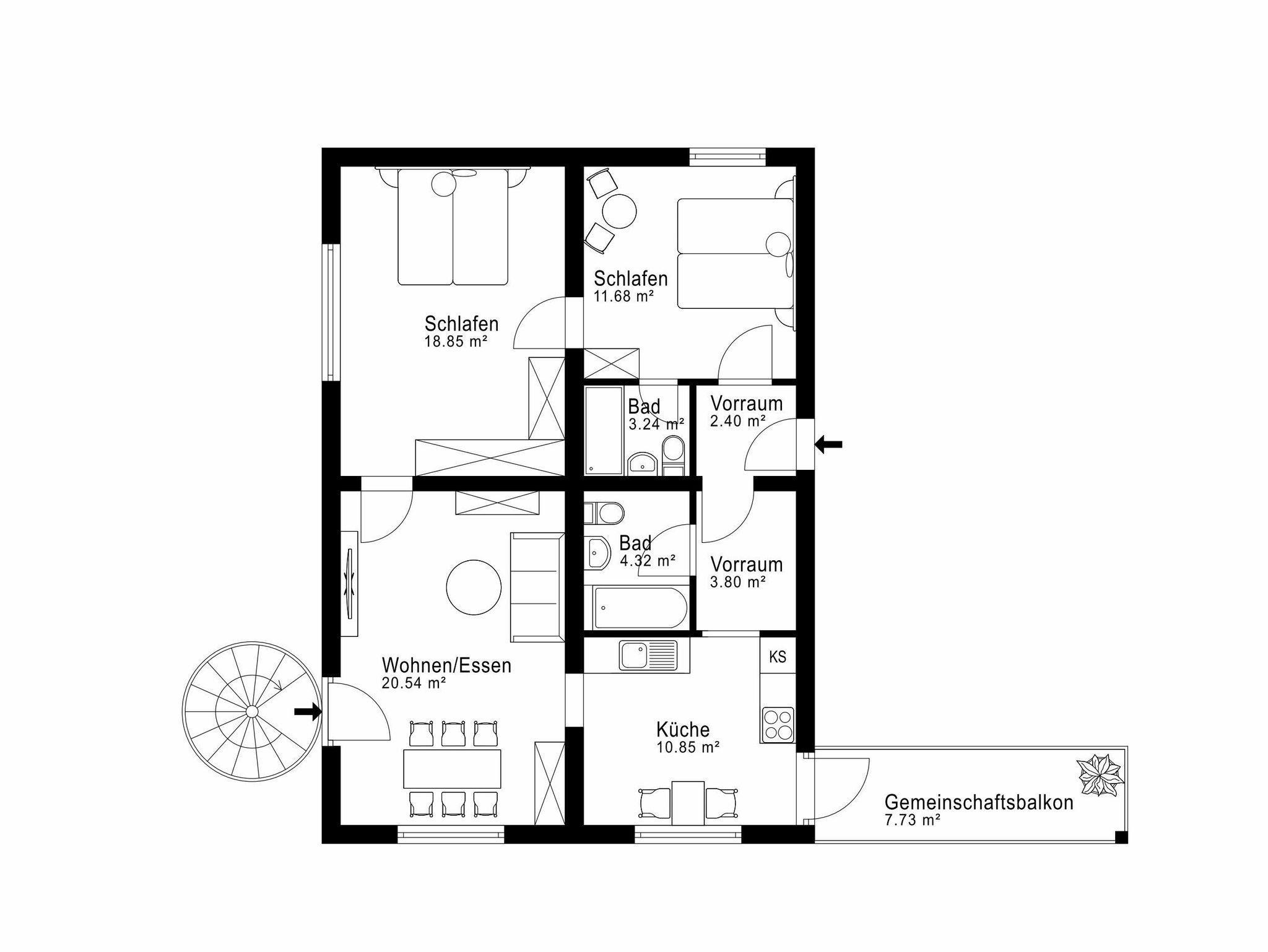 Großes Wohnzimmer mit Doppelschlafcouch, komplett ausgestattete Markenküche, 2 ruhige Doppelschlafzimmer (+Zustellbett), 2 neue Badezimmer mit Dusche/WC, Gemeinschaftsbalkon