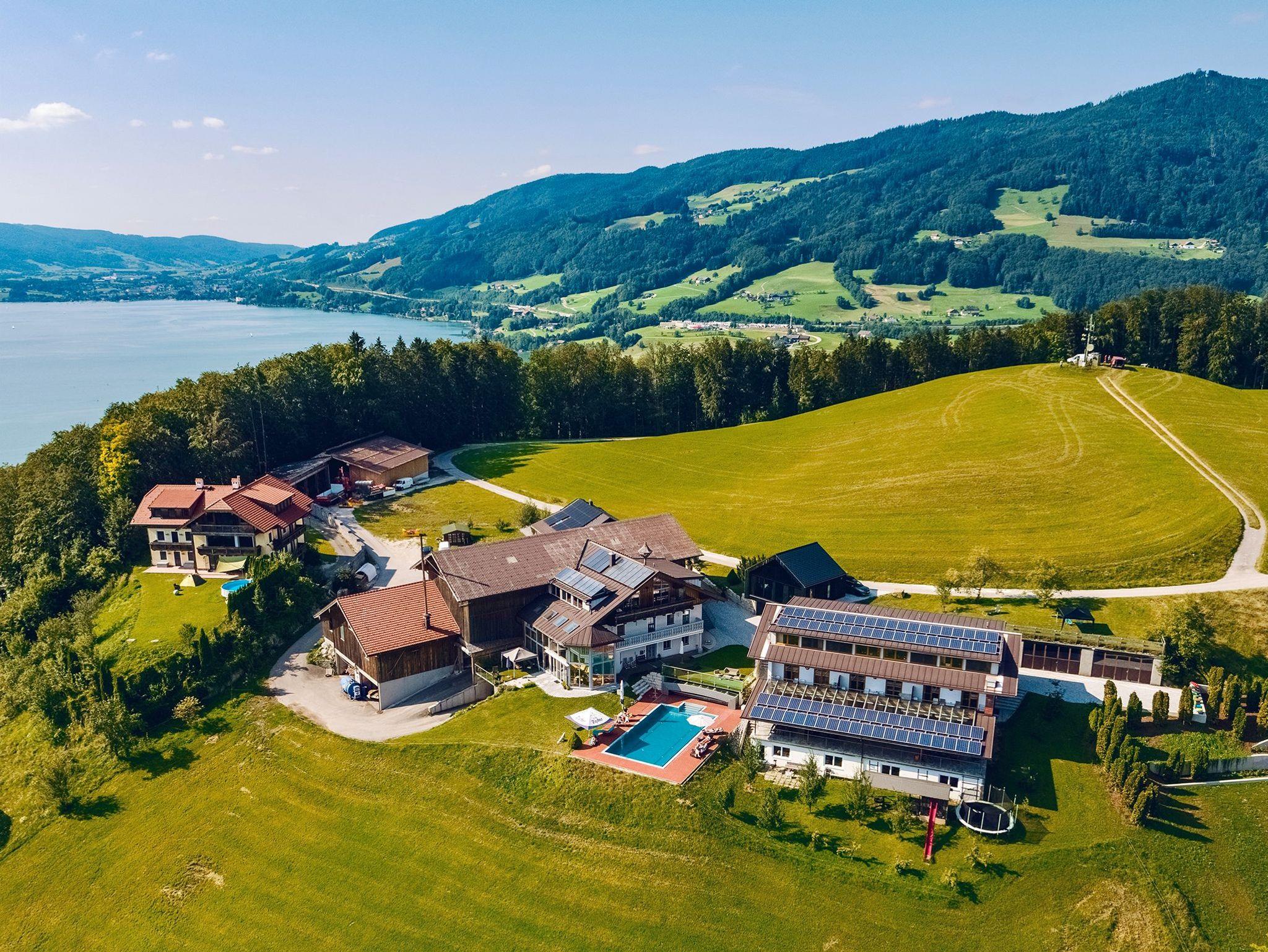 Die gemütliche Wohnung liegt auf einem idyllischen Bauernhof im Salzkammergut, mitten in der Natur, in sonniger Südhnaglage ? ideal für Familien und Ruhesuchende. Die traumhafte Umgebung begeistert mit einem herrlichen Panorama über Mondsee und Schafberg, ebenso wie der beheizte Pool, die Sauna und Infrarotkabine. Wanderungen oder Mountainbike-Touren starten direkt ab der Haustüre.Auf der überdachten Terrasse mit Seeblick können Sie den Abend entspannt ausklingen lassen. Die geräumige Wohnung ist zeitlos modern eingerichtet und bietet einen großzügigen Wohn-Essbereich. Mit dem großen Flat-Screen-Kabel-TV und WLAN bleiben Sie immer bestens verbunden. An kälteren Tagen genießen Sie romantische Abende am Kamin.