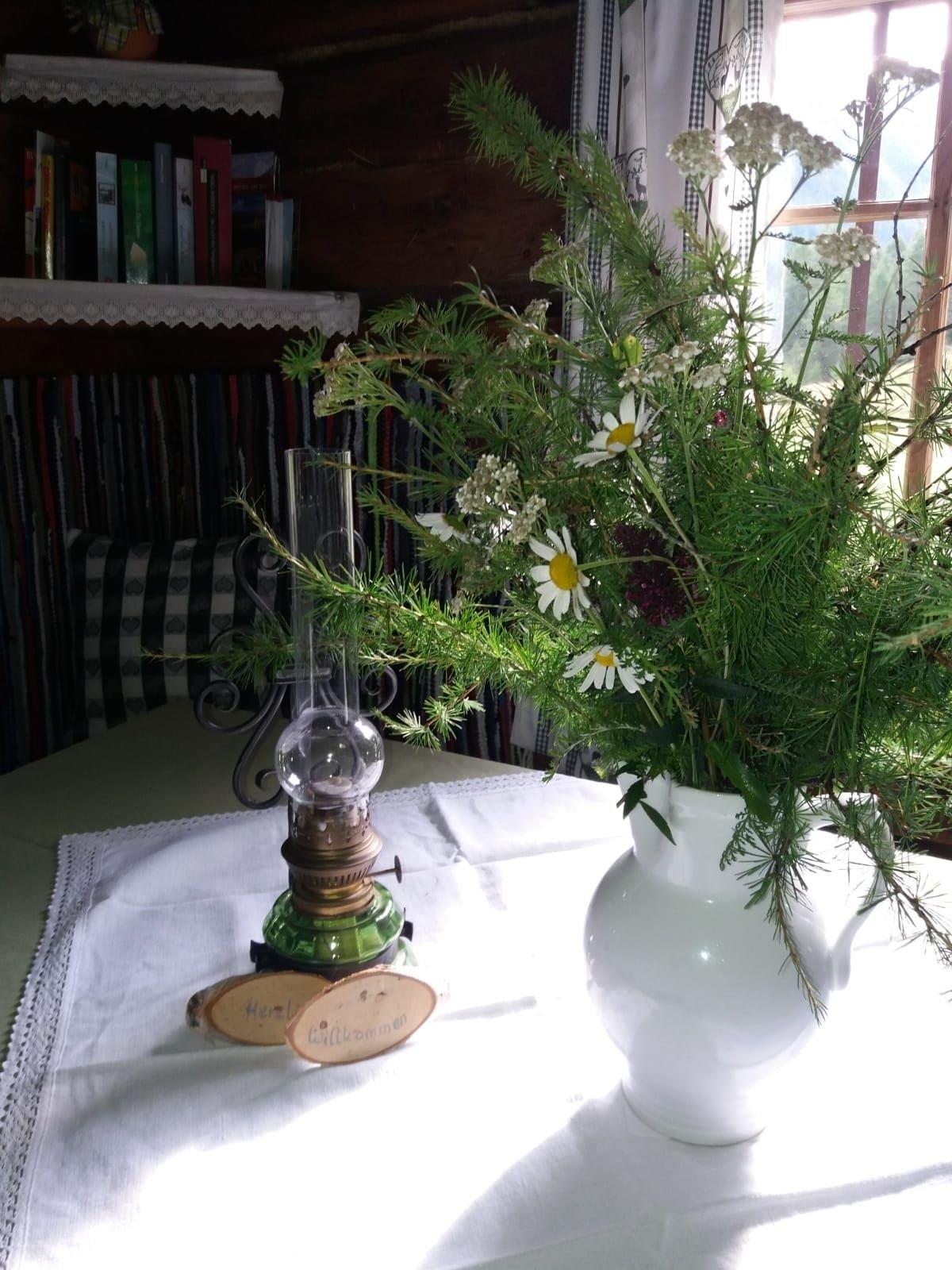 Beleuchtet wird die Almhütte durch Petroleumlampen, denn es gibt keinen Strom – ein echtes Stück Ursprünglichkeit und Entschleunigung.