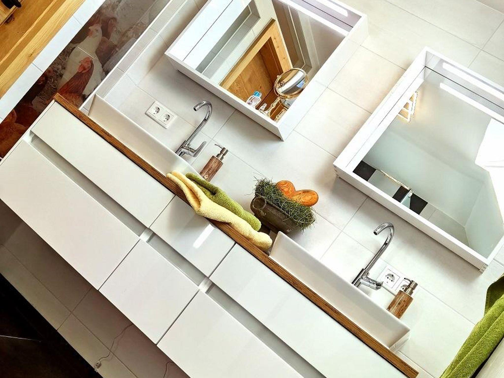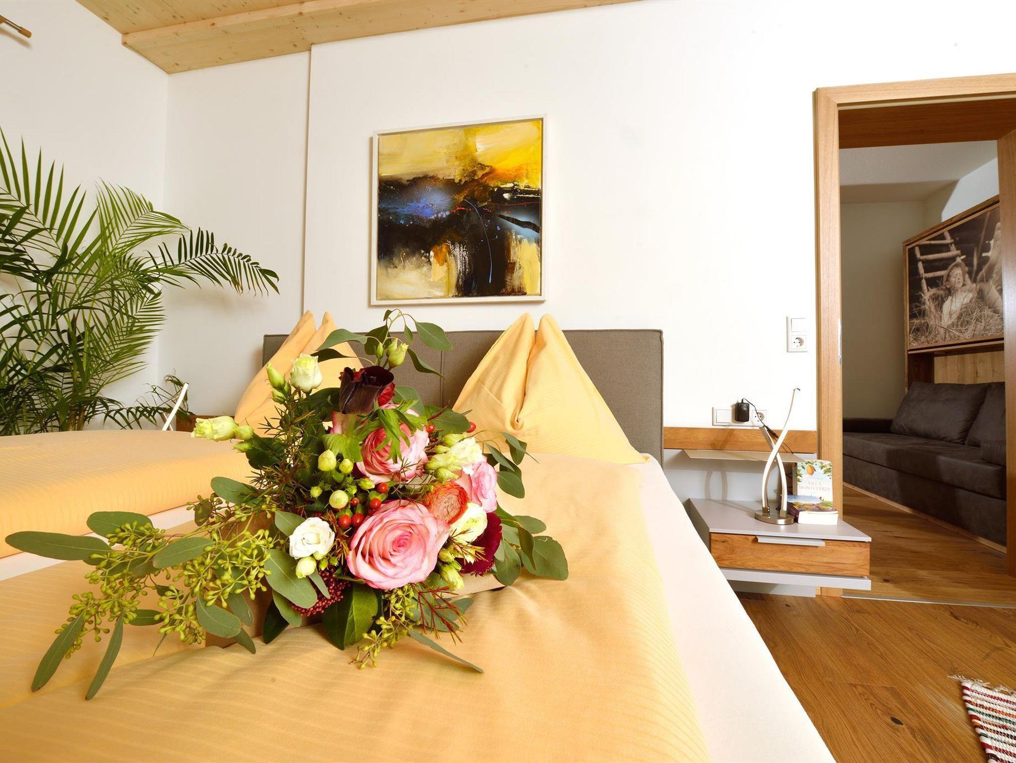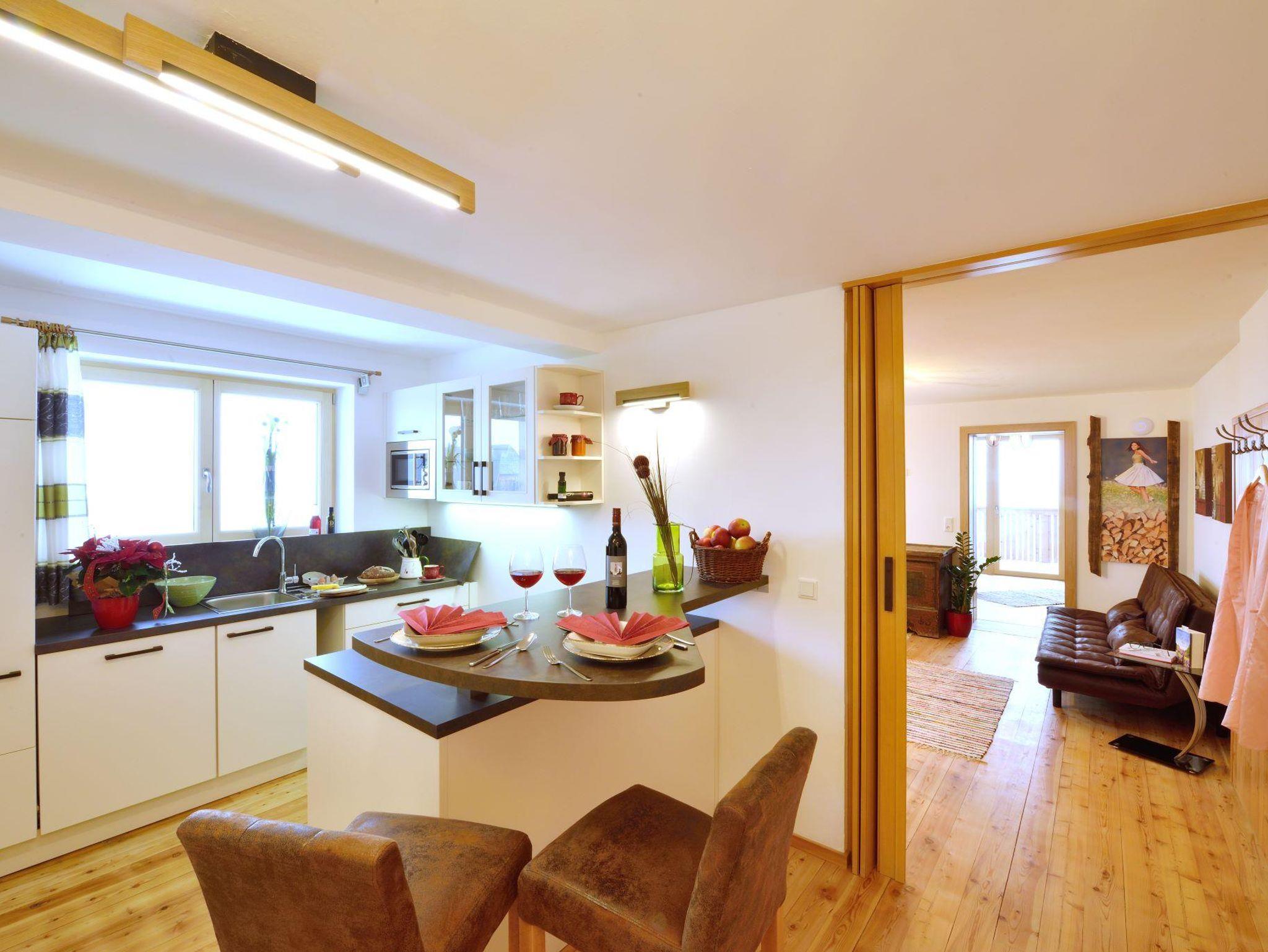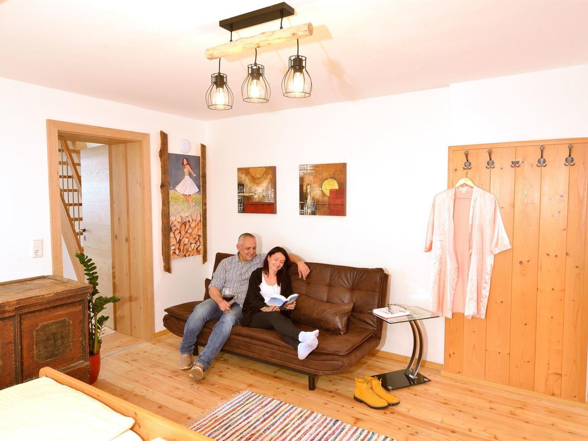 Hier kann man getrost auf den Wecker verzichten – man wird von der Sonne wachgeküsst, in sanfter Begleitung vom lieblichen Vogelgezwitscher. Von der Küche aus, erreicht man über eine kleine Stiege die wohnungseigene Infrarotkabine, welche direkt in der Dachgalerie untergebracht wurde. Hiefla unterteilen den Eingangsbereich vom Schlafzimmer und vermitteln somit das Gefühl von Hoamat und erinnern an die frühere Arbeitsweise hier am Hof.