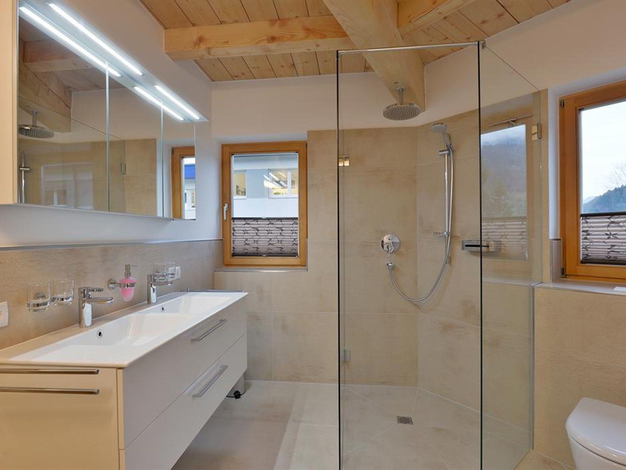 Im EG befindet sich der Eingangsbereich, 4 Schlafzimmer mit Flat-TV und 2 Bäder mit Walk-in Dusche, Doppelwaschbecken, Handtuchtrockner und Föhn.