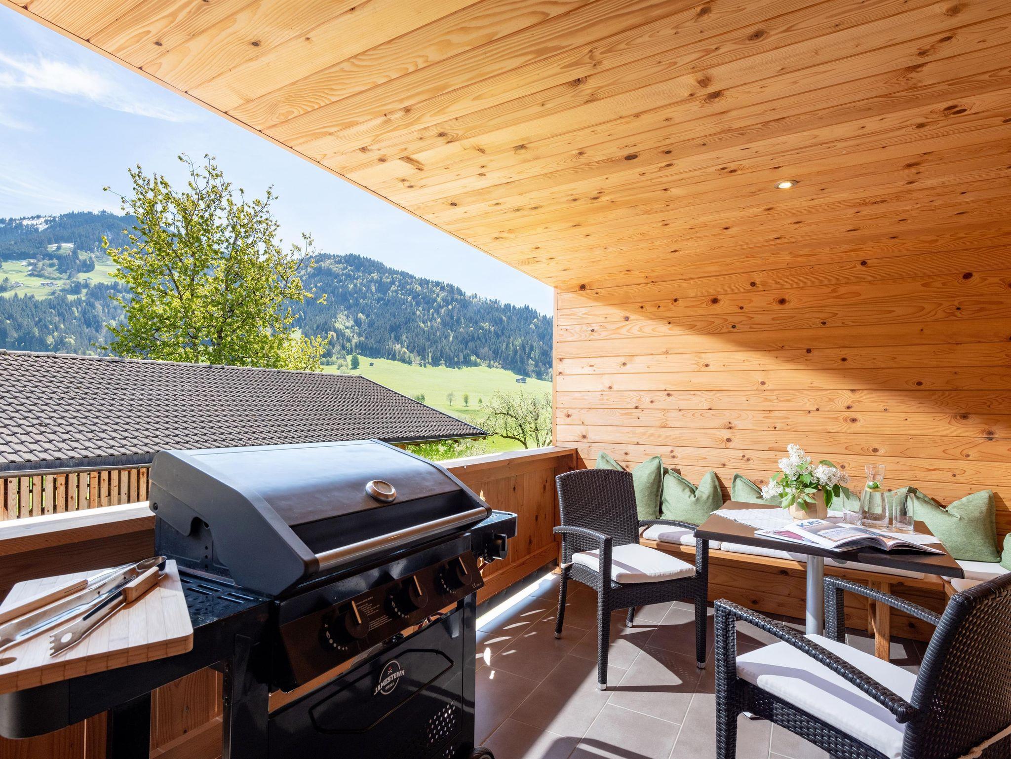 Zusätzlich zur Fußbodenheizung bietet bei Bedarf ein Kachelofen wohlige Wärme. Auf dem Balkon mit Terrassenmöbeln genießen Sie einen herrlichen Ausblick in die Natur.