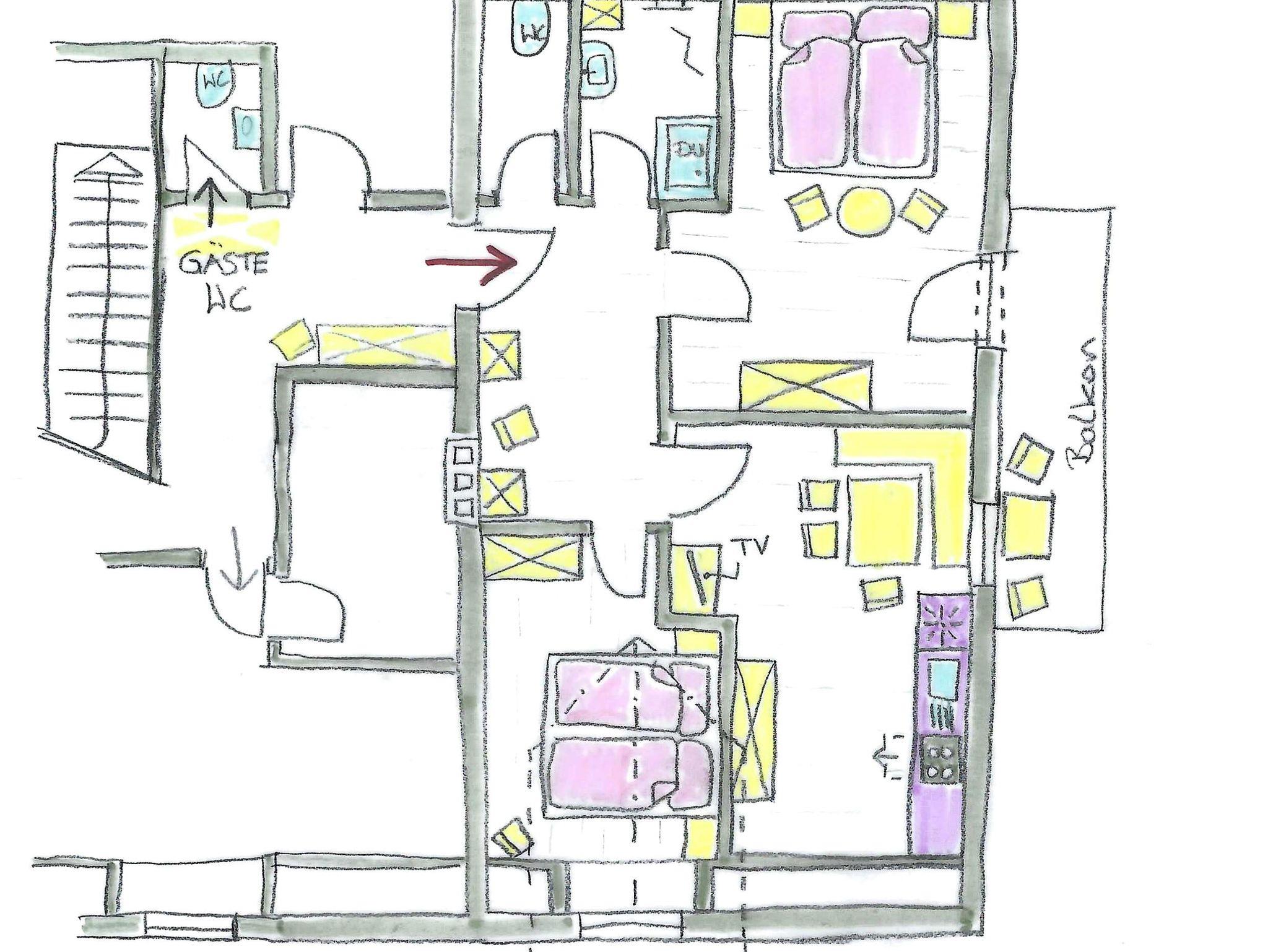Ferienwohnung mit 68 m² für 4 Personen . 2 getrennte Schlafzimmer, Wohnküche mit SatTv , Dusche, Wc , Balkon .