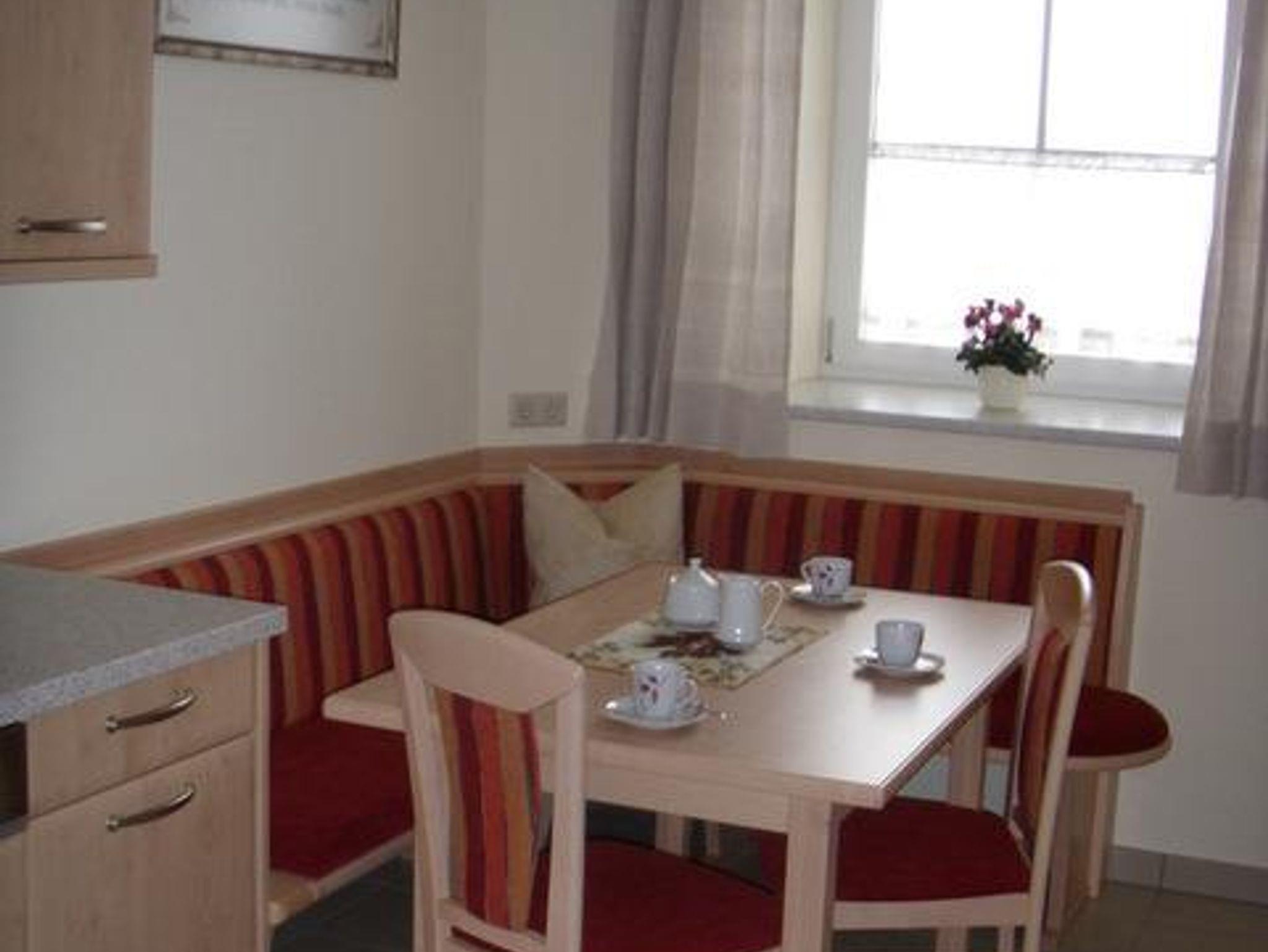 Die Küche mit gemütlicher Sitzecke, in der es genügend Geschirr, Gläser, Kochgeschirr und Küchenhelfer gibt, kann man sich seine zubereiteten Speisen so richtig schmecken lassen. Eine große Dusche mit Fön, Kosmetikspiegel, Hand und Duschtüchern stehen für sie bereit. Das WC befindet sich im Vorraum der Wohnung. Auf den ersten Blick, ein Platz zum wohlfühlen!