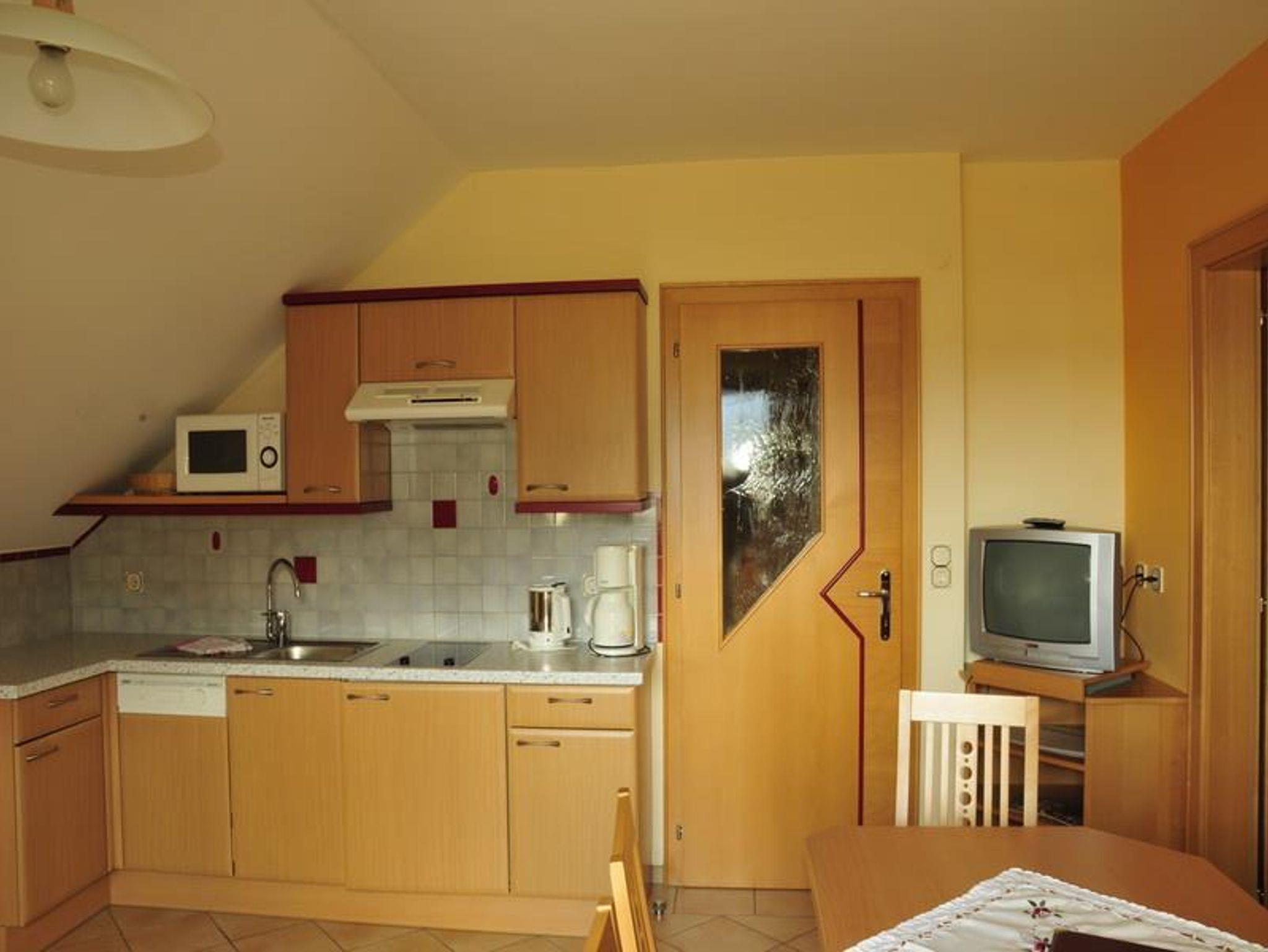 Große Wohnküche mit TV-Sat, Radio, E-Herd, Mikrowelle, Wasserkocher, Geschirrspüler, Kaffeemaschine, Besteck, Geschirr, Geschirrtücher, Spielset, Märchenbuch.