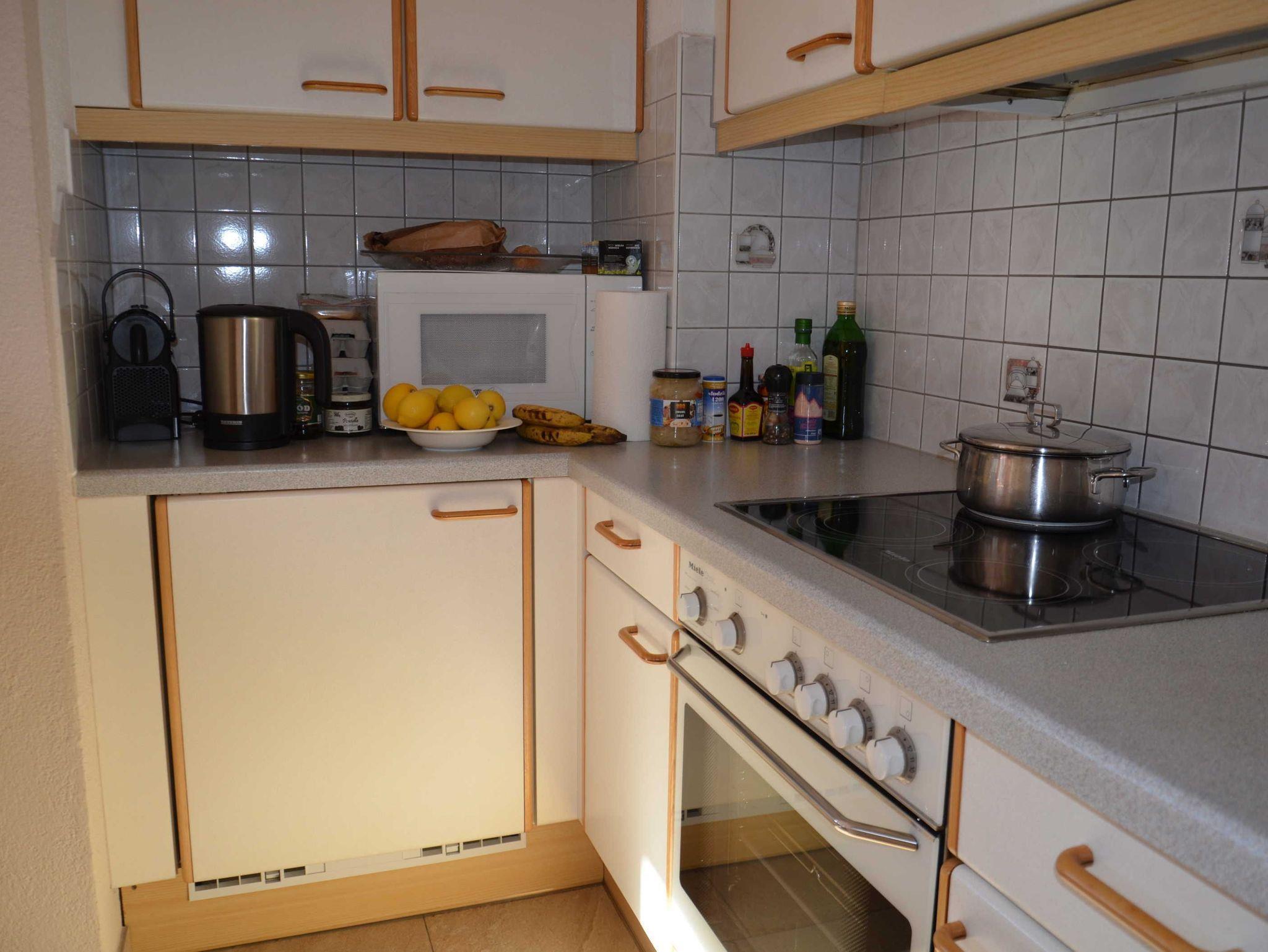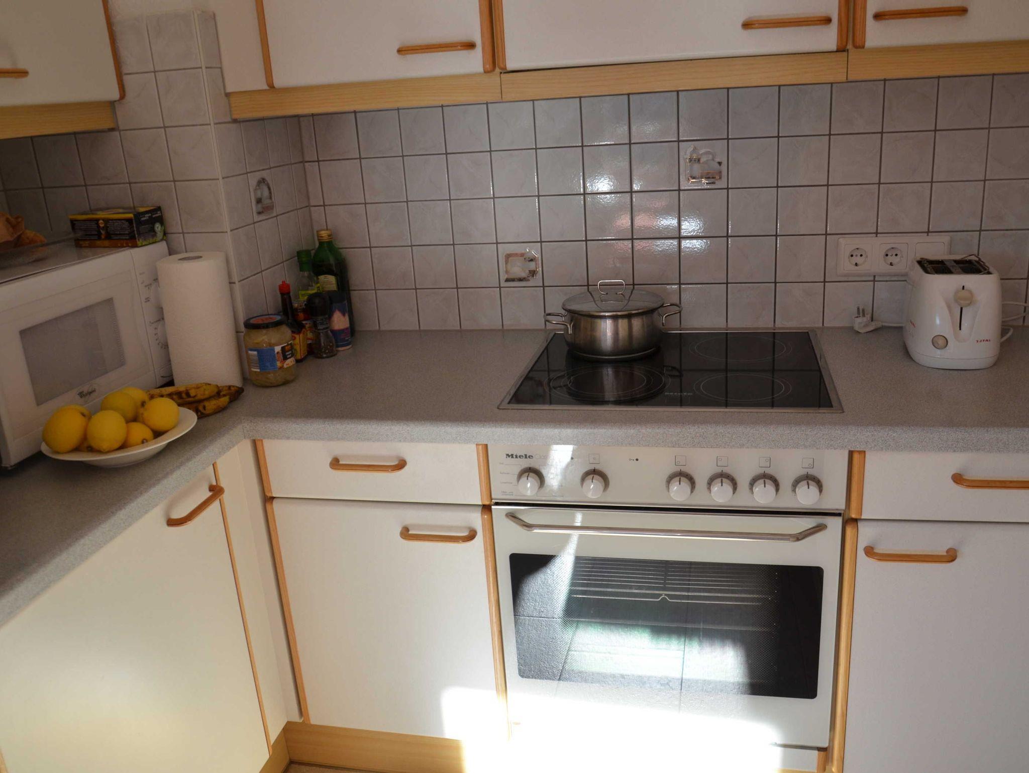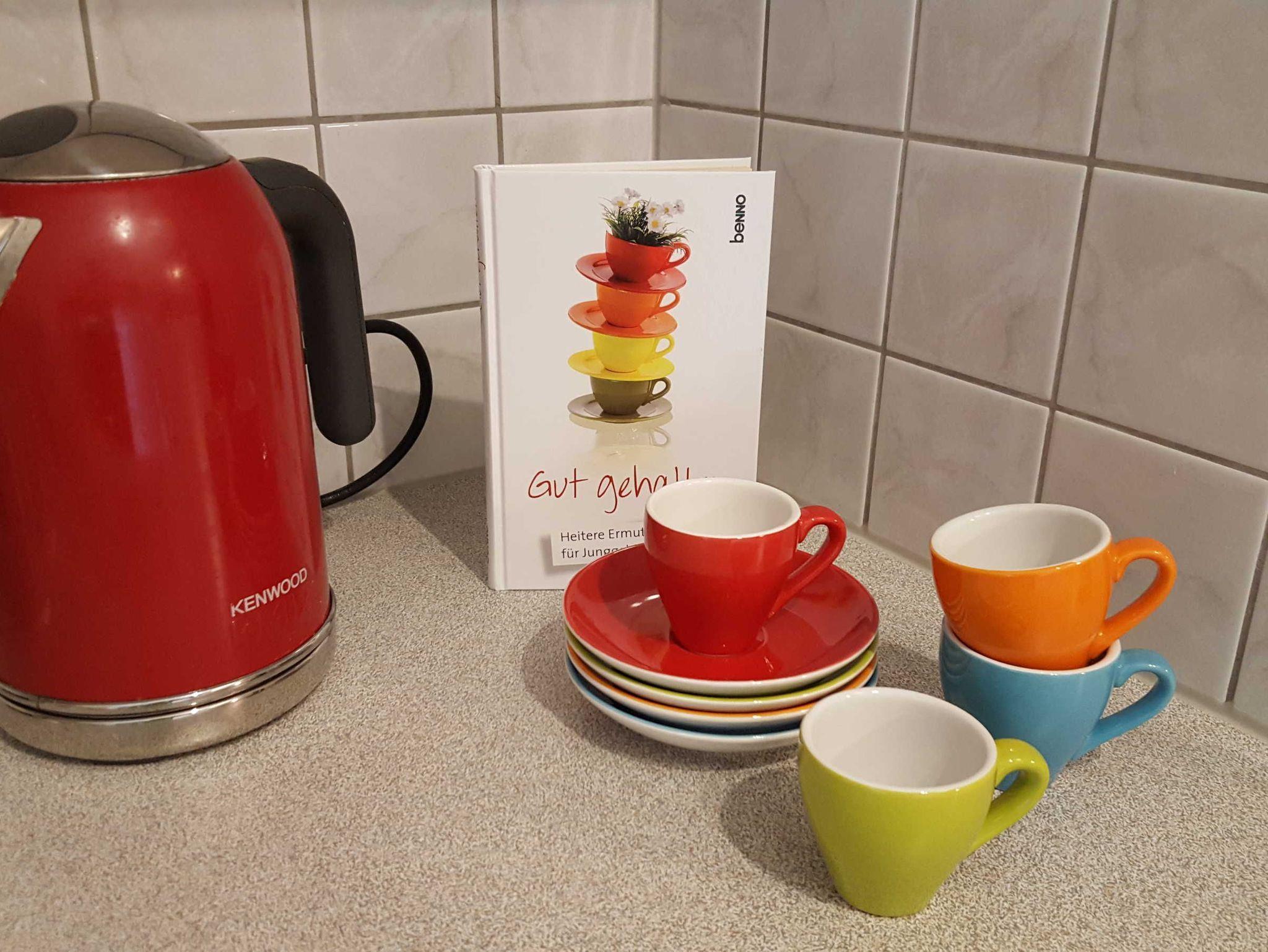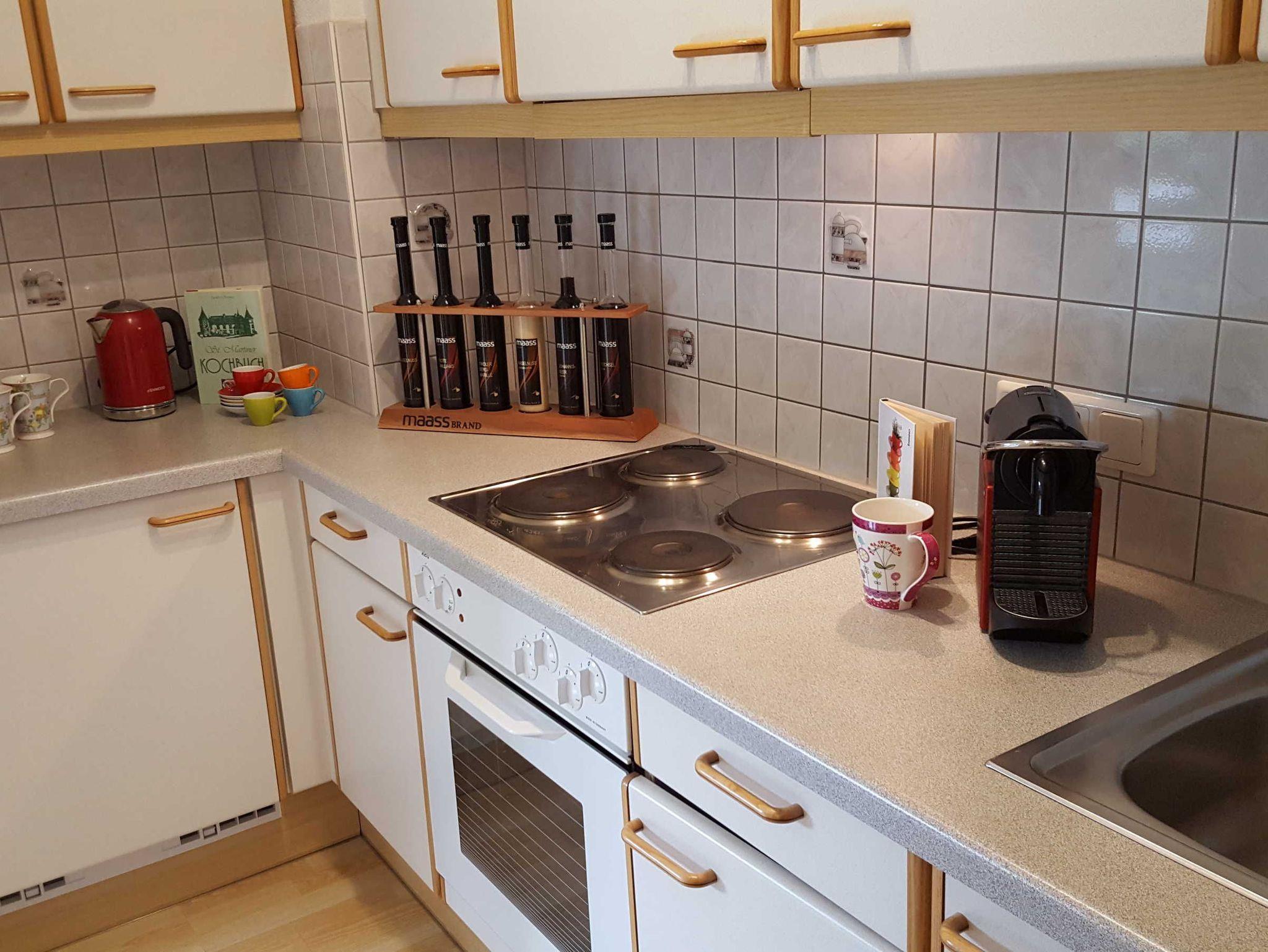 Küche mit Kühlschrank, Geschirrspüler, Herd mit Backrohr, Mikro, Kaffeemaschinen, Eierkocher, Toaster,