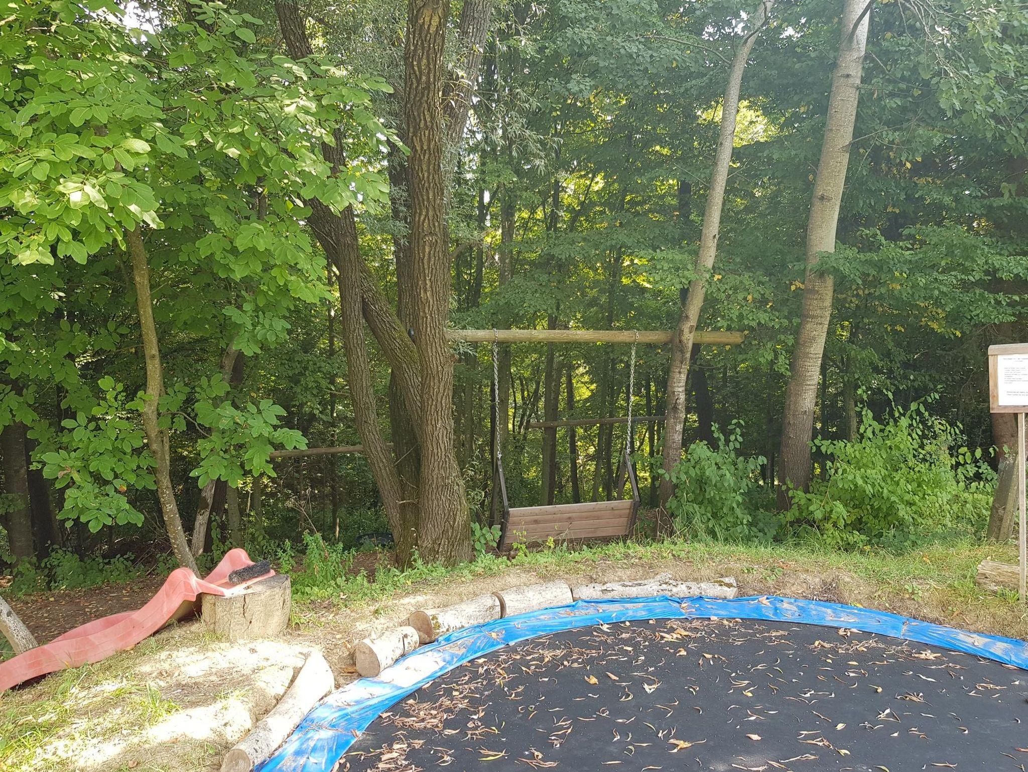 Der angrenzende kleine Wald bietet Entspannung pur beim Waldbaden. Am Waldesrand erfreuen sich Kinder am Trampolin, beim Sandspielen und Schaukeln.