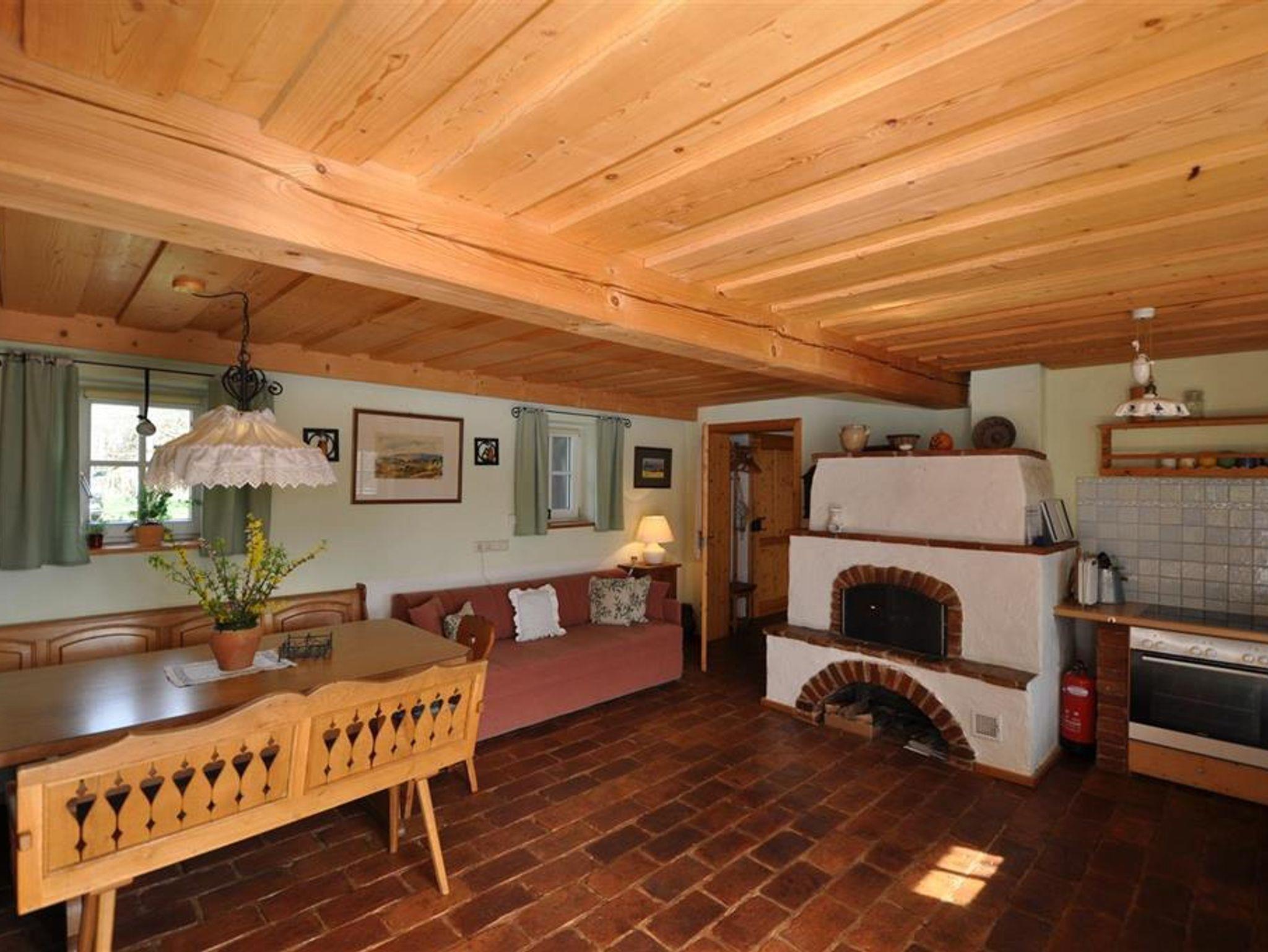 • Eine rustikale Wohnküche mit offenem Kaminfeuer, einer großen Essecke und direktem Ausgang zur Sonnenterrasse
