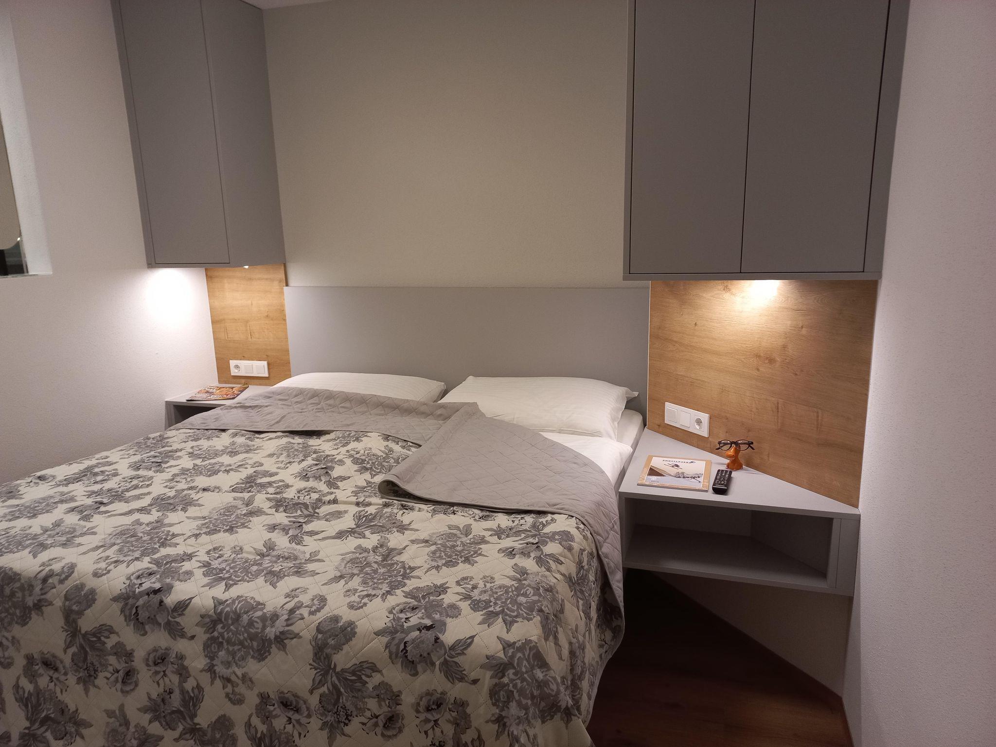 Das Apartment Fisch im ersten Stock bietet auf 48 m² Platz für bis zu 5 Personen. Es verfügt über zwei Schlafzimmer mit Doppelbett sowie einer ausziehbaren Couch für eine weitere Person. Jedes Schlafzimmer hat ein eigenes Badezimmer mit Dusche und WC – perfekt für Komfort und Privatsphäre. Die helle Wohnküche ist mit einem gemütlichen Esstisch sowie einem Balkon ausgestattet und verfügt über eine moderne Küche mit E-Herd, Geschirrspüler, Espressomaschine und Mikrowelle.