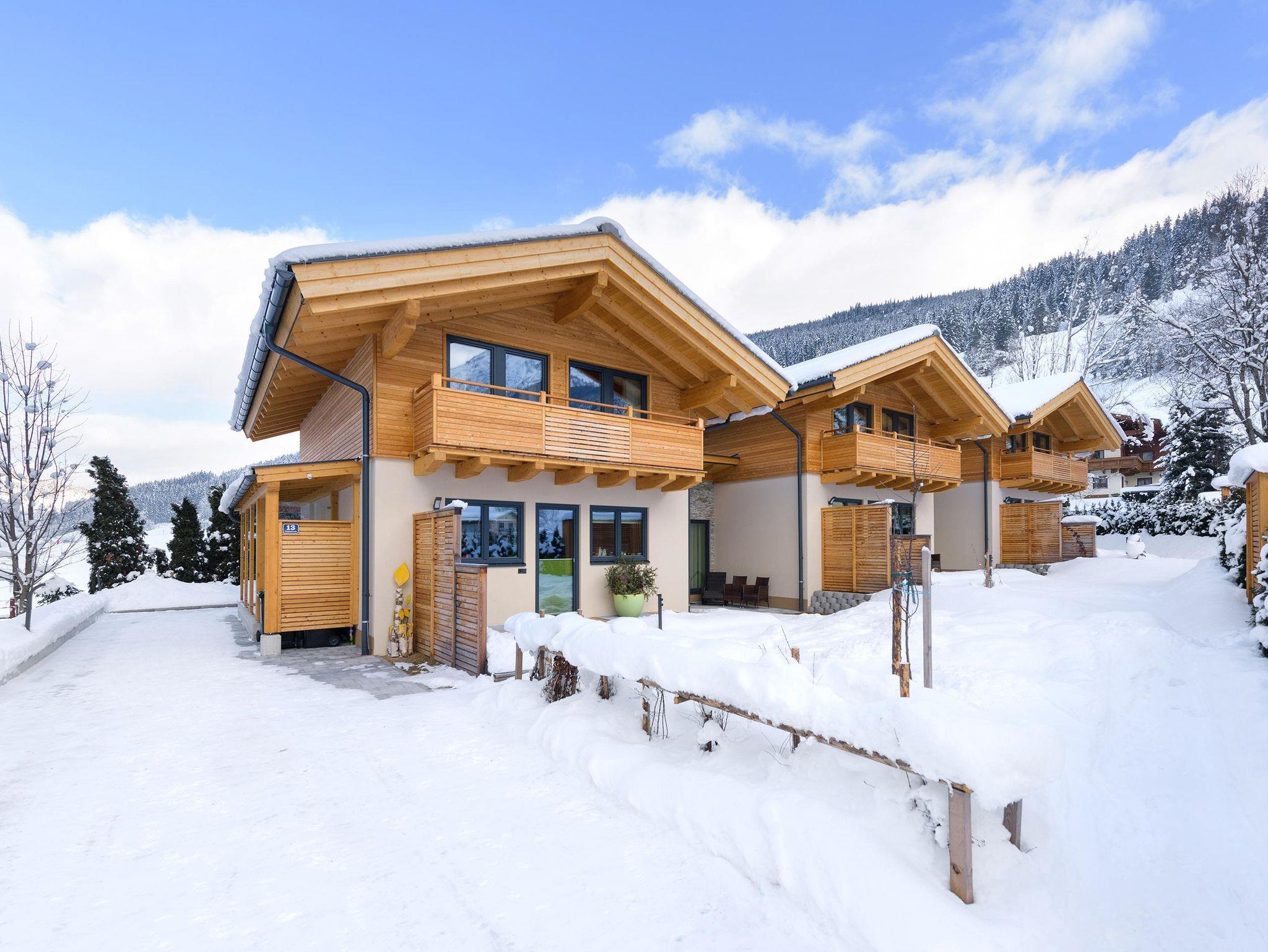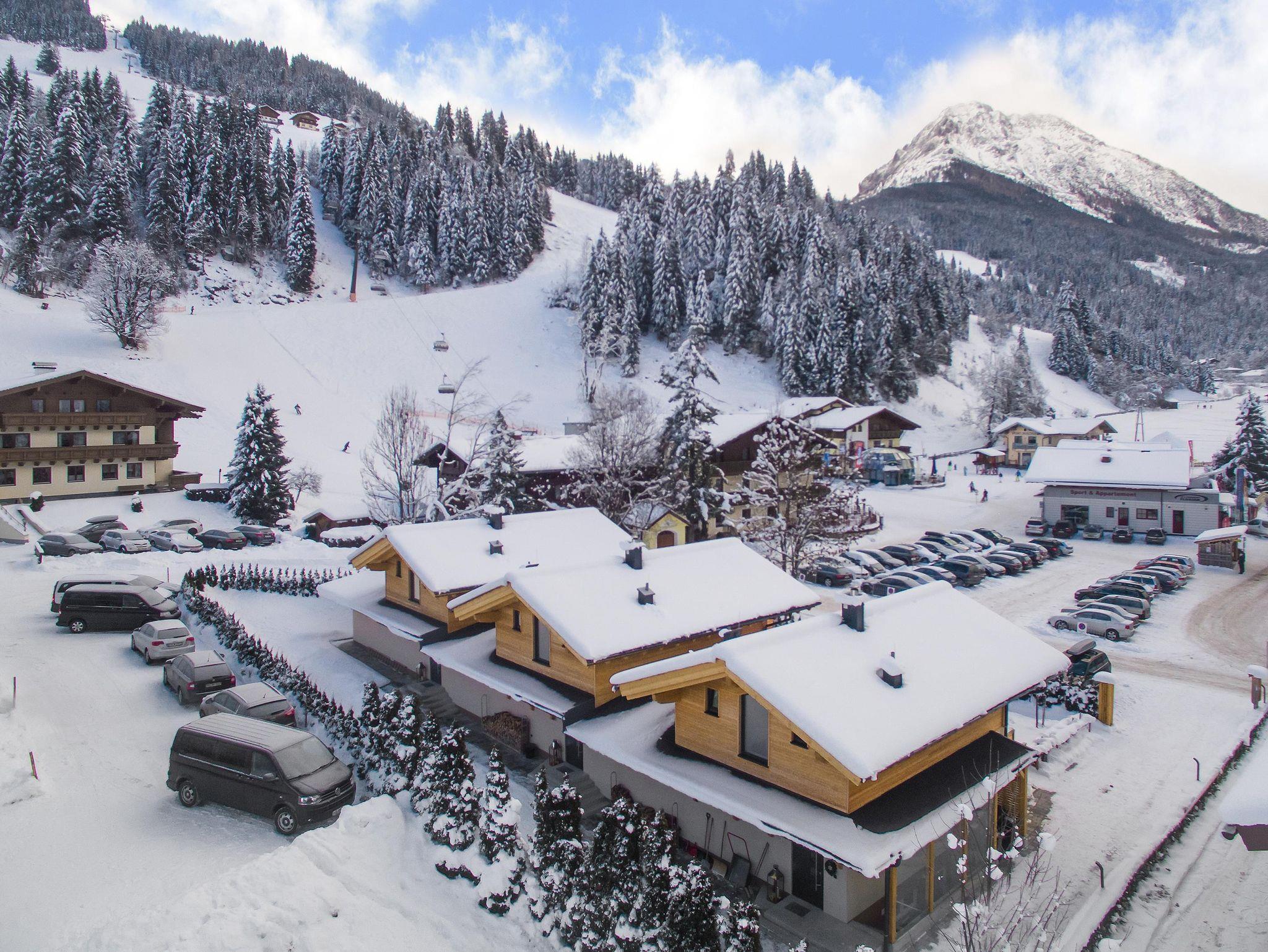 Luxuriöse Holz-Chalets für 4-9 Personen, 3 Schlafzimmer, 3 Badezimmer mit Dusche oder Badewanne, getrenntes WC im EG, voll ausgestattete Küche, Wohnraum mit Kamin, eigene Sauna, Garten und Terrasse, direkt an der Skipiste/Skilift und Übungsgelände... und jede Menge Herzlichkeit.