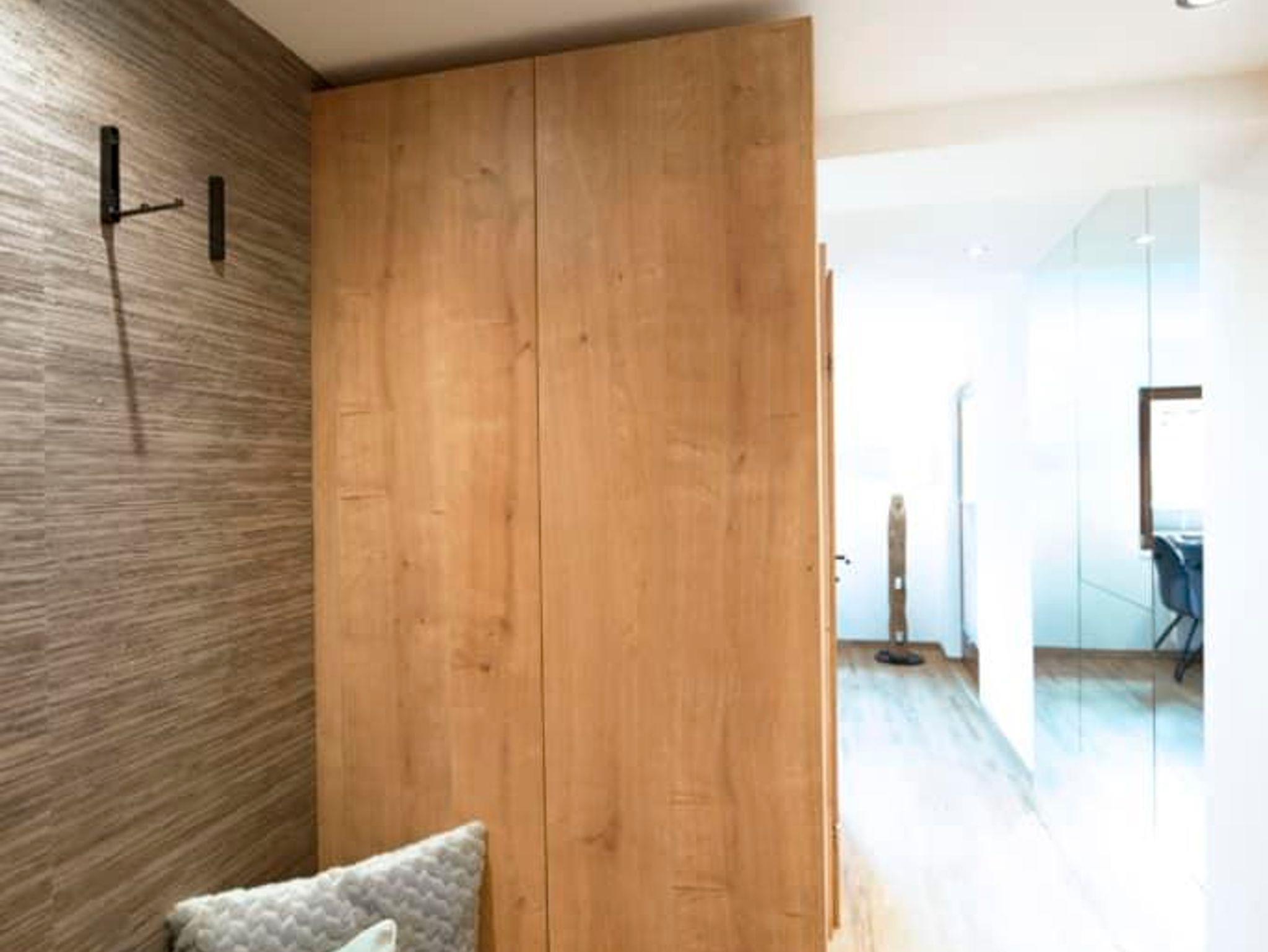 Das Apartment Waage im ersten Stock bietet auf 36 m² Platz für bis zu 4 Personen. Es verfügt über ein Schlafzimmer mit Doppelbett sowie eine Schlafcouch, die ideal für zwei Kinder geeignet ist. Das Schlafzimmer ist mit einem eigenen Badezimmer mit Dusche und WC ausgestattet – für besonderen Komfort und Privatsphäre.