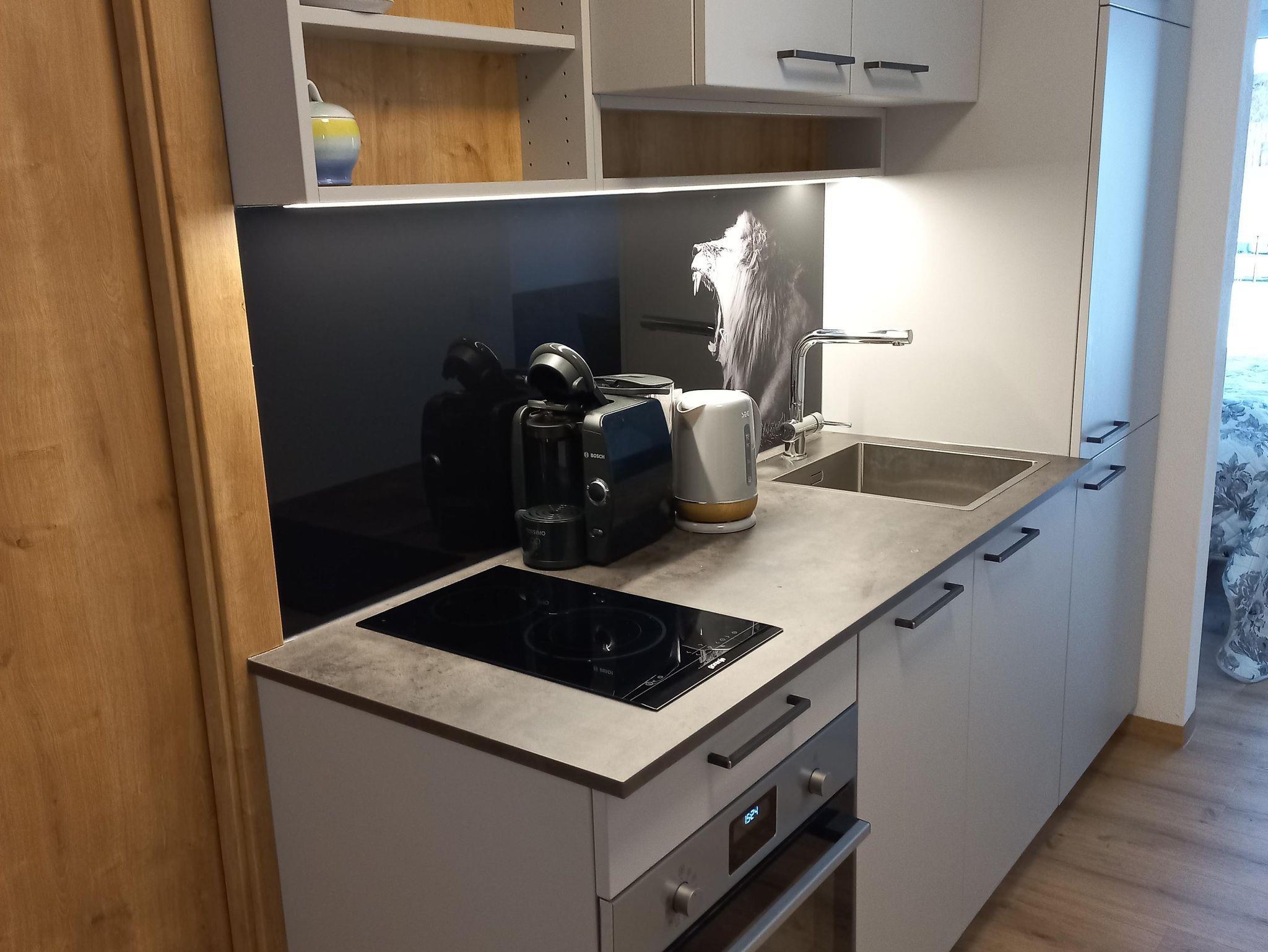 Die helle Wohnküche lädt mit einem gemütlichen Esstisch zum Verweilen ein. Ein Balkon erweitert den Wohnraum ins Freie und bietet frische Bergluft. Die Küche ist bestens ausgestattet – mit E-Herd, Geschirrspüler, Espressomaschine und Mikrowelle.