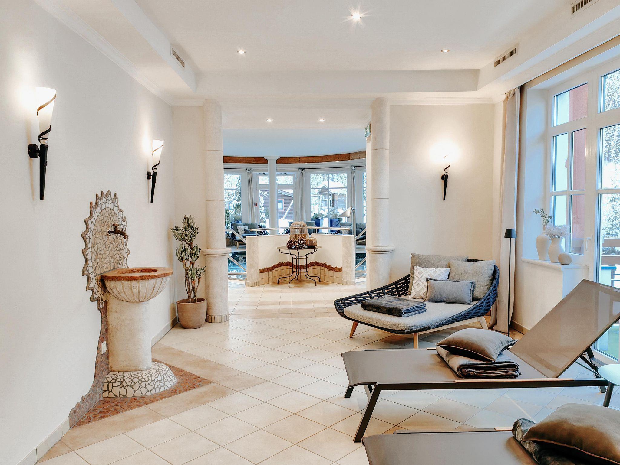 Nach aktiven Tagen heißt es eintauchen & entspannen: in unserer Bade- & Vitalwelt mit Panorama-Hallenbad, Sauna, Dampfbad, Wärmekabine & Teestube. Für kulinarische Genussmomente sorgen das reichhaltige Guten-Morgen-Frühstück, Omas Lieblingskuchen am Nachmittag & regionale Spezialitäten in Partnerbetrieben