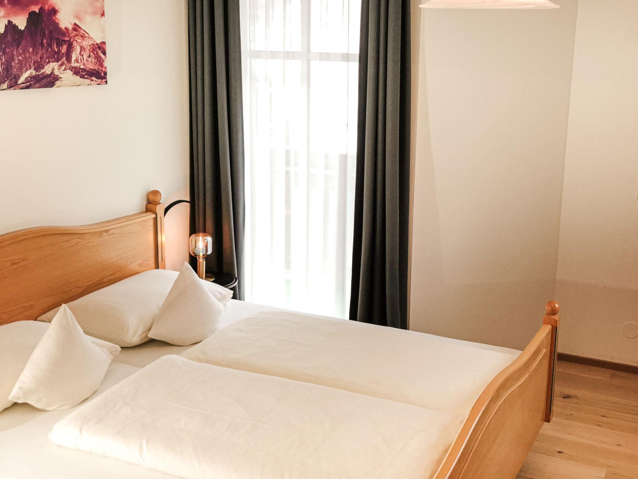 Schlafzimmer (Doppelbett) + Wohnbereich (ausziehbare Couch 2 Pers) optisch getrennt . Flat-Screen-Kabel-TV . Radio . Zimmersafe . Telefon . W-Lan . Großzügiger Südbalkon|-terrasse zum Garten. Bad mit Dusche . Sep Toilette . Haarföhn . Kosmetikspiegel