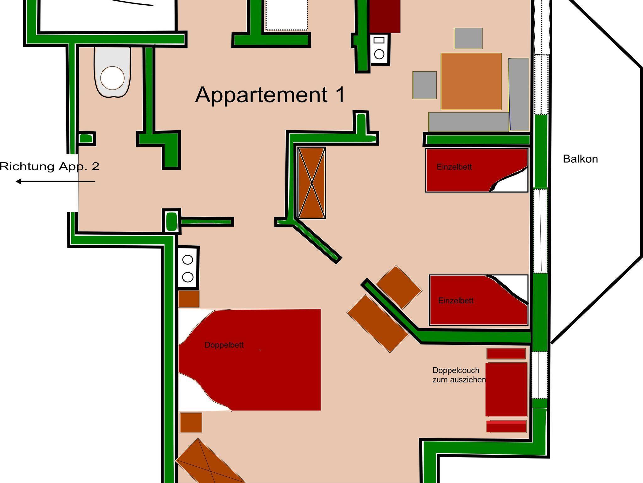 Dieses und das 2. App. sind besonders geeignet für befreundete Familien, es wohnen sonst keine Gäste auf dieser Etage.