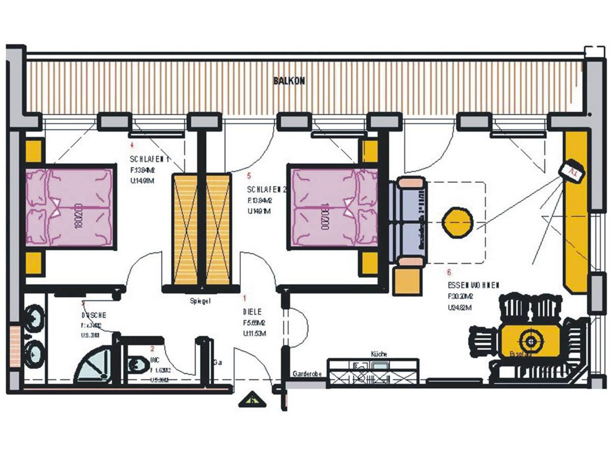 3-Zimmer-Appartement mit 69,50 m²,für 1-6 Personen, im 1. Obergeschoss, mit Blick auf das Rofangebirge und auf das Kaisergebirge, Fenster: Nord/Ost, Balkon: Nord Austattung: 2 Doppelbettzimmer, 1 Sofa im Wohnbereich - zum Ausziehen als Doppelbett verwendbar, Kochnische und gemütliche Eckbank, Bad: Dusche und Doppelwaschbecken; WC extra, Vorraum; inkl. Bettwäsche.