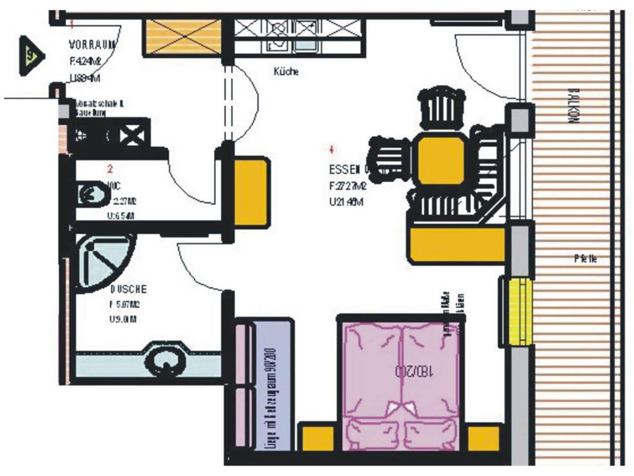 1-Zimmer-Appartement für 1-3 Personen mit 37,01 m², im 2. Obergeschoss, mit Blick auf das Kaisergebirge, Fenster und Balkon: Ost Schlafbereich mit 1 Doppelbett und 1 Einzelbett, Wohnbereich mit gemütlicher Eckbank und Kochnische, Bad: Dusche und Waschbecken, WC extra, Vorraum; inkl. Bettwäsche.
