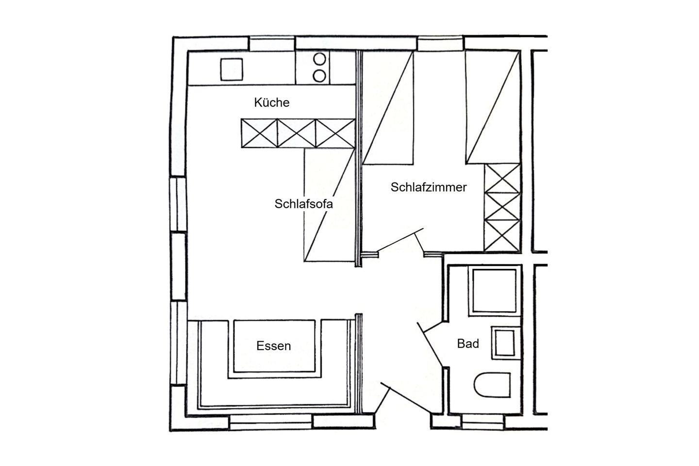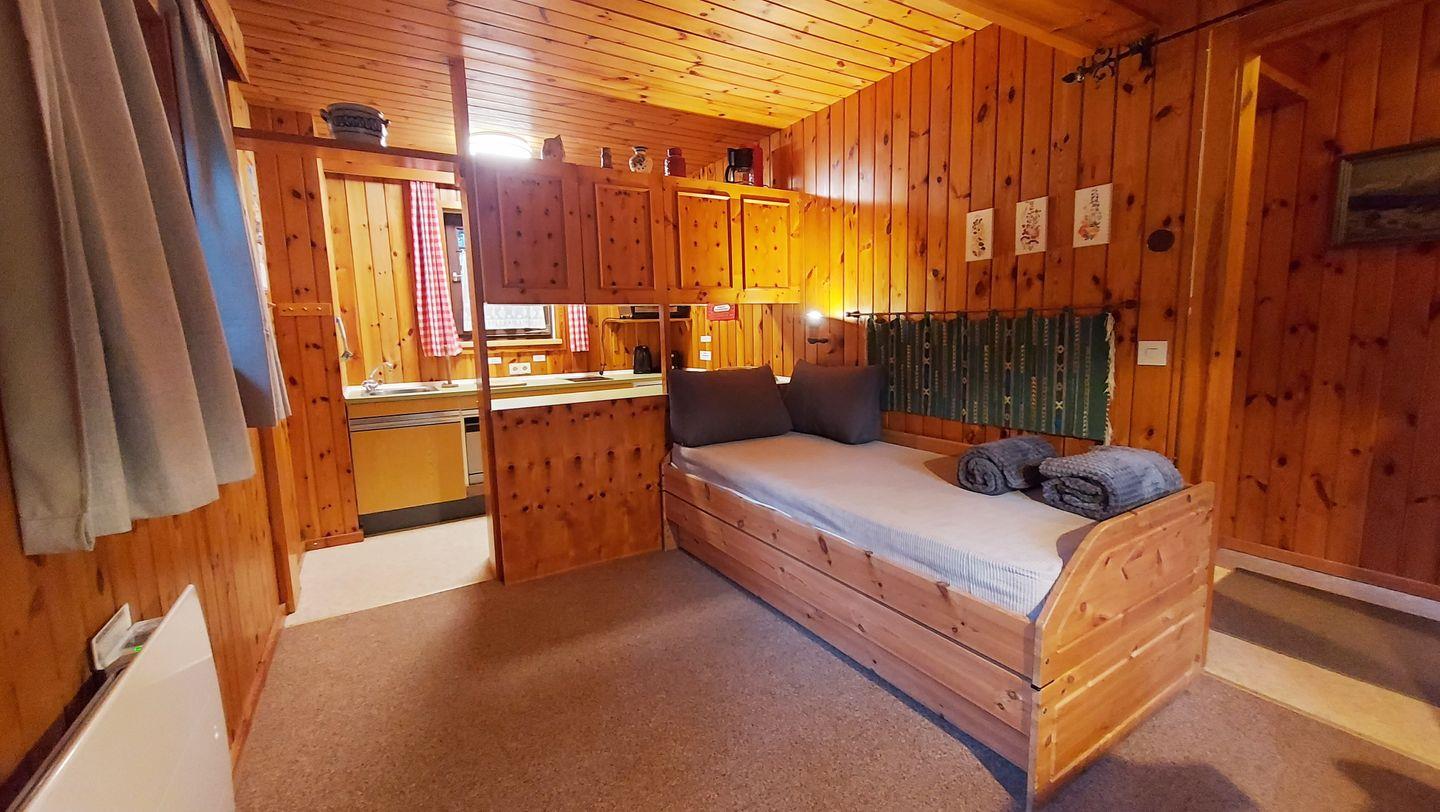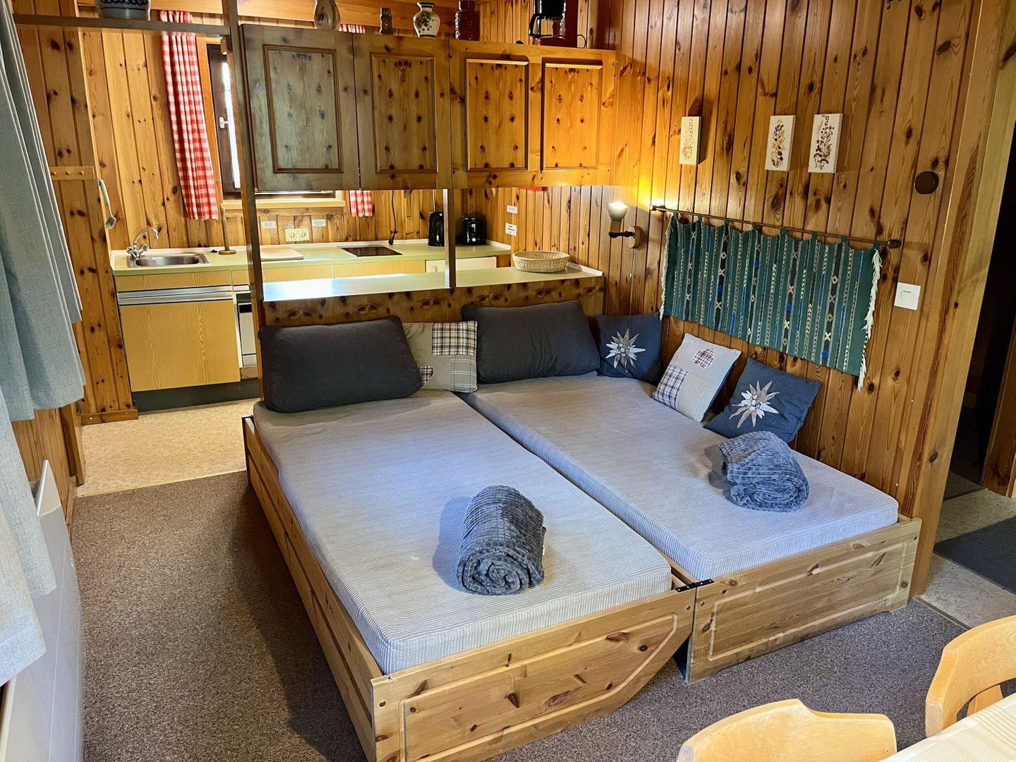 Ein Schlafzimmer für 2 Personen, Ausklappbett für 2 Personen im Wohnraum.