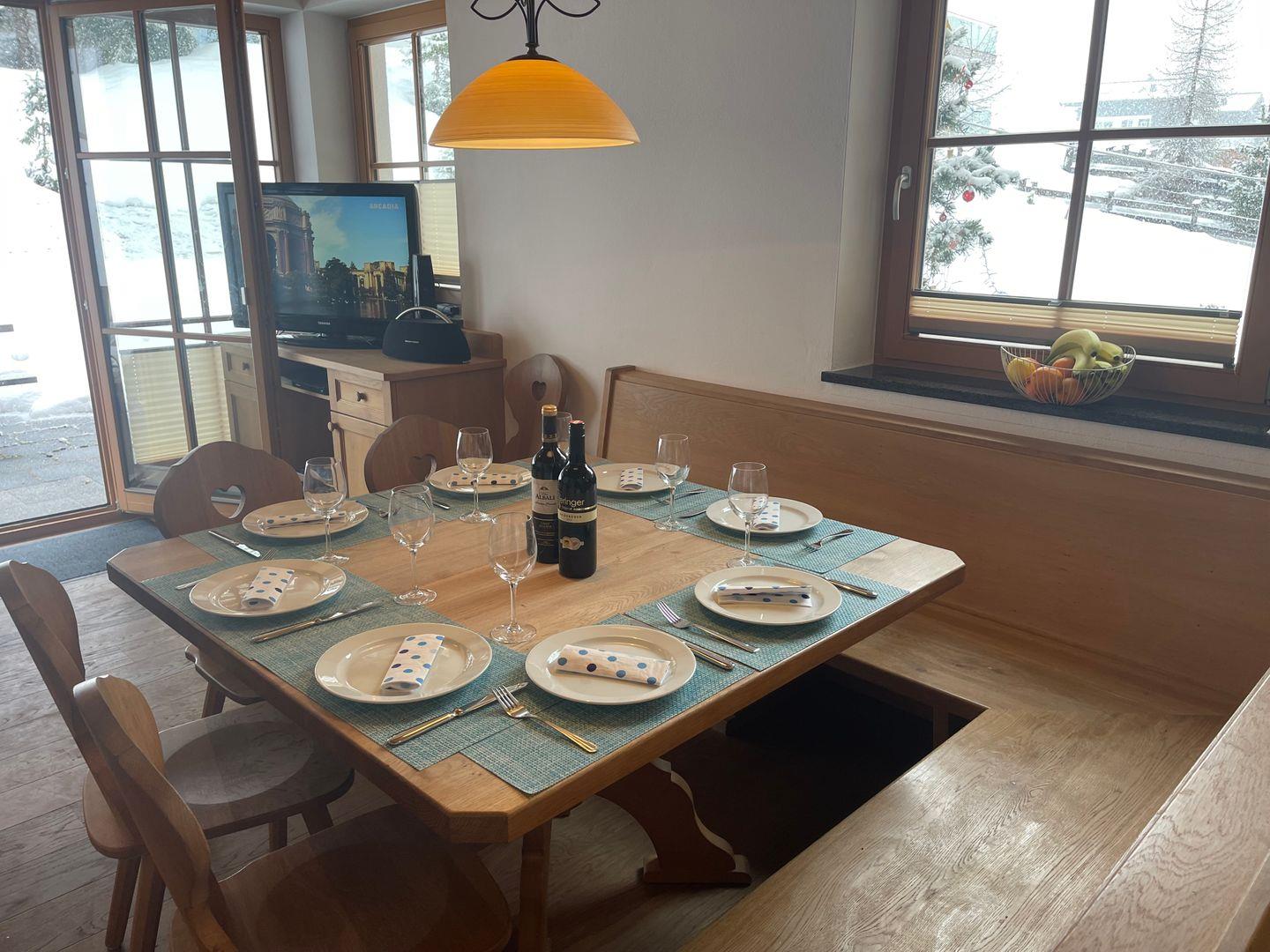 Die ortstypisch in Holz gehaltene Wohnung ist ausgestattet mit gemütlichen Sitzmöglichkeiten und verfügt über eine herrliche Südterrasse welche zu kleinen Ski-Pausen bei einem erholsamen Snack in der Sonne einlädt.