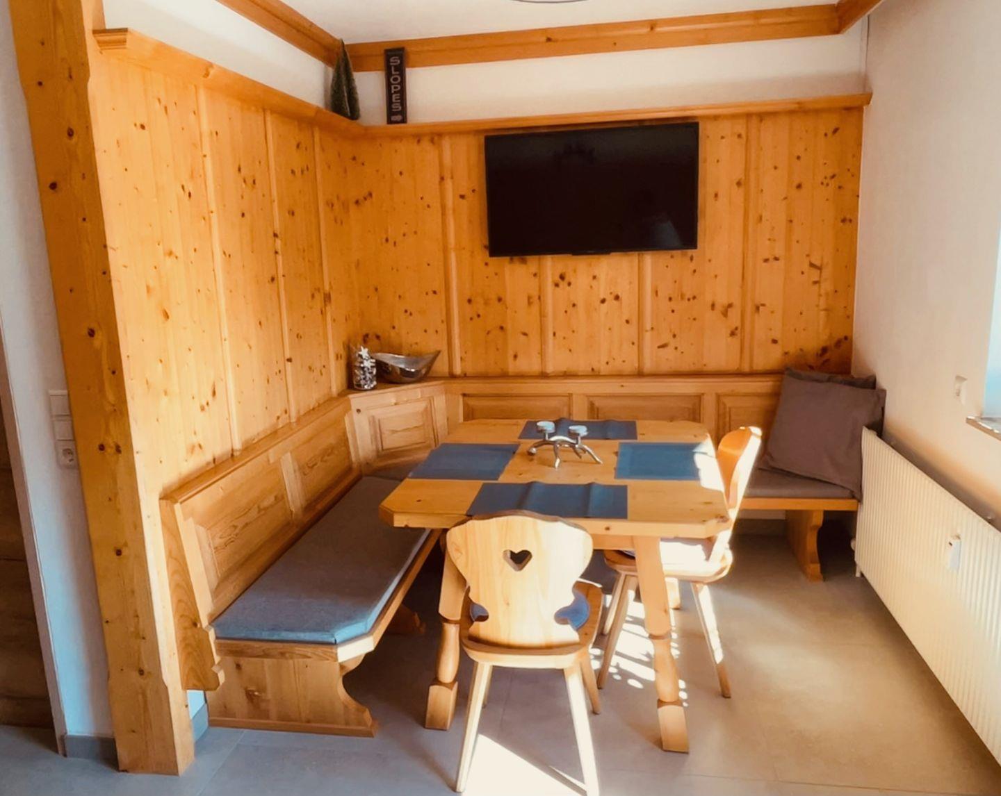 Das Apartment verfügt über eine offene voll ausgestattete Wohnküche mit neuer Essecke und einem Flachbild-TV.