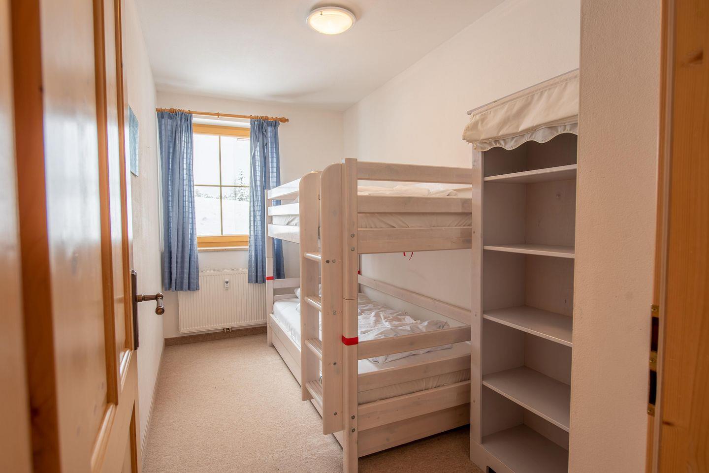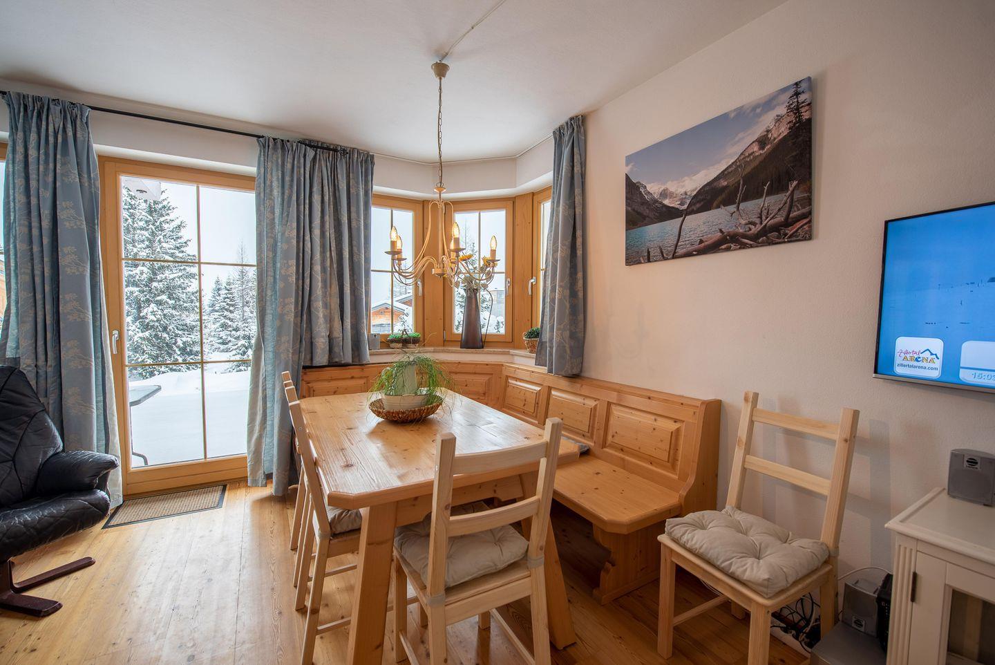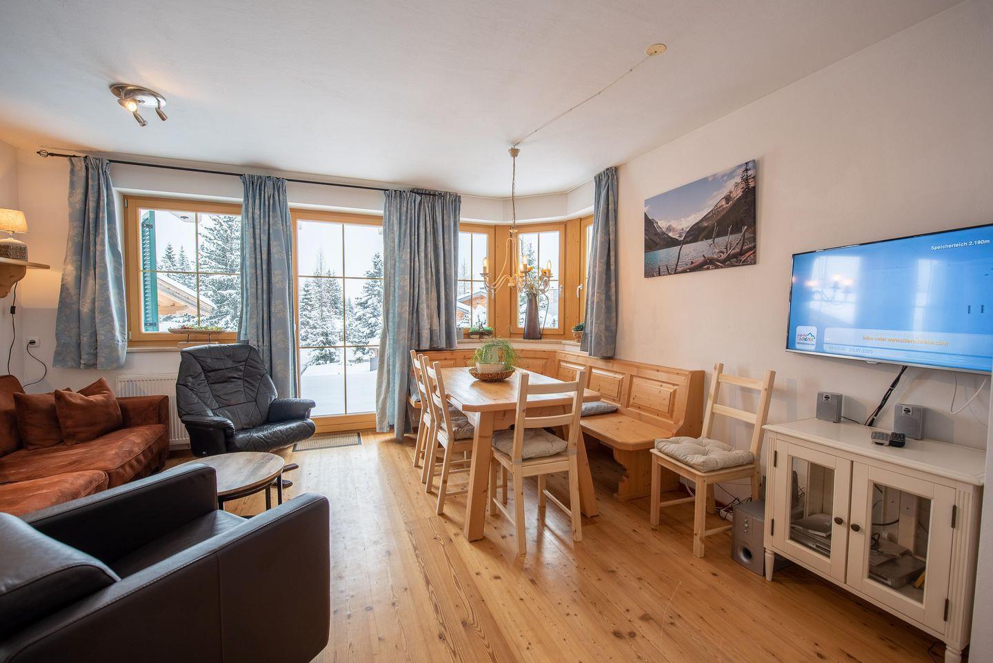Die helle Wohn-Küche mit vielen Fenstern schafft einen schönen Rundum-Blick und ergibt zusammen mit dem Balkon zum Sonne tanken auch außerhalb der Skisaison eine attraktive Unterkunft für Urlaub mit der Familie oder Freunden.