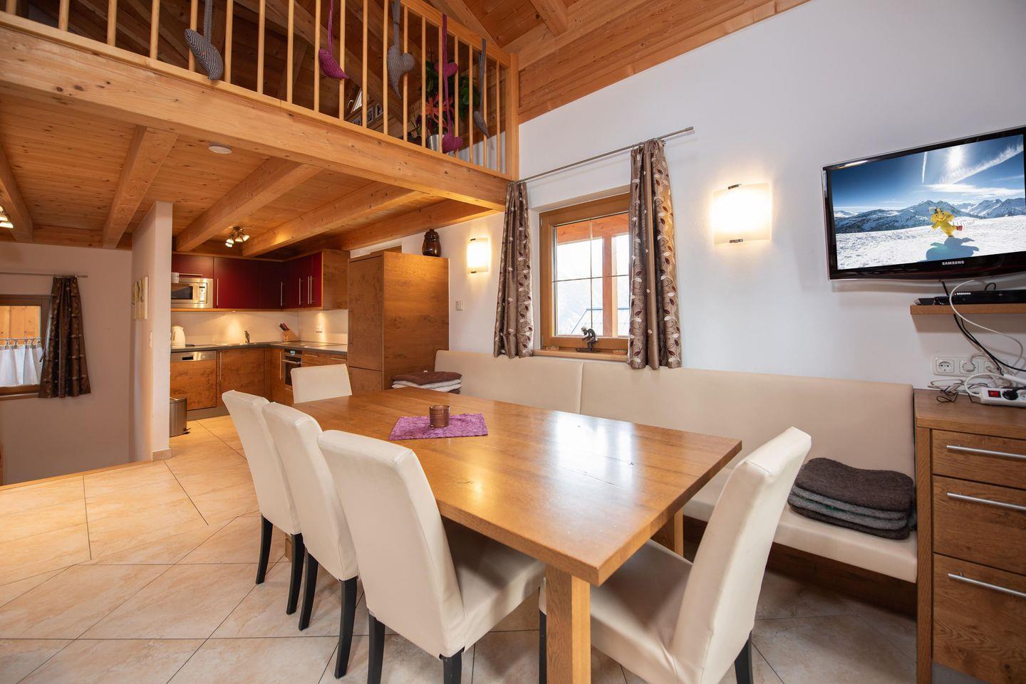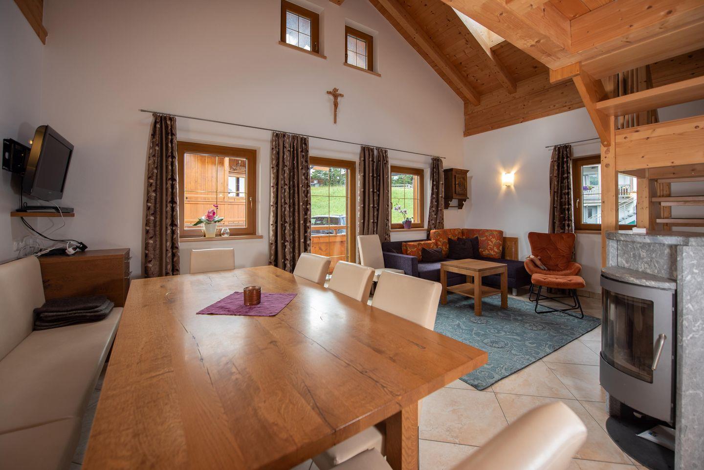 Mit einem heißen Glühwein oder einer Tasse Tee in der Hand genießen Sie erholsame Nachmittage auf dem sonnigen Balkon mit Blick in die Berge. Für gemütliche Hüttenabende verfügt die Unterkunft über einen großzügigen Wohn-Essbereich mit Kachelofen. Wer ein bisschen mehr Abwechslung sucht, findet in der näheren Umgebung Restaurants wie auch Apres Ski Lokale, die bestimmt eine passende Alternative anbieten.