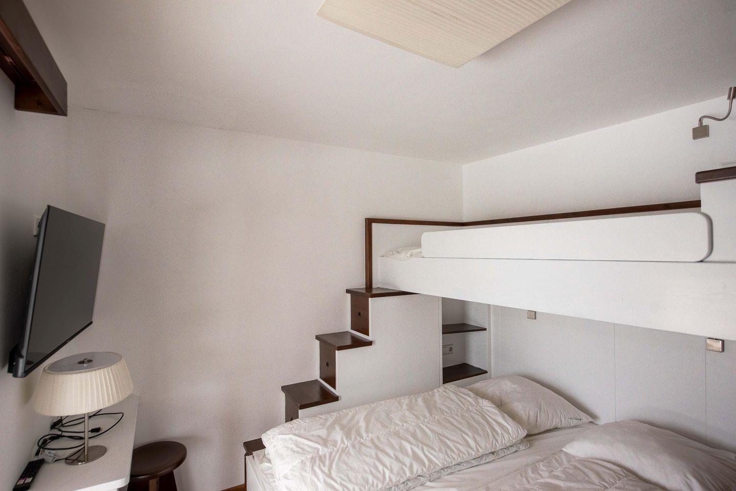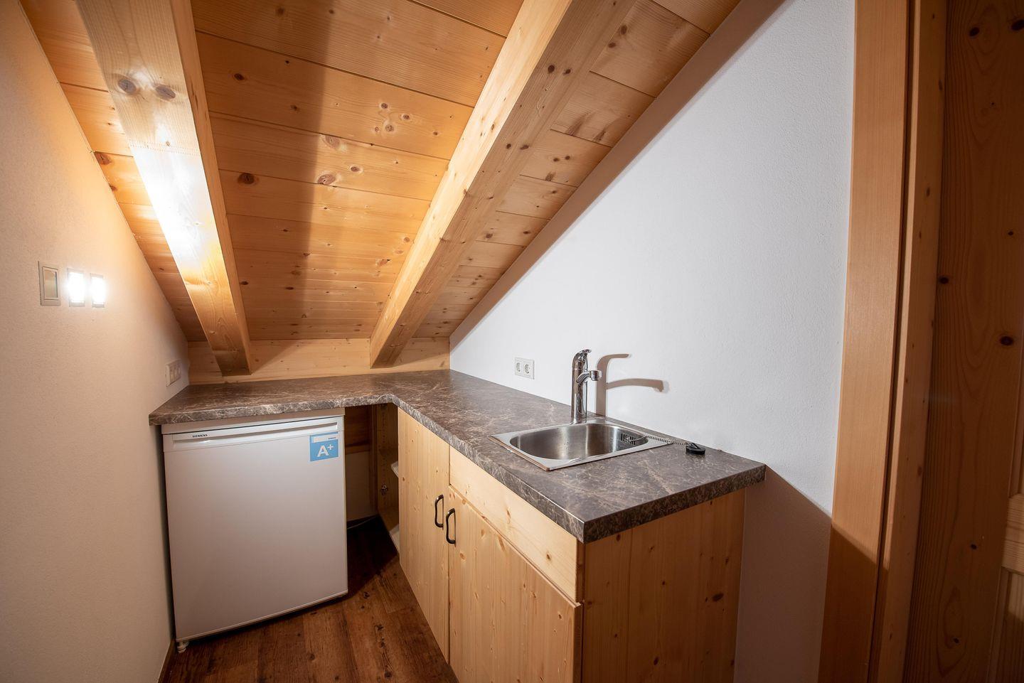 Galeriegeschoss 2: kleine Küche mit Kühlschrank und Spüle, ein Schlafzimmer mit vier Einzelbetten, ein Schlafzimmer mit 2 Schlafsofas (1,20m) und TV;