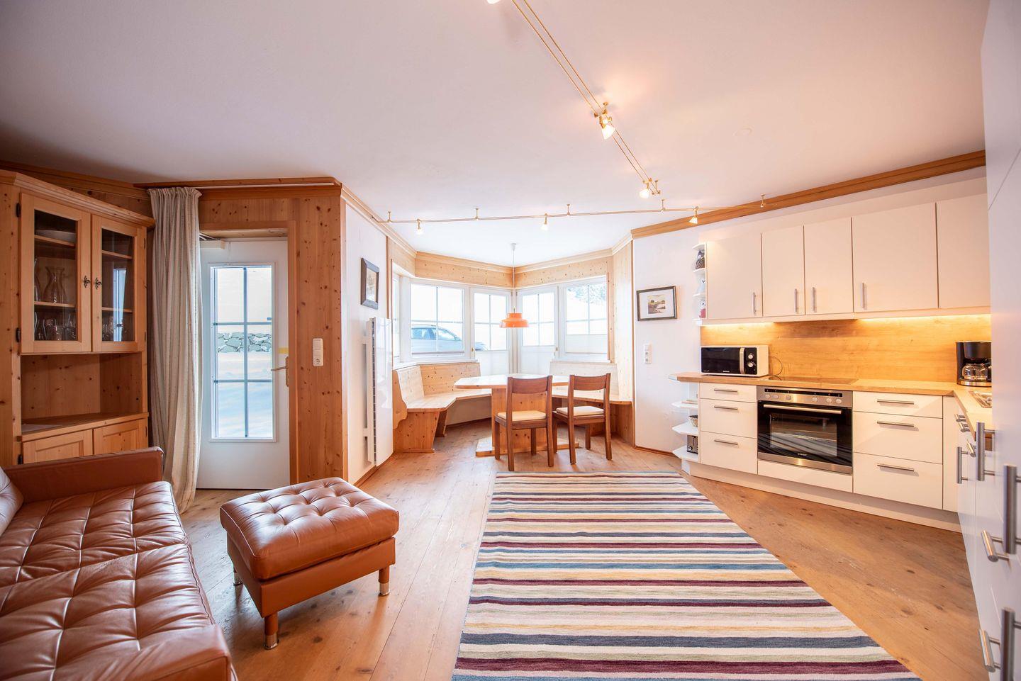 Nicht nur die Lage, auch die Innenausstattung der Ferienwohnung kann überzeugen. Der mit viel Holz ausgestattete Wohnraum verfügt über einen sehr gemütlichen Sitz- und Couchbereich, der zu weit mehr als nur kurzem Sitzen und Essen einlädt.