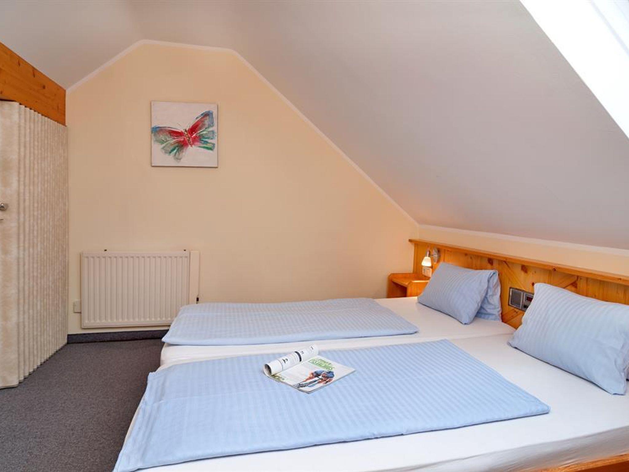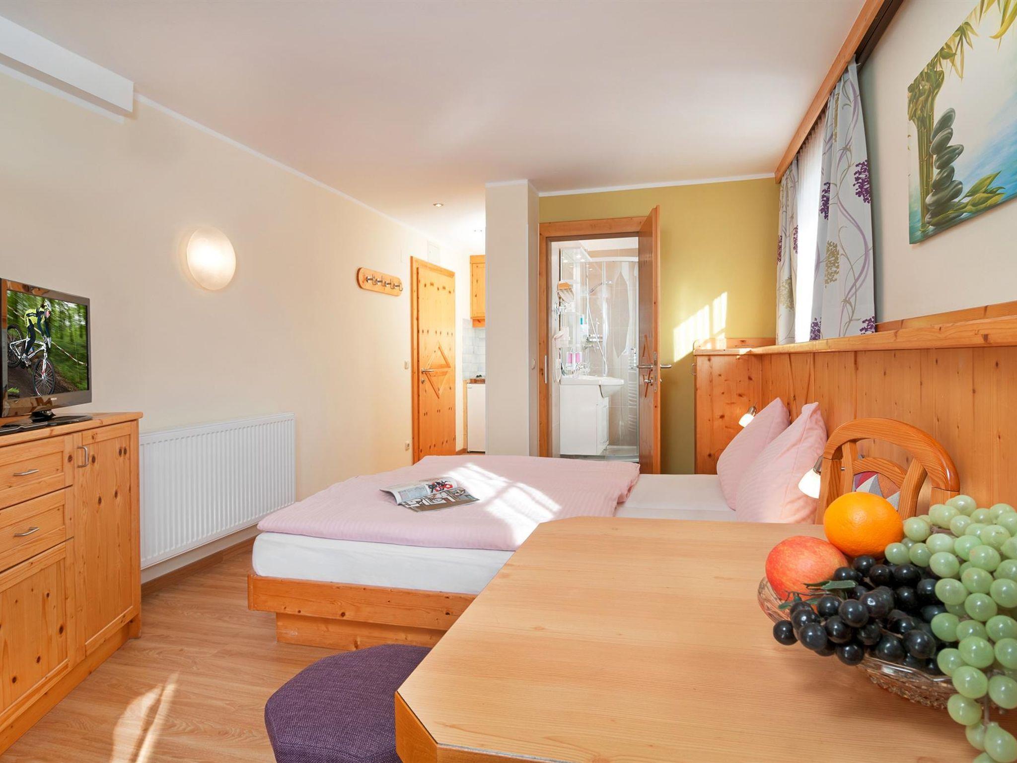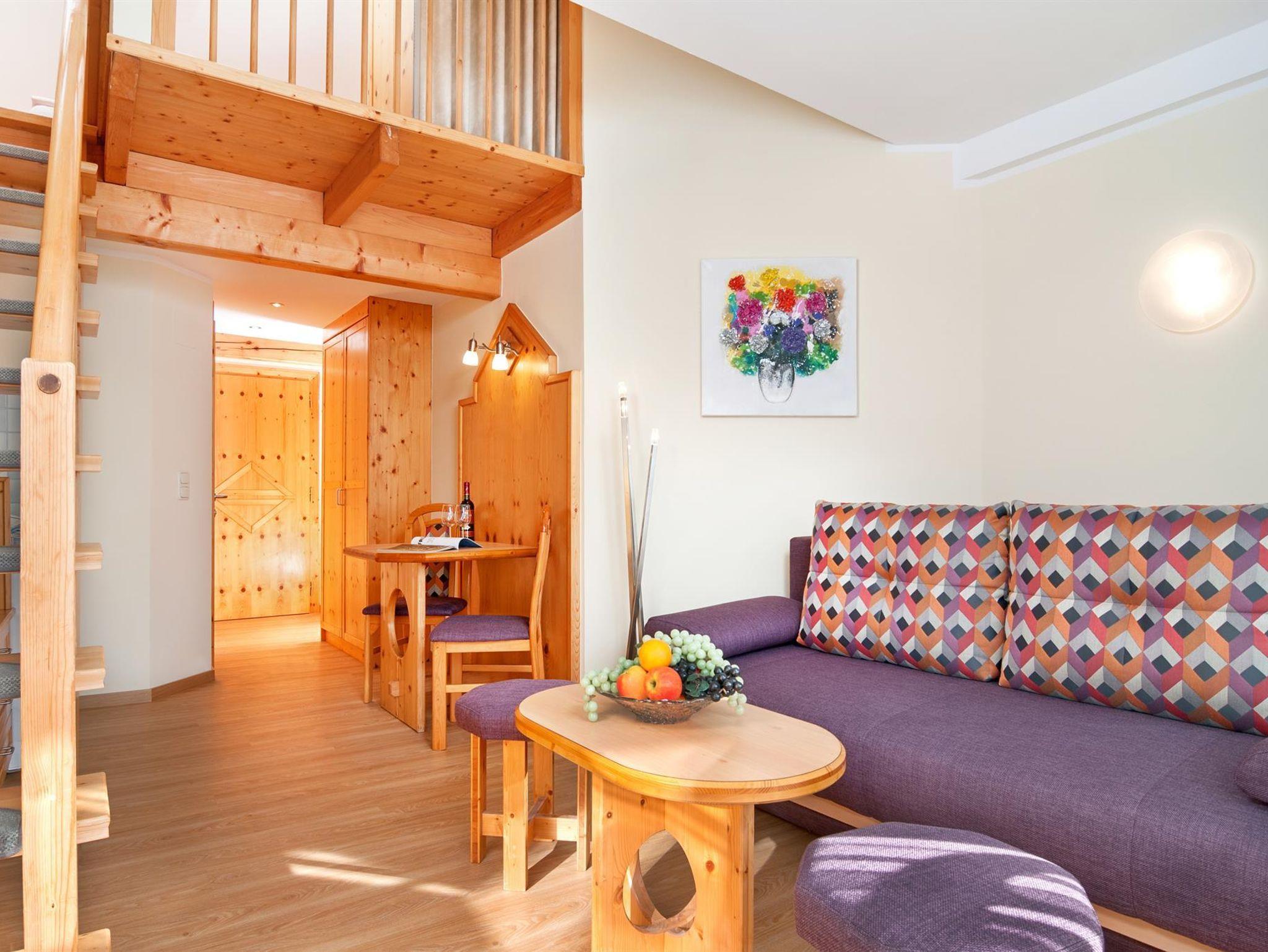 2-Zimmer-Wohnung für 2-4 Personen,1 Doppelzimmer (Empore) + 1 Wohn/Schlafraum mit Doppel-Ausziehcouch, Eßecke teilweise mit Sitzbank, Kochnische mit Kühlschrank und Kaffeemaschine, Südbalkon, Du/WC (getrennt), Radio, SAT-TV, Hotelsafe, Telefon.