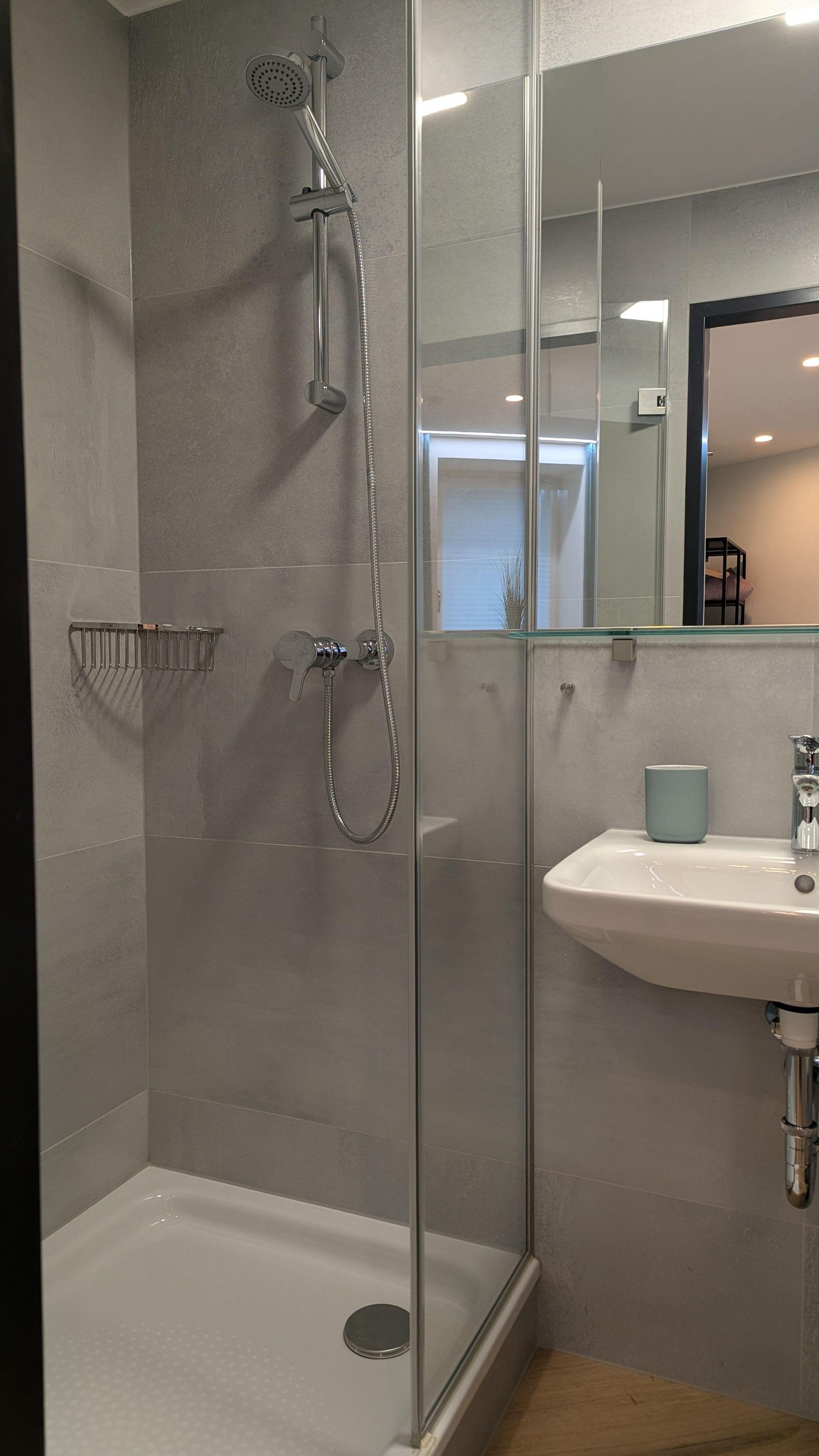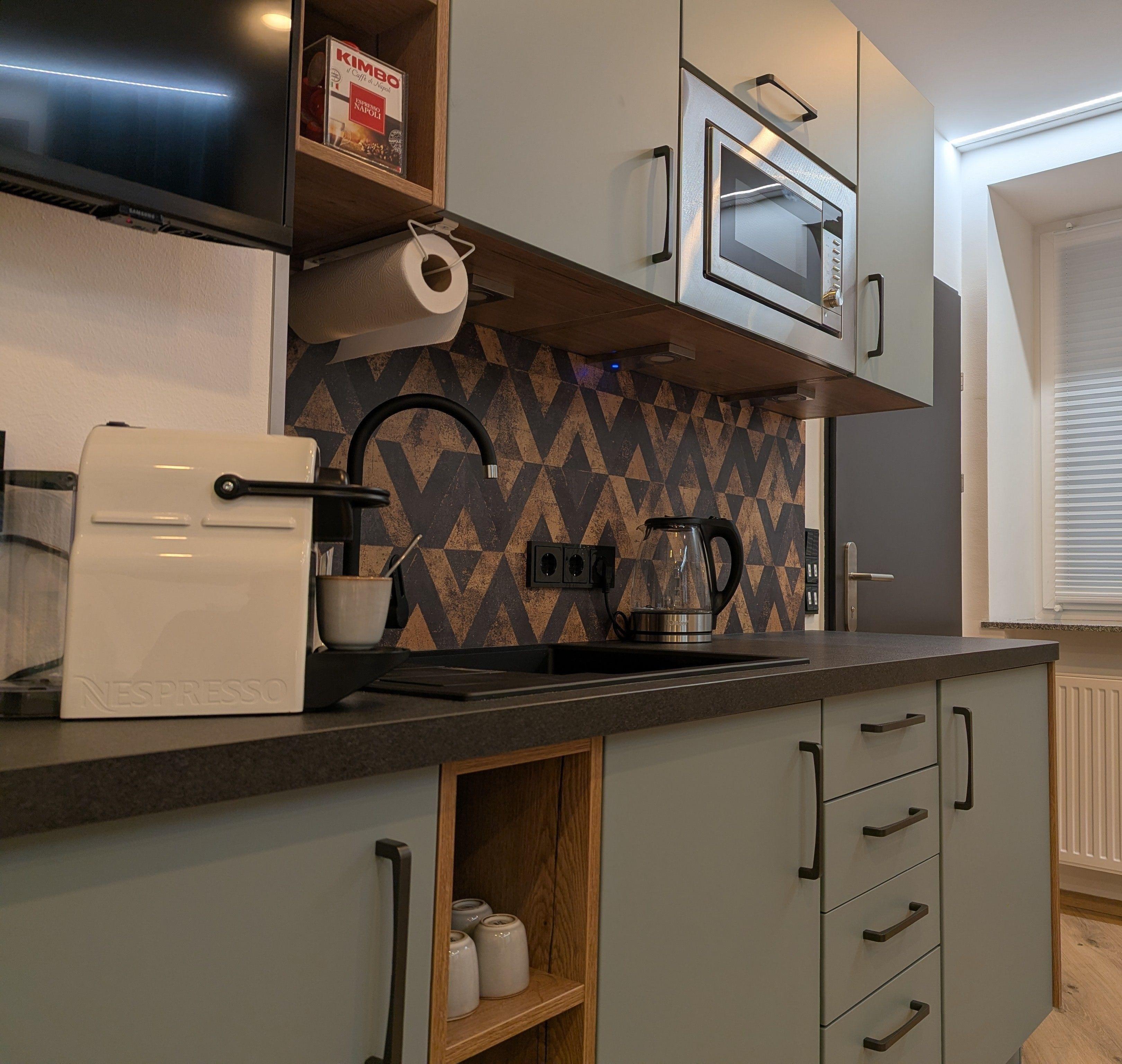 Doppelbett (Boxspringbett 200 x 180 cm), Badezimmer mit geräumiger Dusche inklusive Duschgel und Shampoo, Handtücher und Föhn, Smart-TV, kleine Küche mit Mikrowelle, Induktions-Kochplatte, Wasserkocher, Kühlschrank, Toaster, Nespresso Kaffeemaschine und jede Menge Tee und Kaffee.