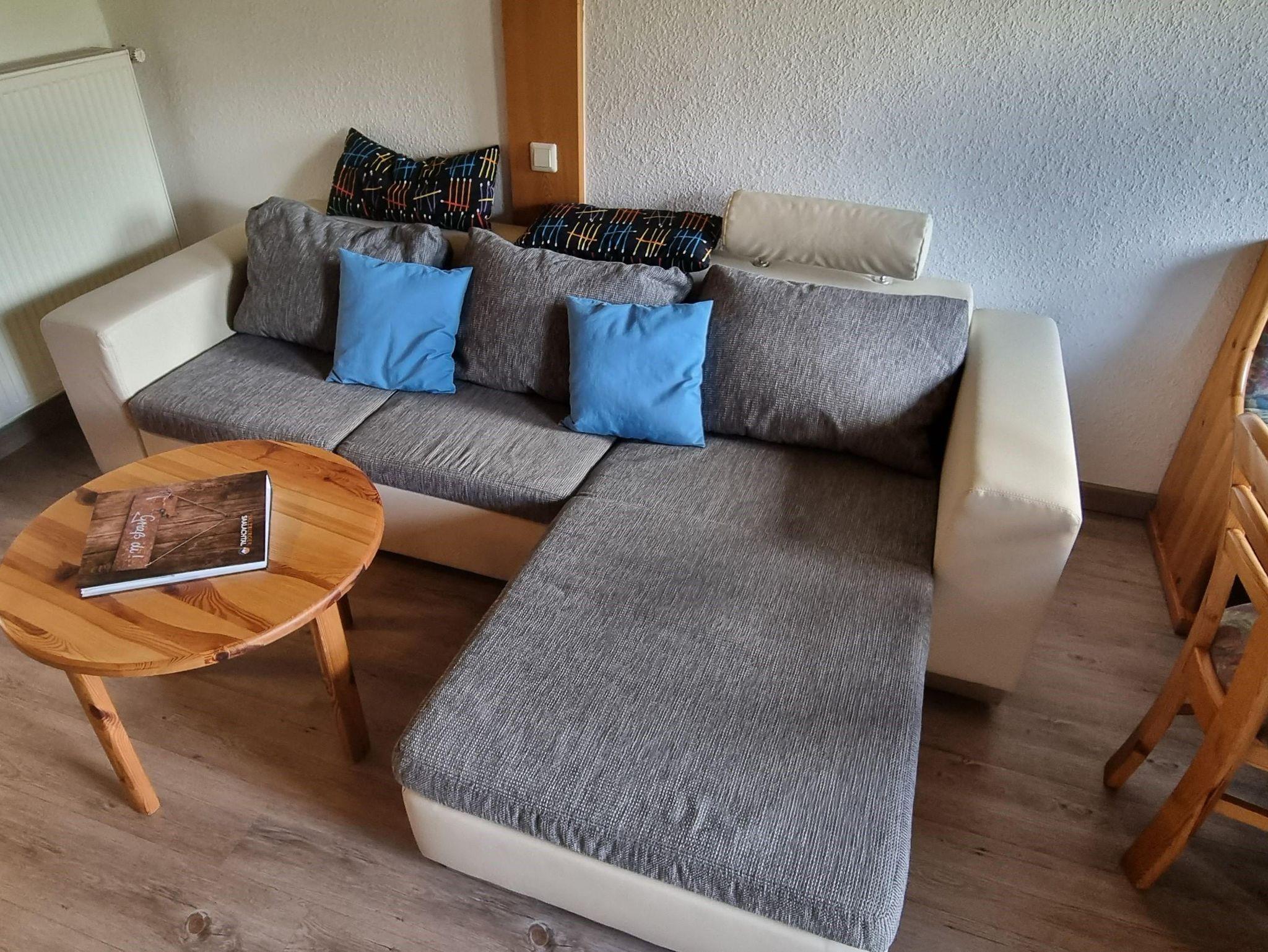 Ferienwohnung (ca. 50 m²) mit geräumiger Wohnküche mit Küchenzeile, Couch und Sitzecke, voll ausgestattet Küche mit Geschirrspüler, 1 Schlafzimmern mit Doppelbtett und Badezimmer (Dusche, WC), 1 Schlafzimmer mit 2 getrennten Betten und Badezimmer (Dusche und WC), Radio und Sat-TV, 2 Balkone