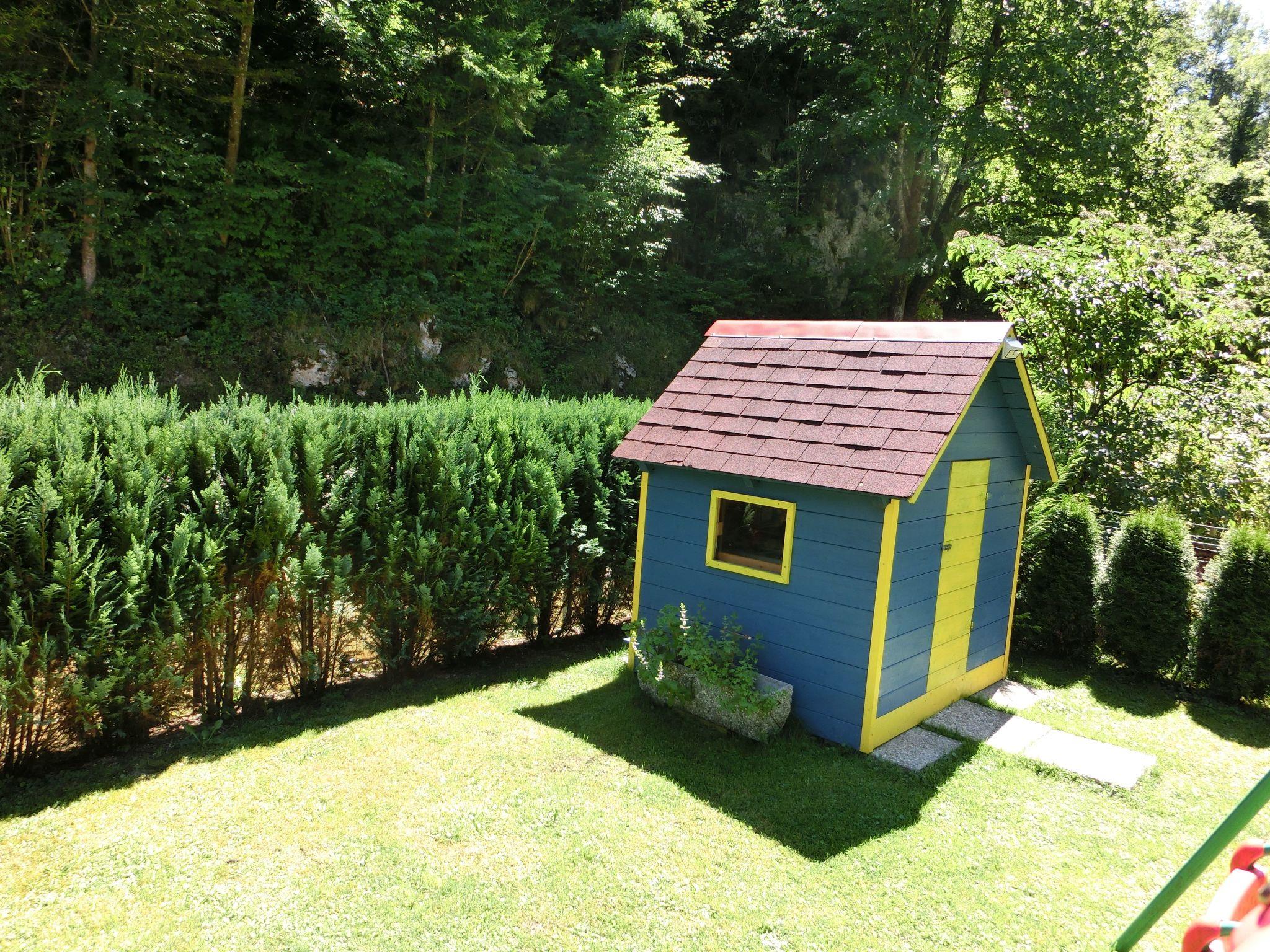 There is a terrace. The fully fenced outdoor area borders a little stream. A grill area, a fireplace, a Wendy house and children’s play equipment are available. The site is accessed via a bridge and has plenty of parking space.